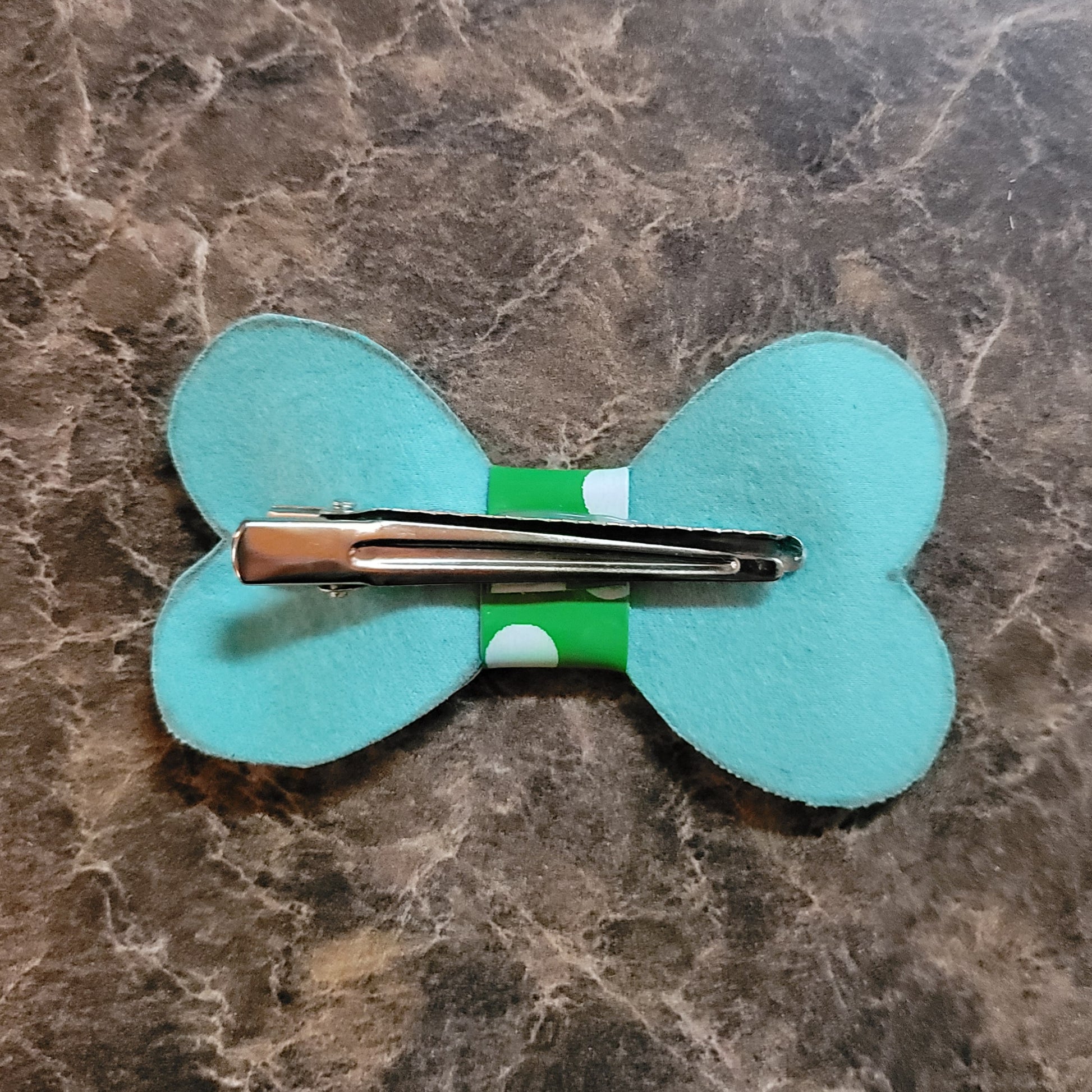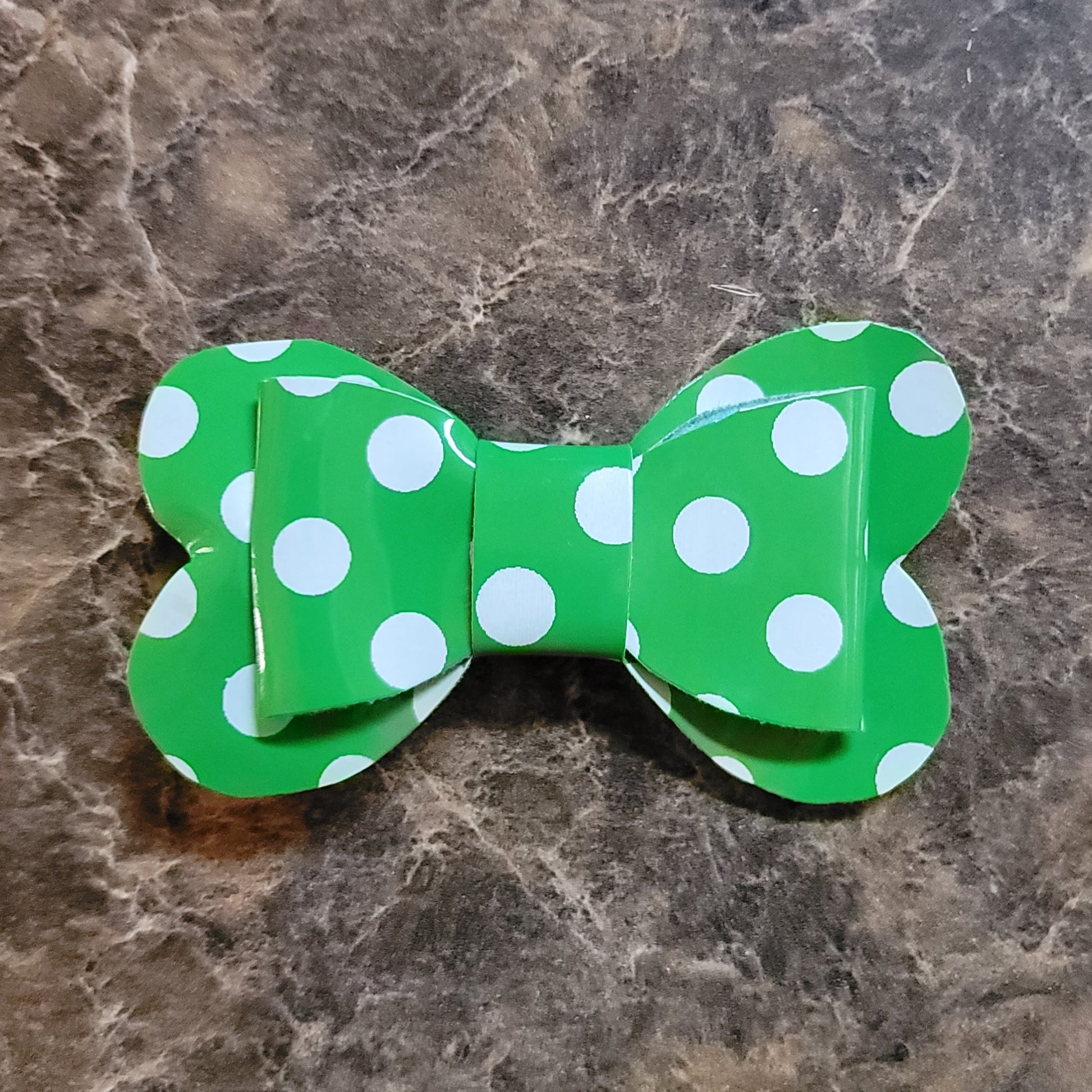 Green & white polka dot vinyl material with soft backing. Bow secured on an alligator clip.