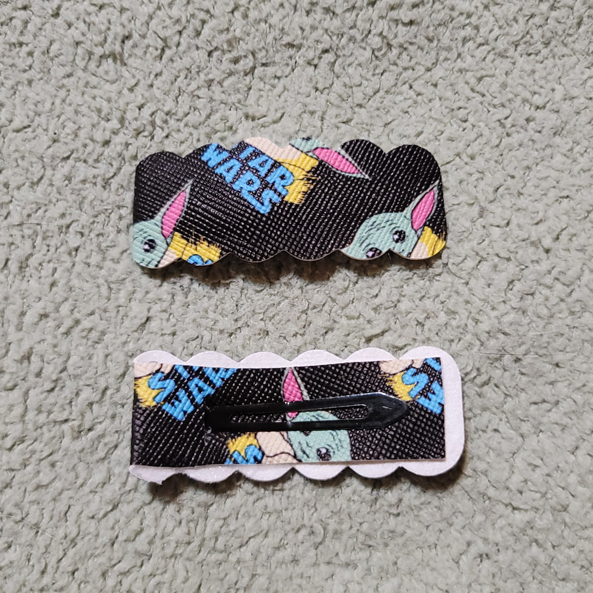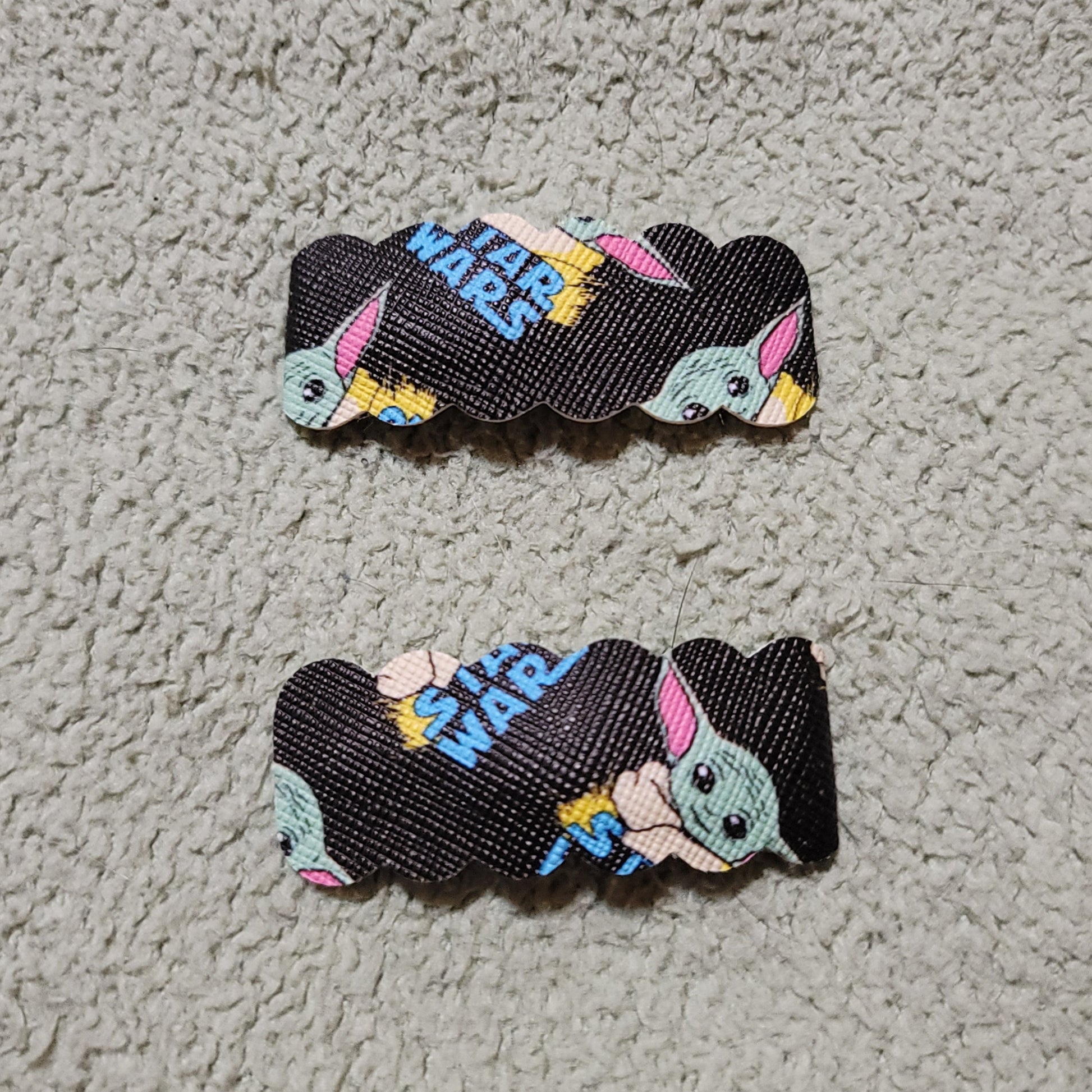 Grogu Star Wars print faux leather. Secured on 2 inch snap clips.