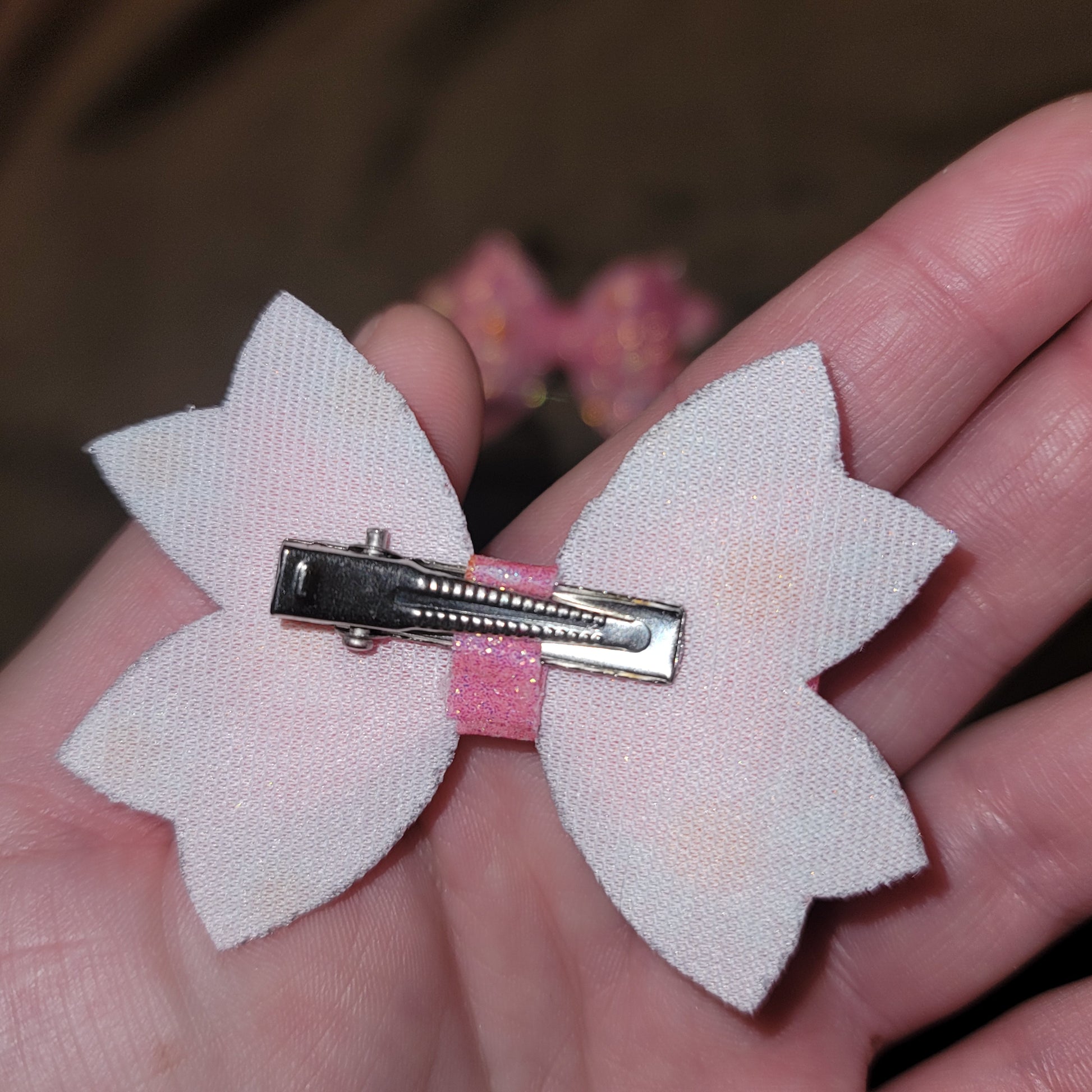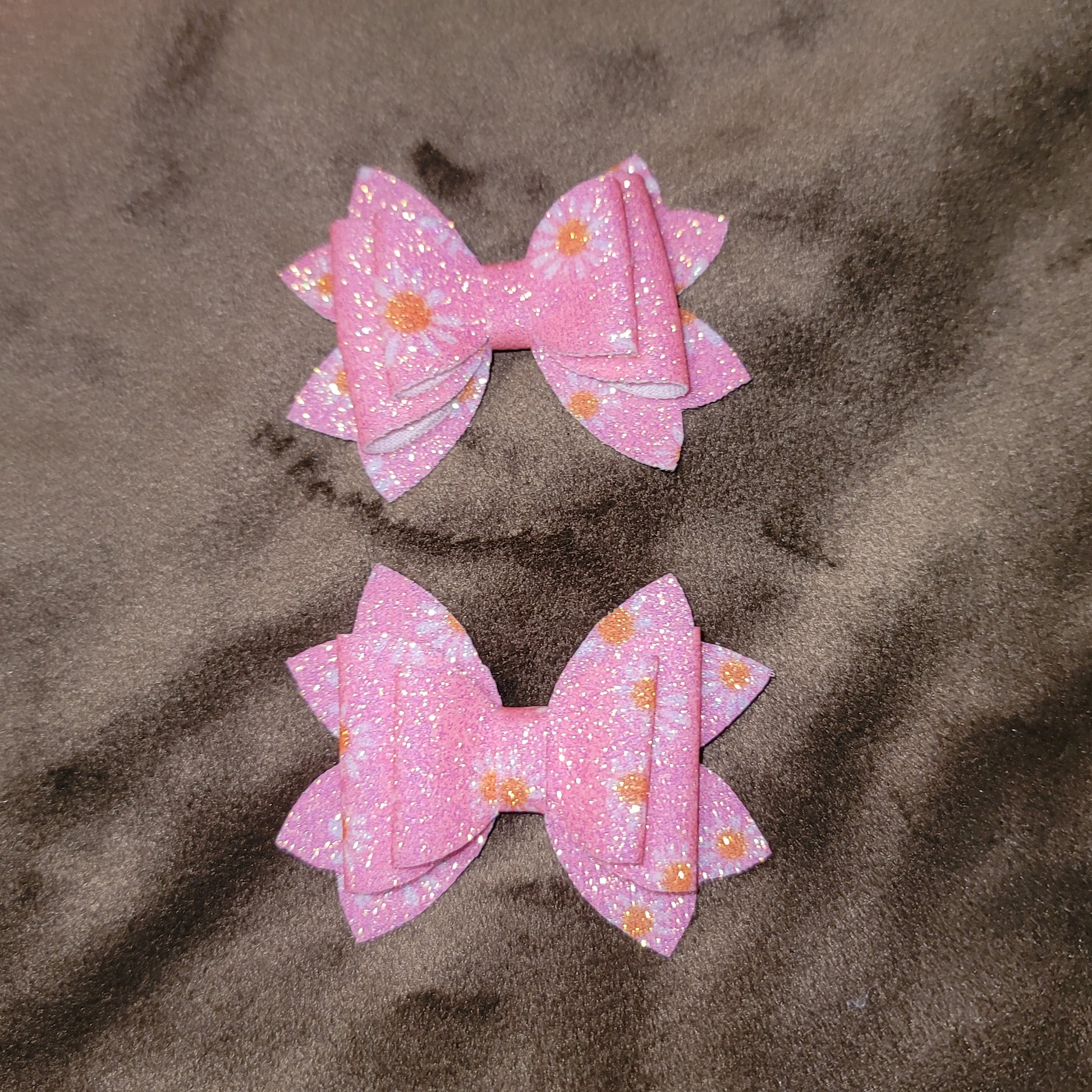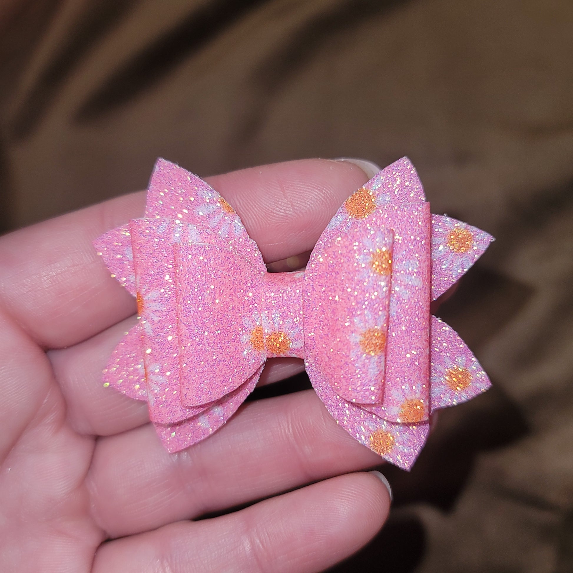 Hot pink daisy print glitter material. 2.5 inch Lou Lou style bows. Secured on an alligator clip.