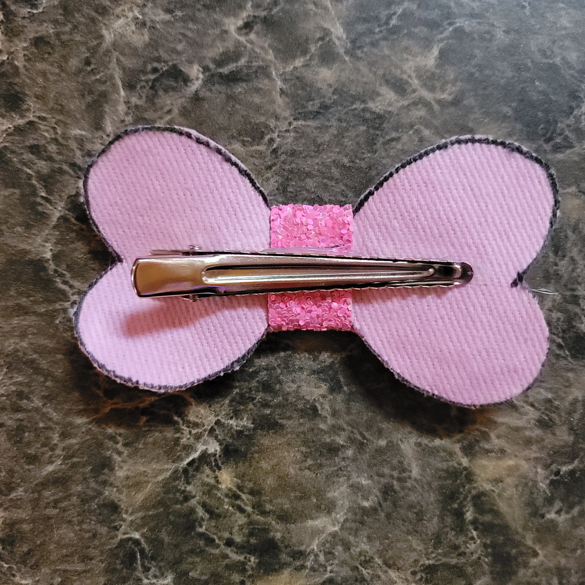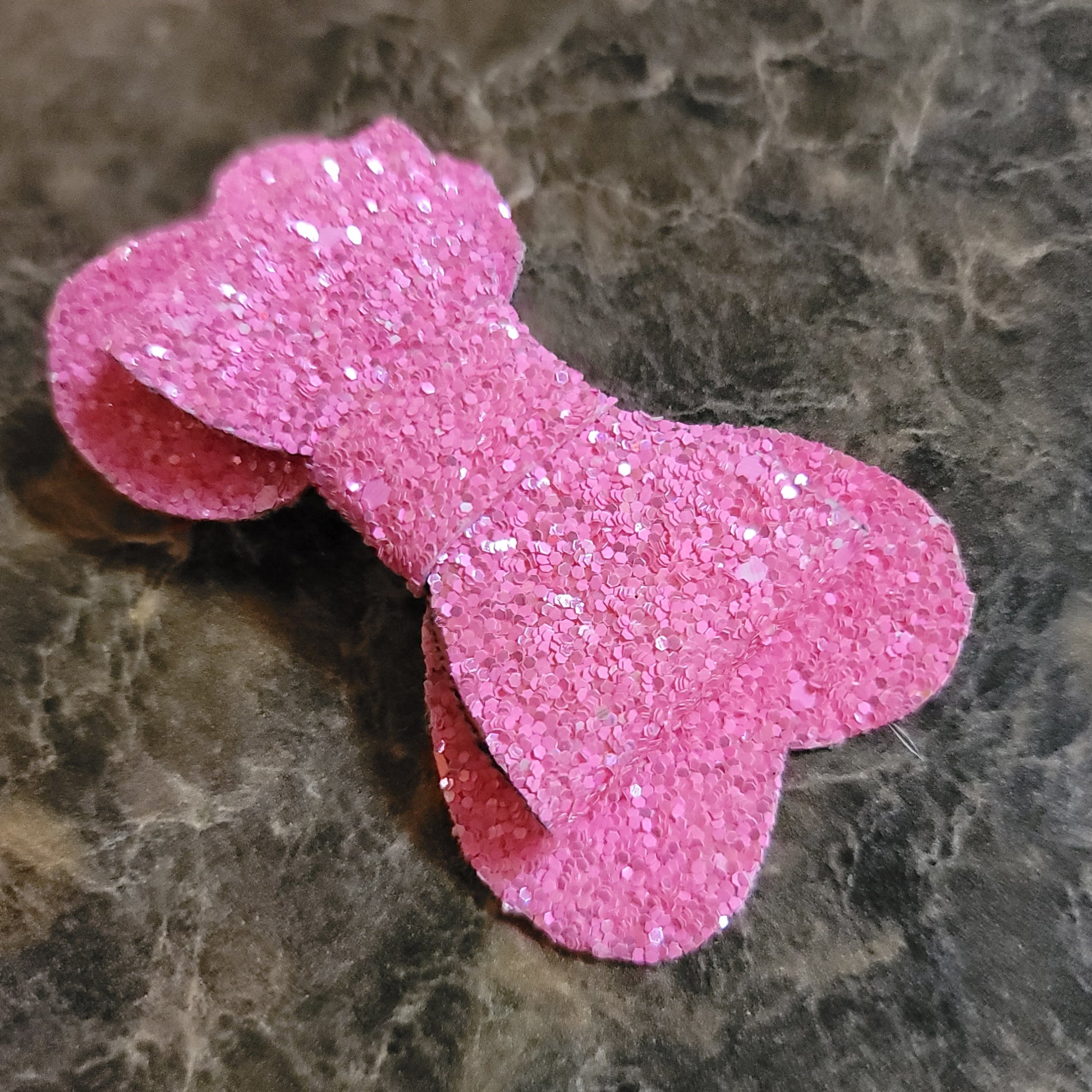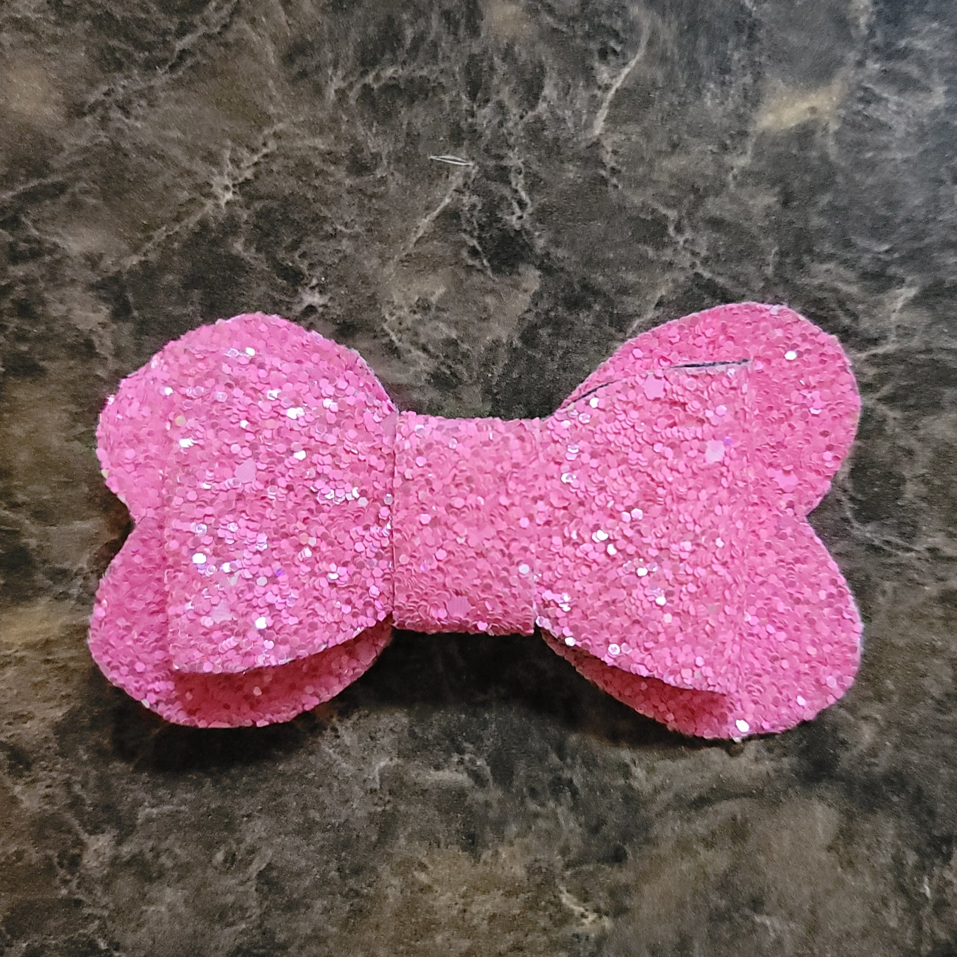 Hot pink glitter material with soft backing. (Pink is brighter in person) Bow secured on an alligator clip.
