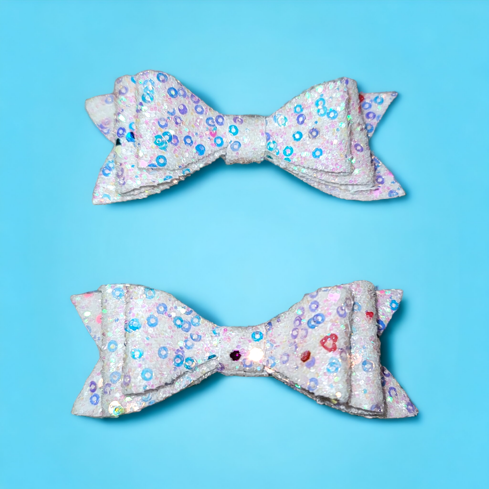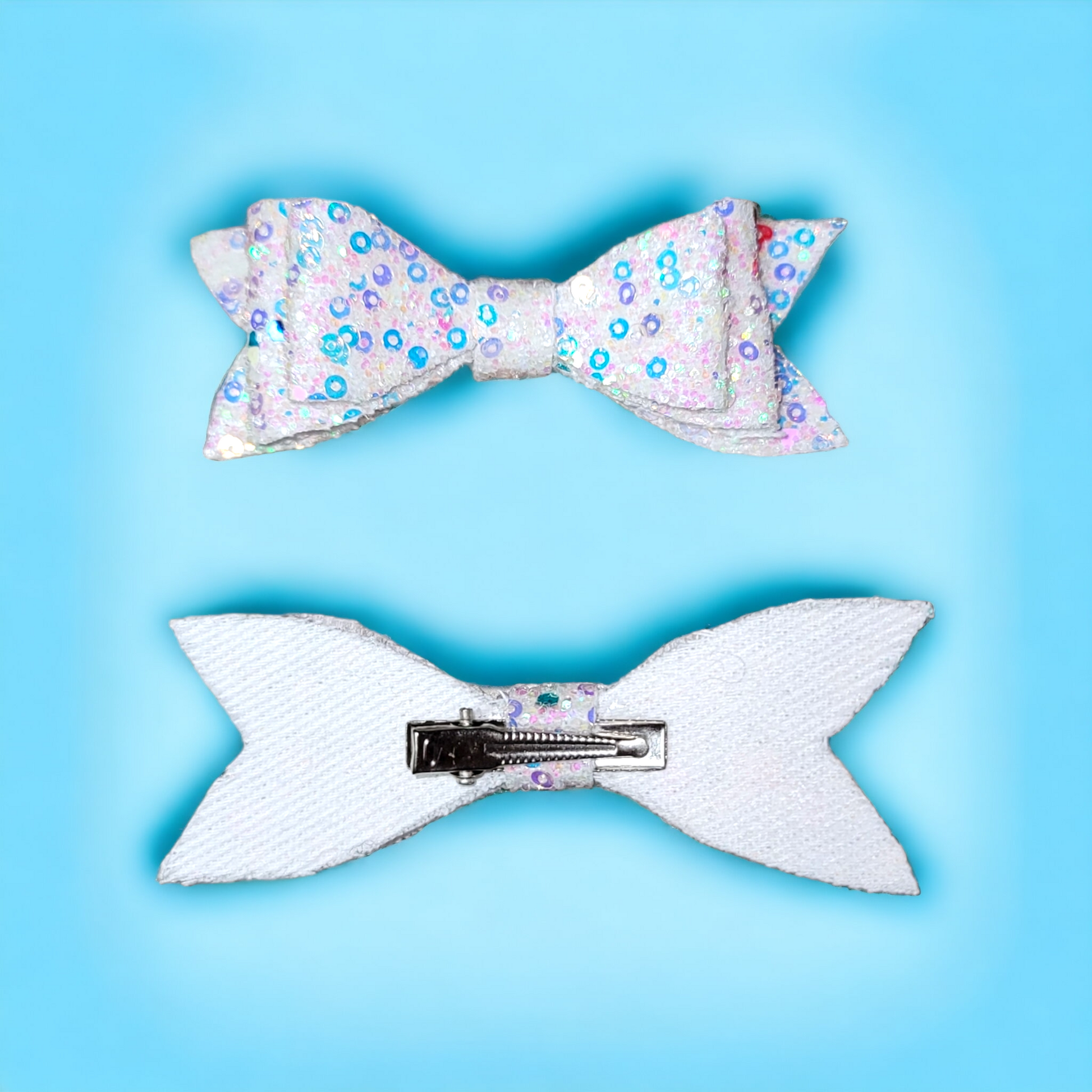 White iridescent glitter material with soft backing. Double stack small bows. Secured on alligator clips.