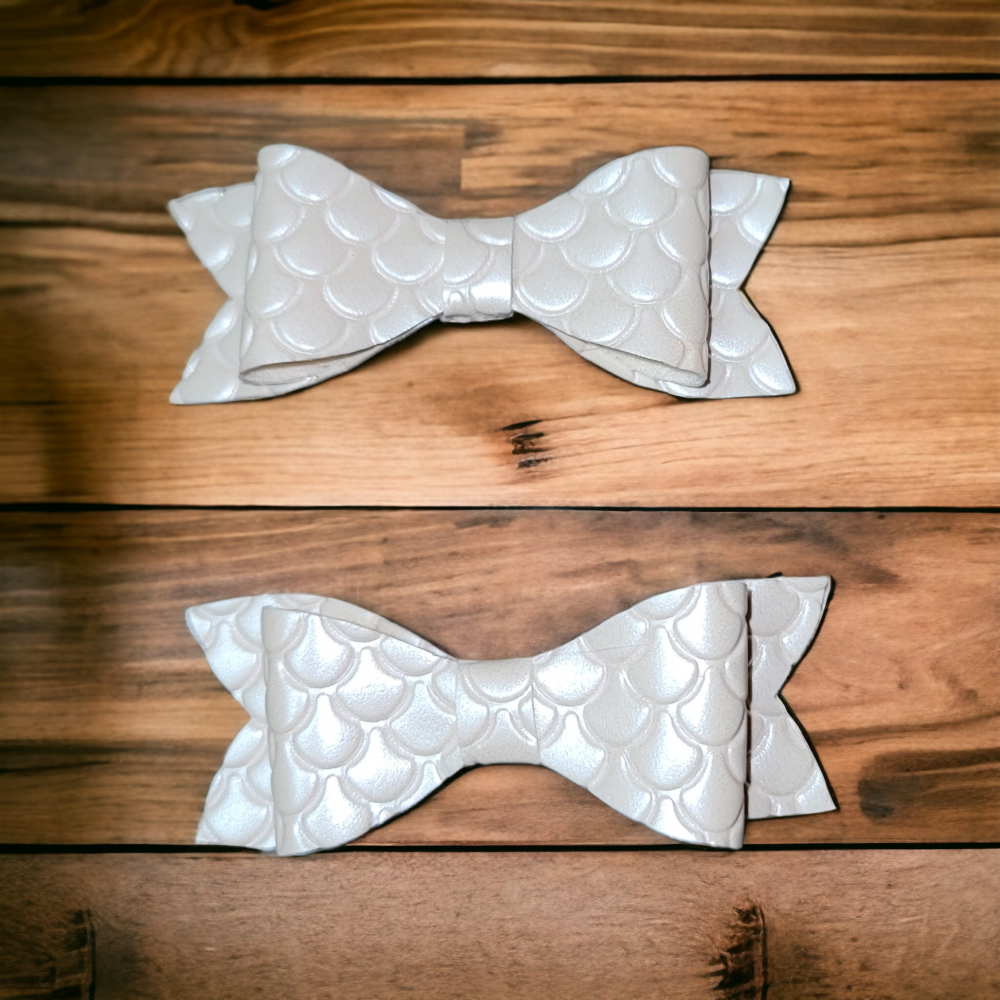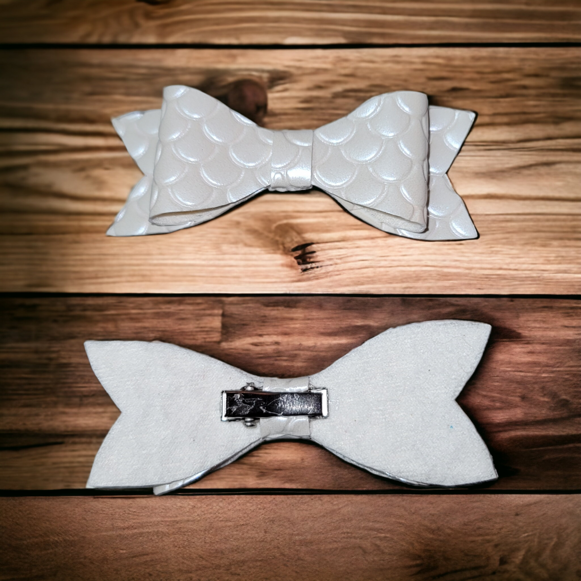 Ivory pearlescent scale texture soft faux leather. Mini bows secured on alligator clips.