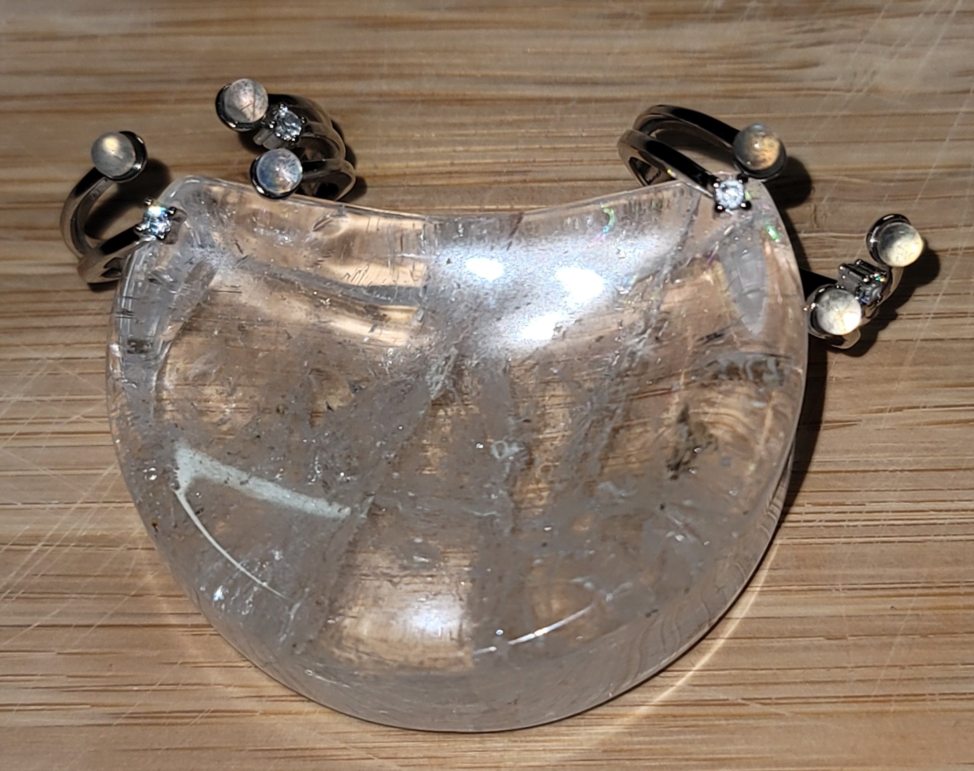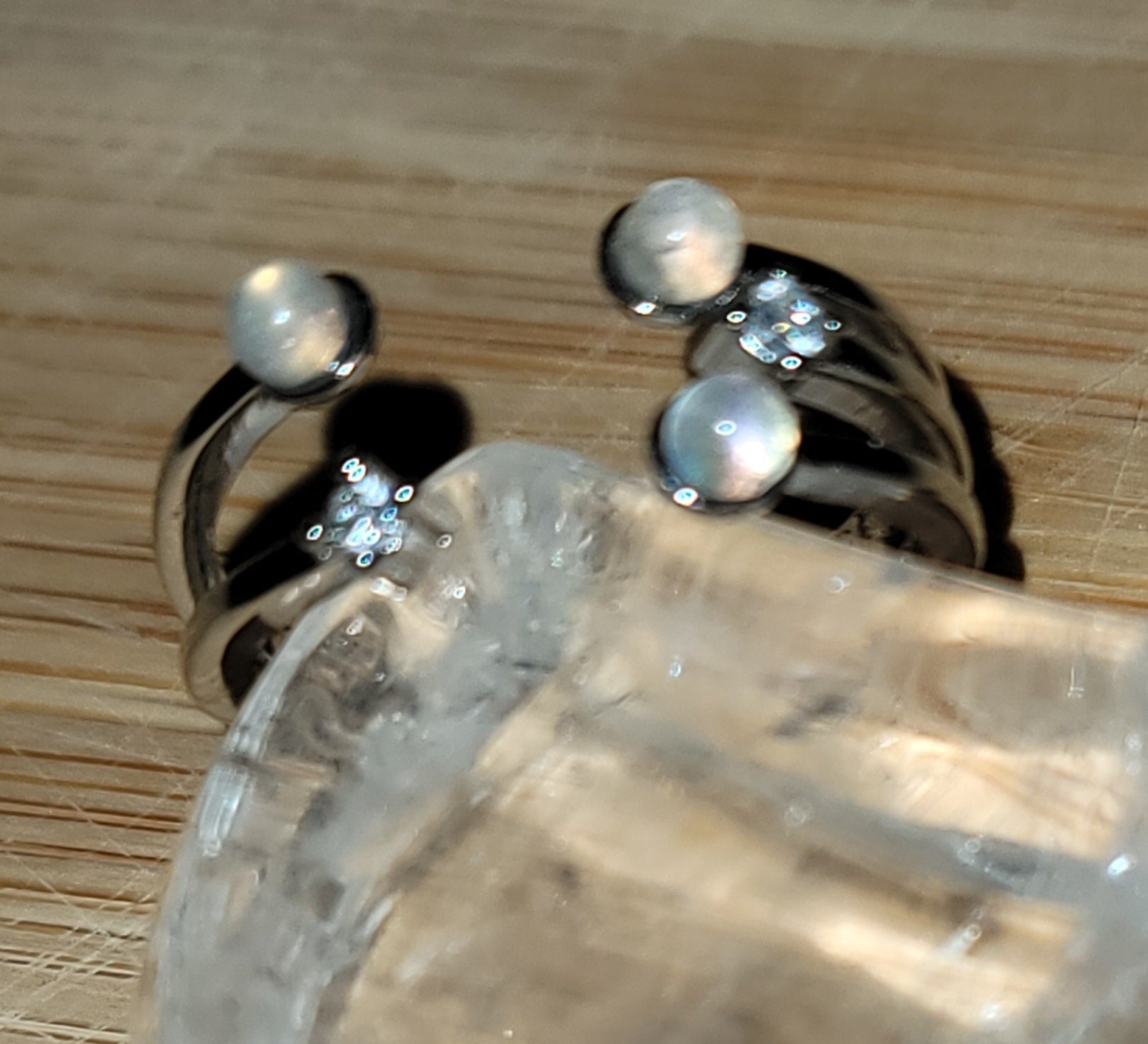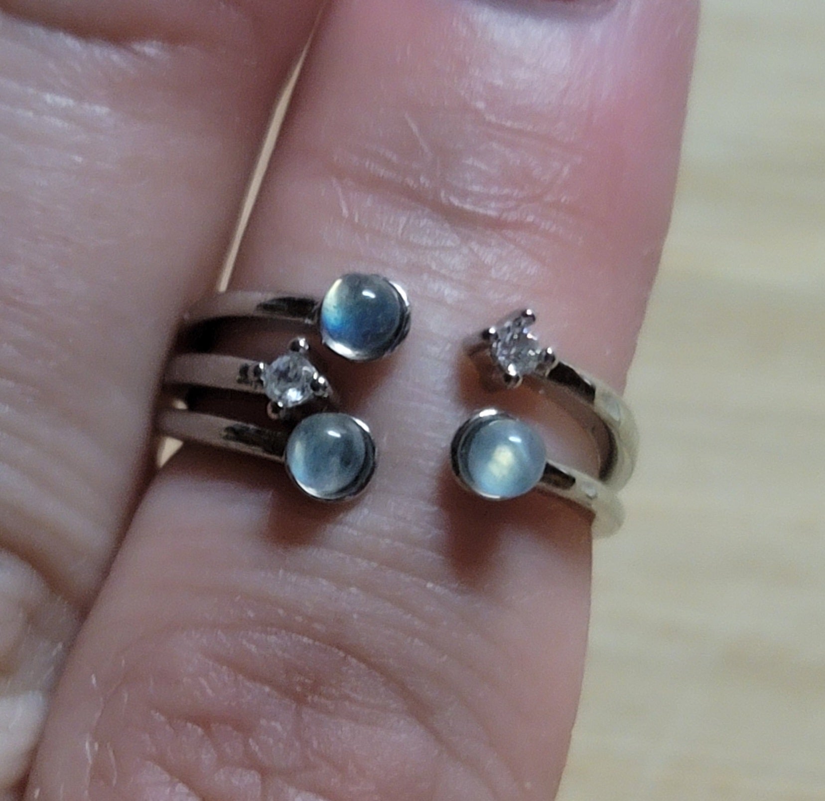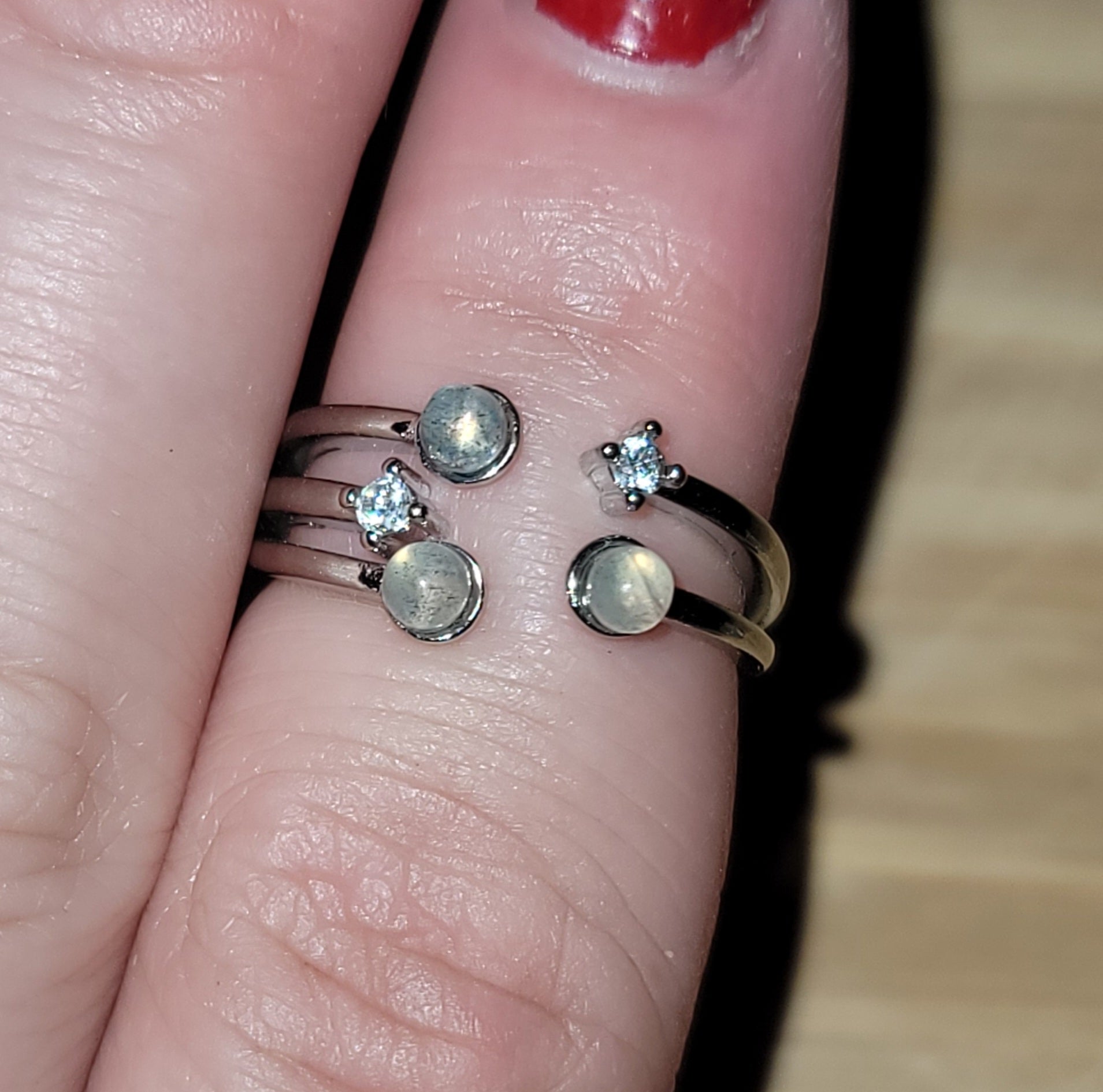 Labradorite and cubic zirconia open style ring. Set in sterling silver. Ring is adjustable.