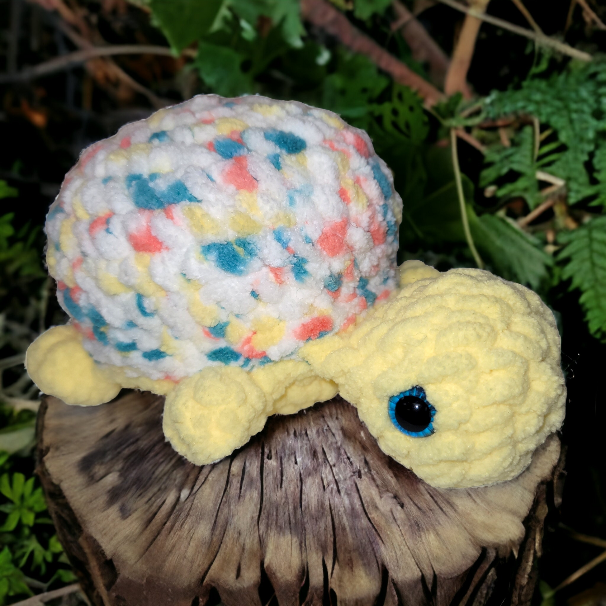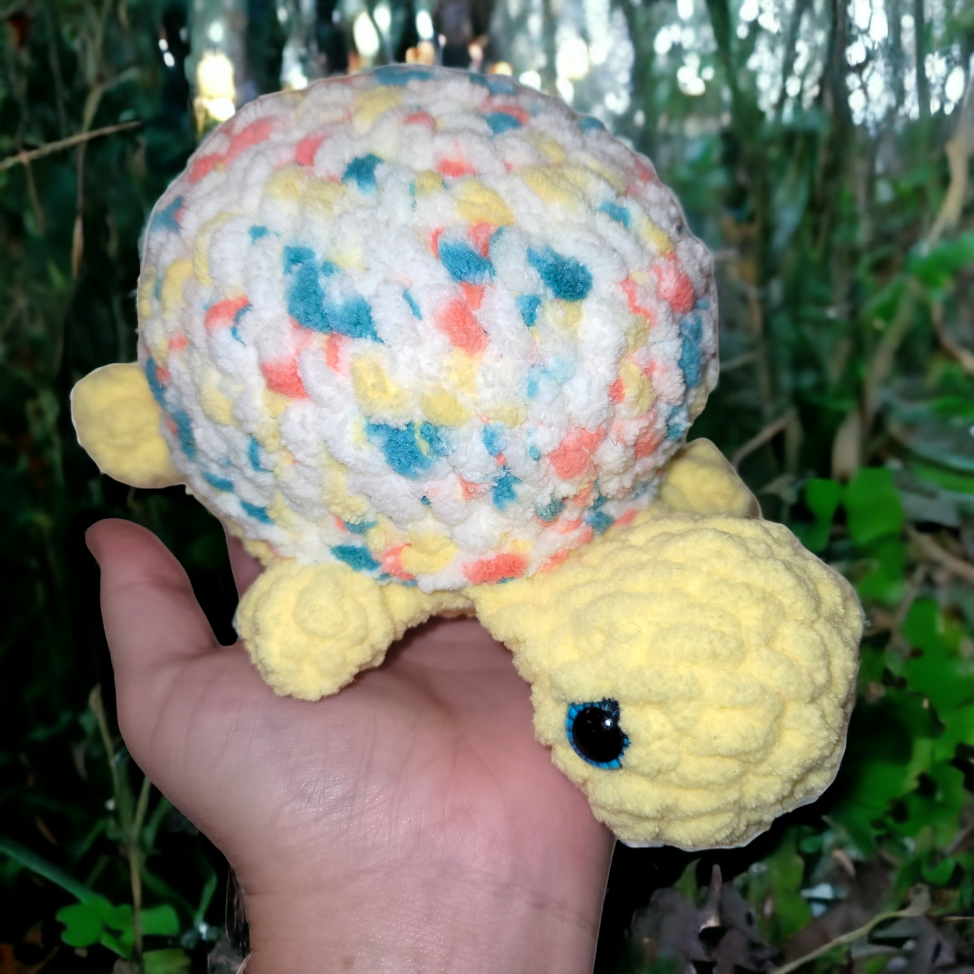Large, super soft chenille turtle. Safety eyes used.