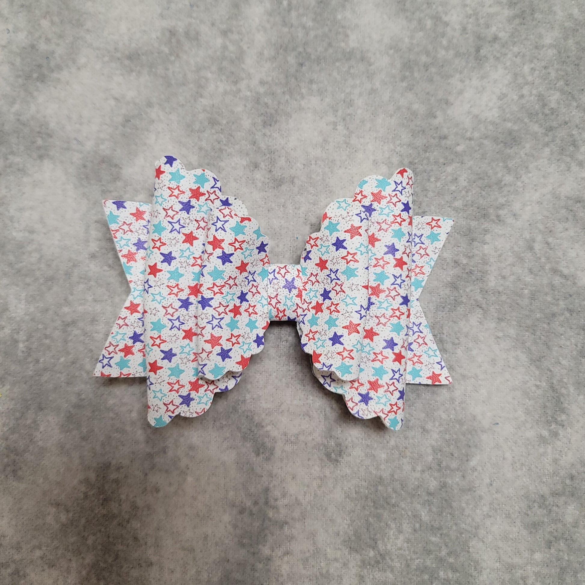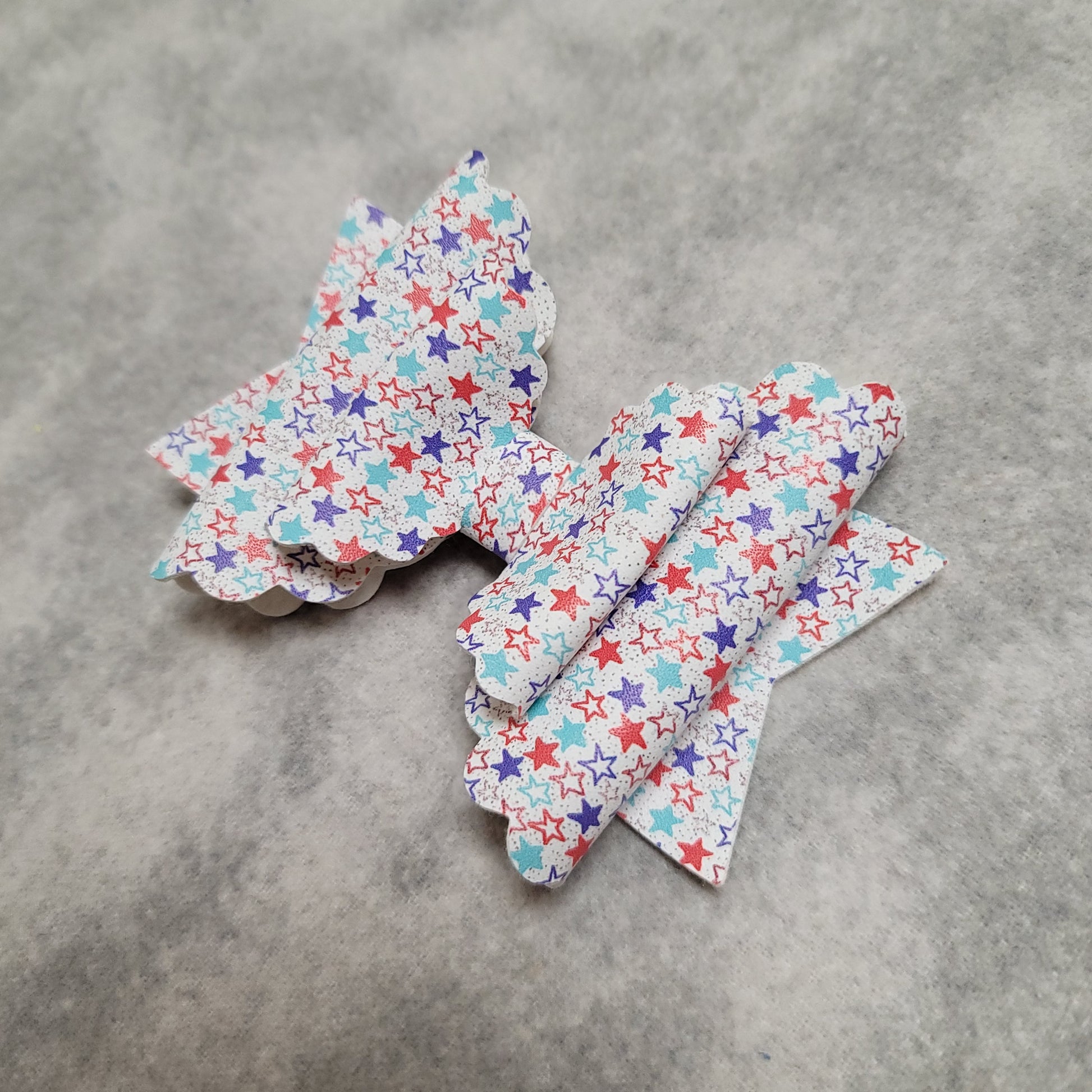 Red, white and blue star print faux leather. Large double scalloped bow secured on an alligator clip.