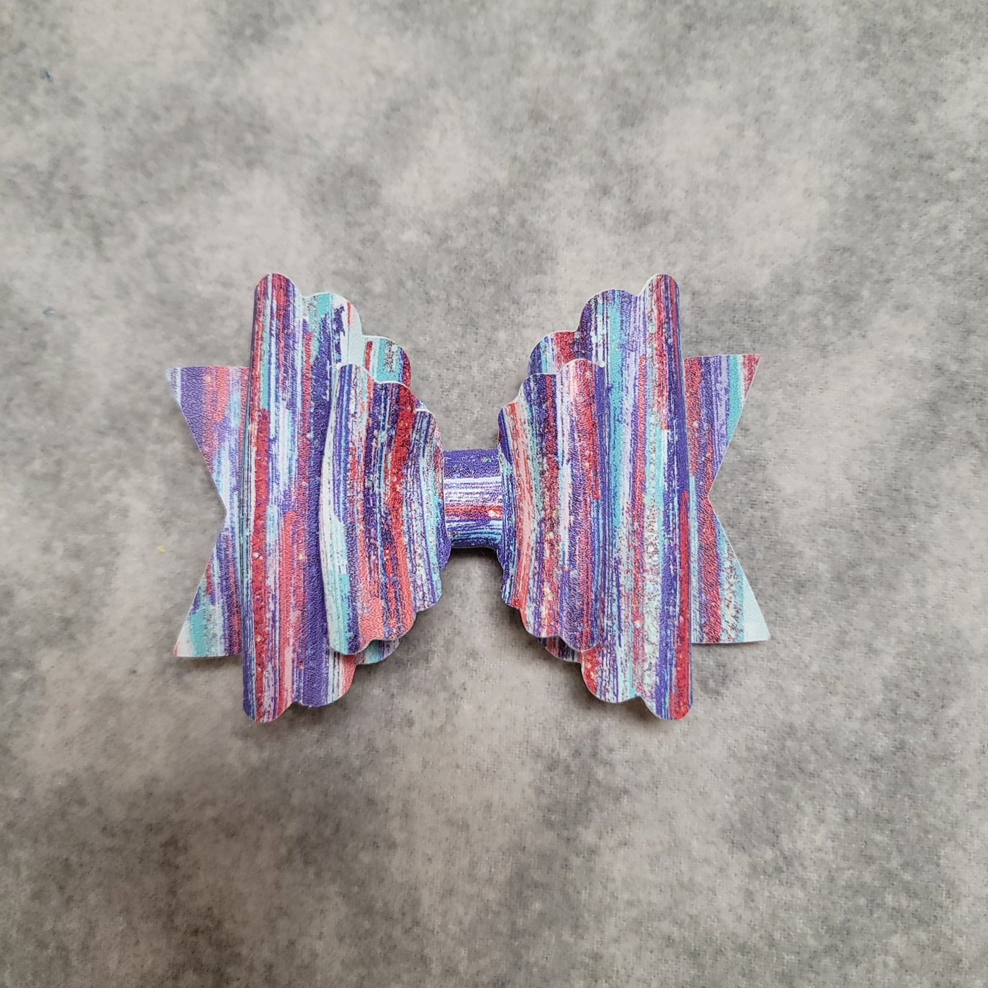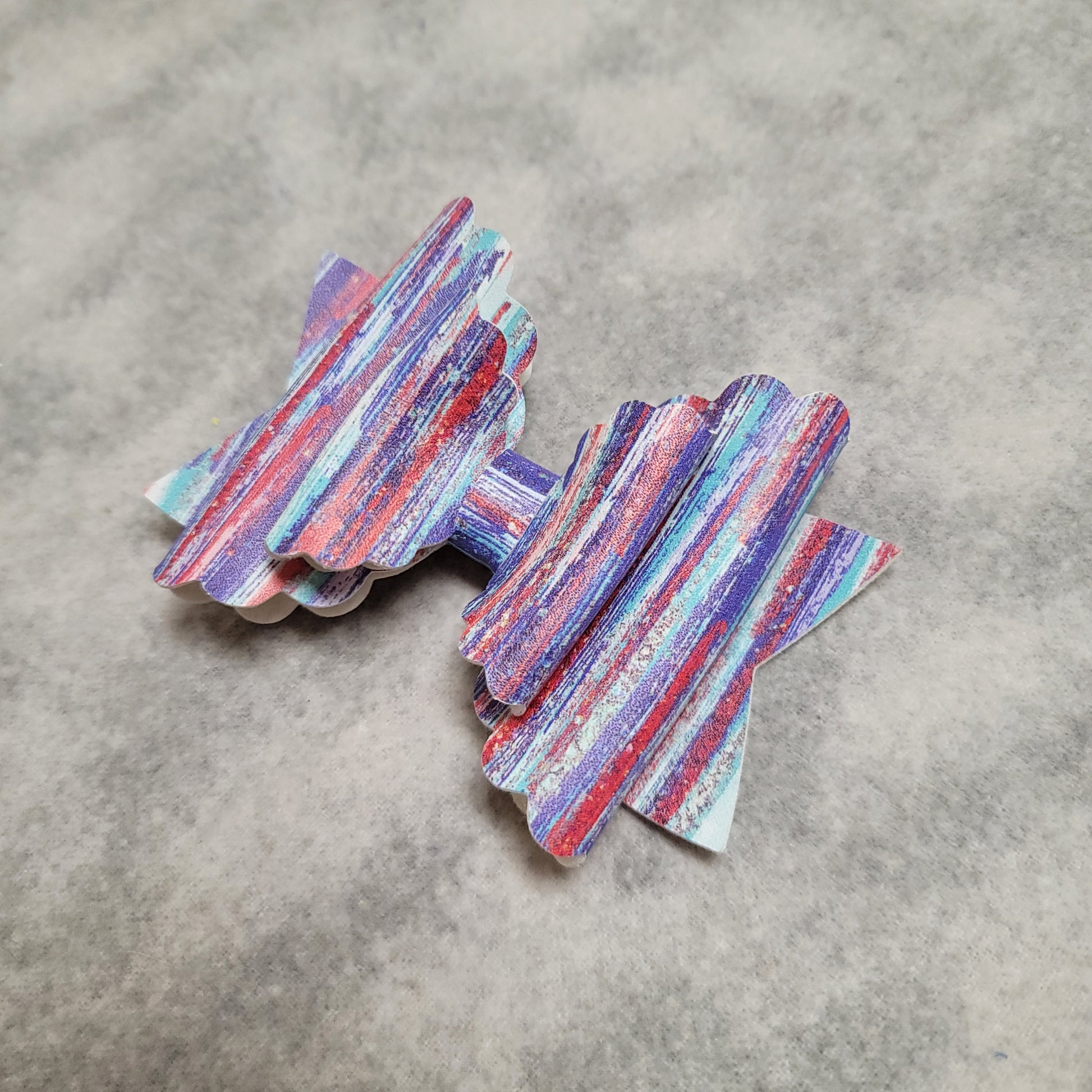Red, white, and blue paint brush print faux leather. Double scallop bow secured on an alligator clip.