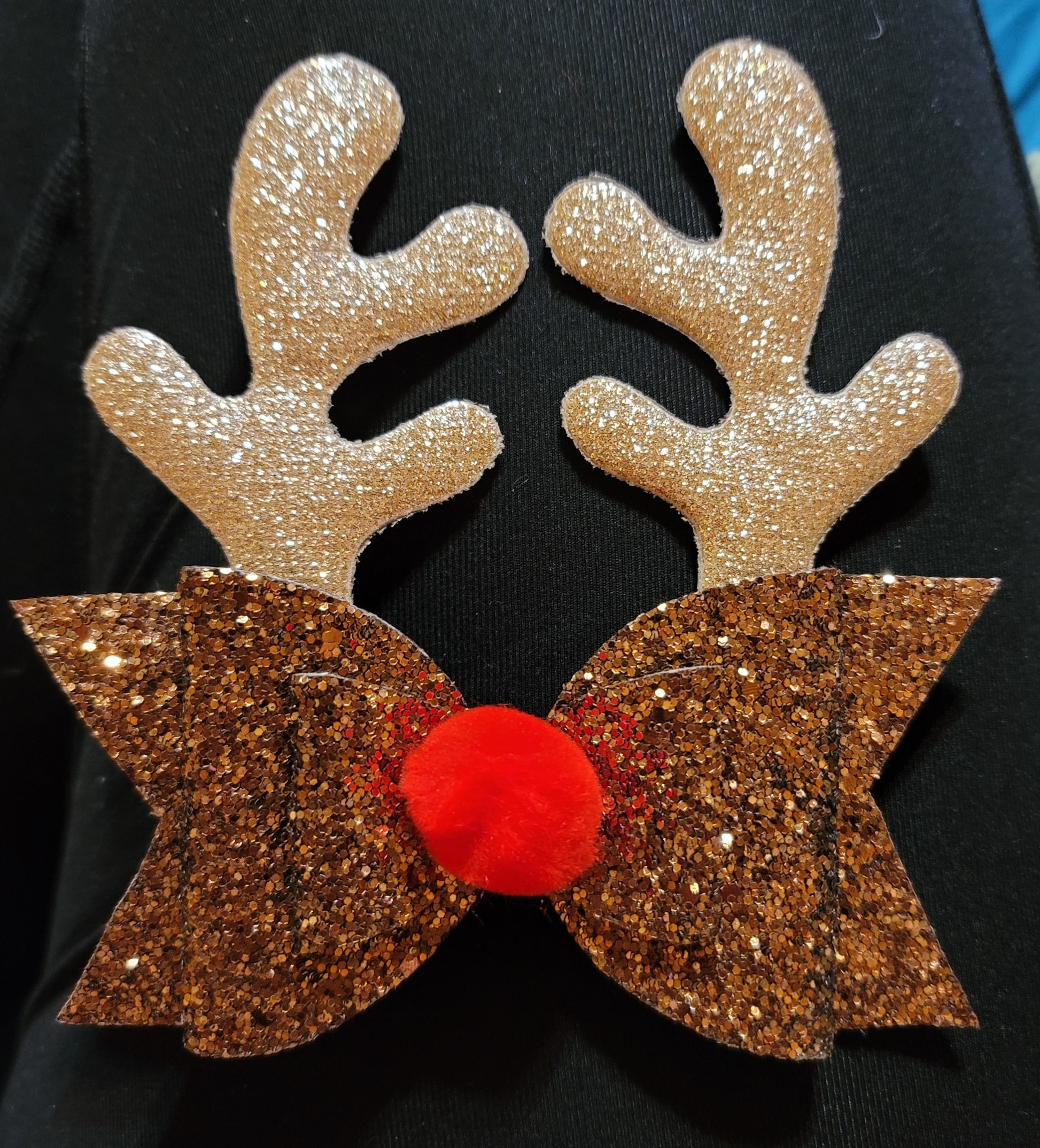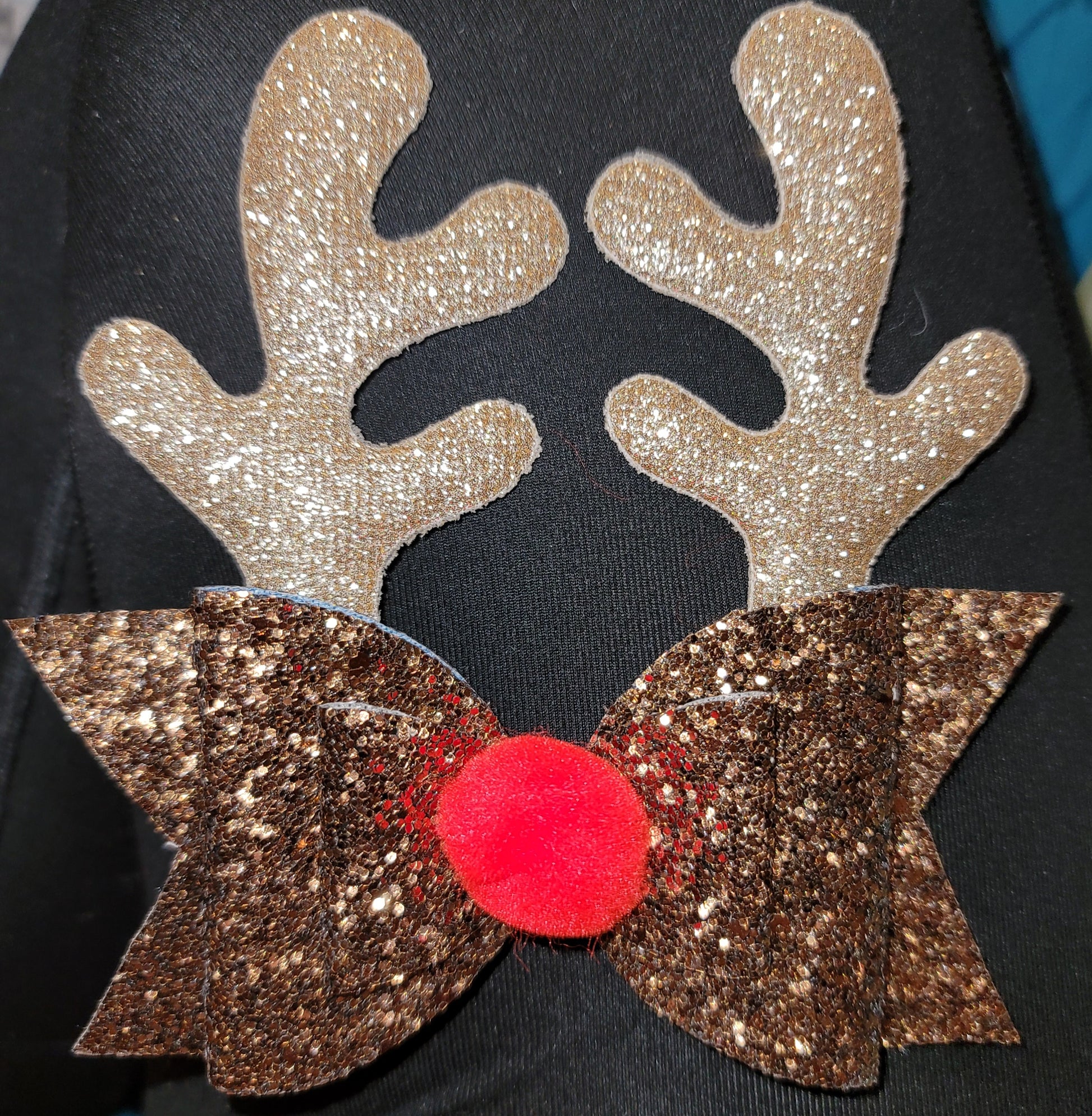 Large Chunky glitter bow on soft bow. Completed with soft sparkly antlers and a red pom pom nose.
