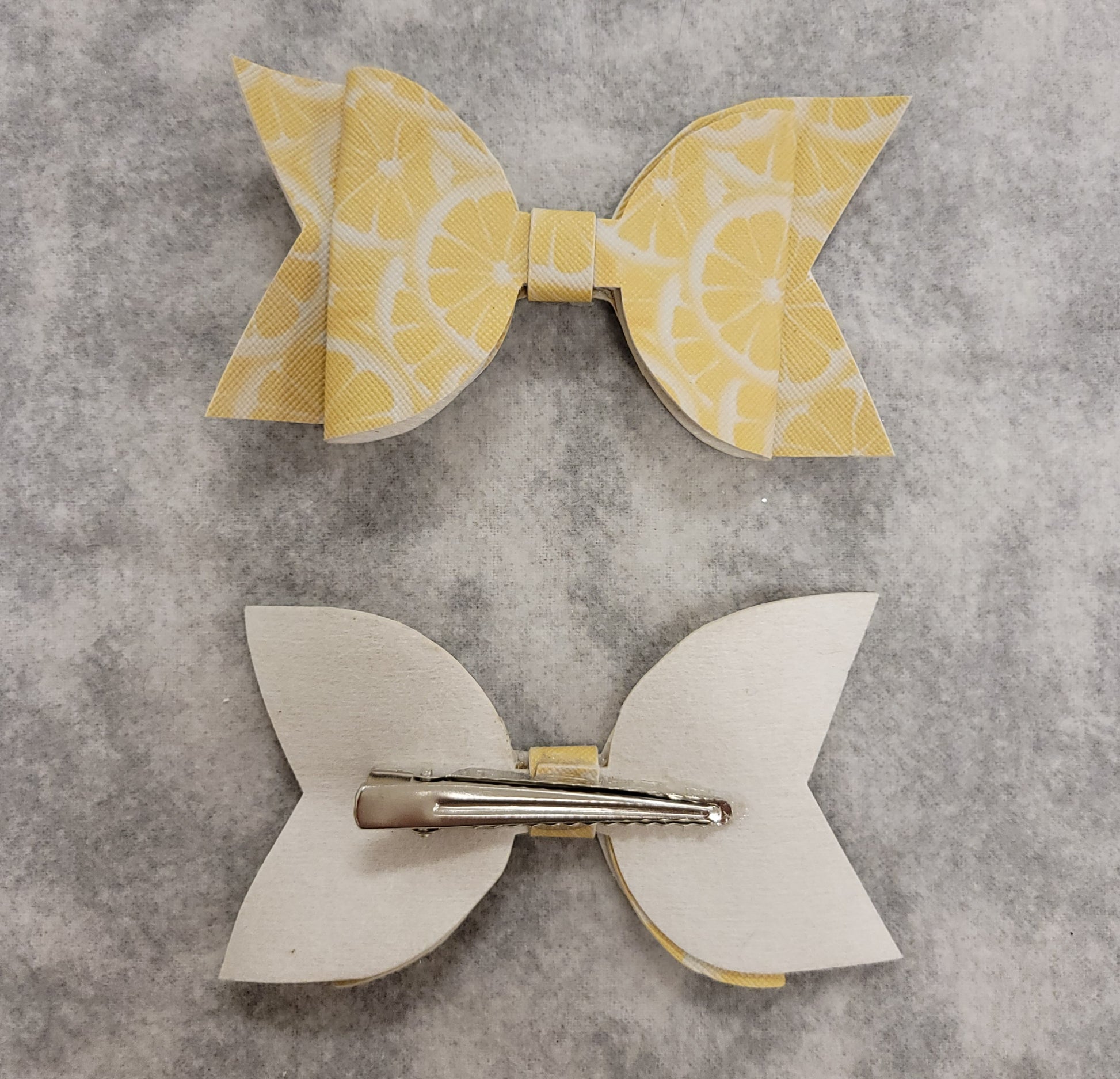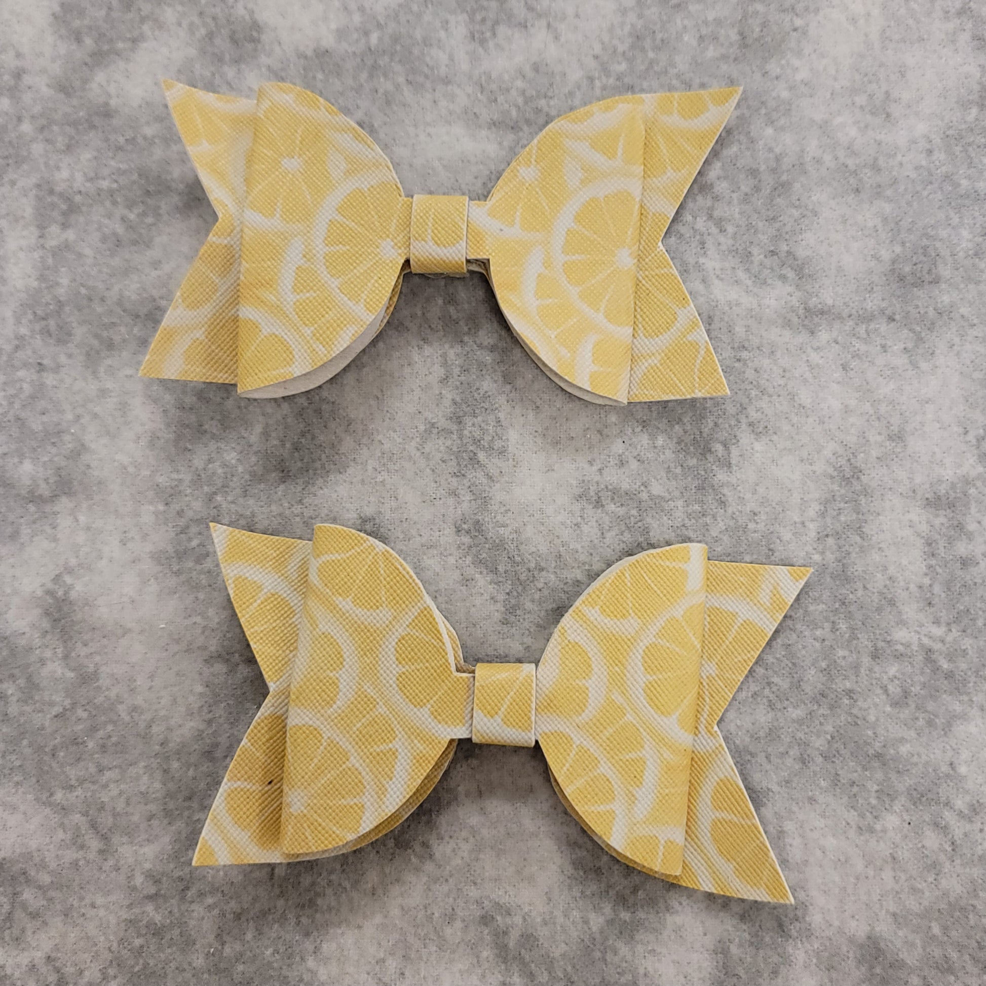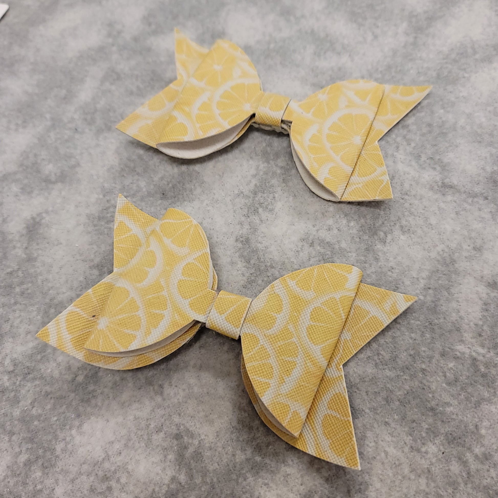 Lemon print faux leather. Single stack bow secured on an alligator clip.