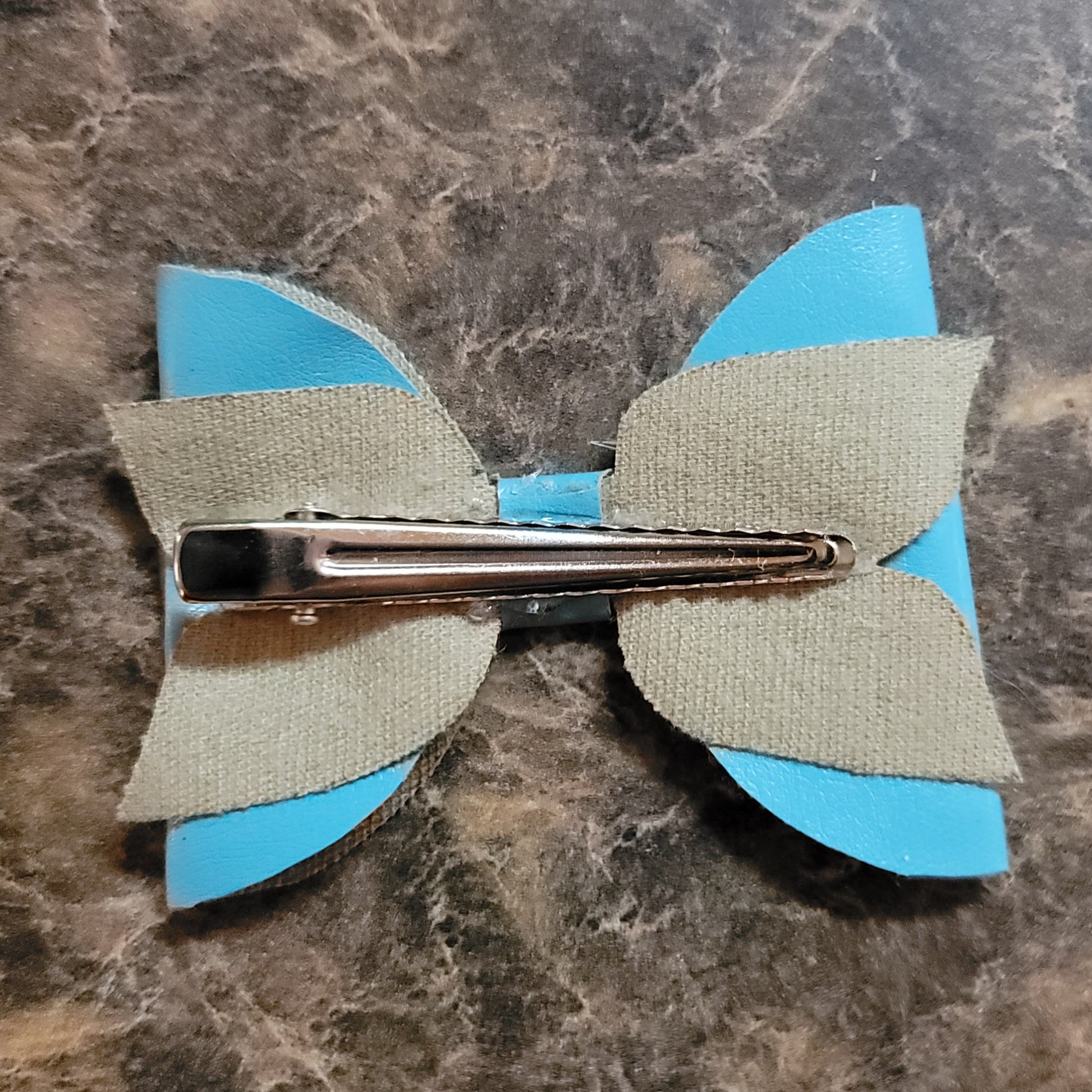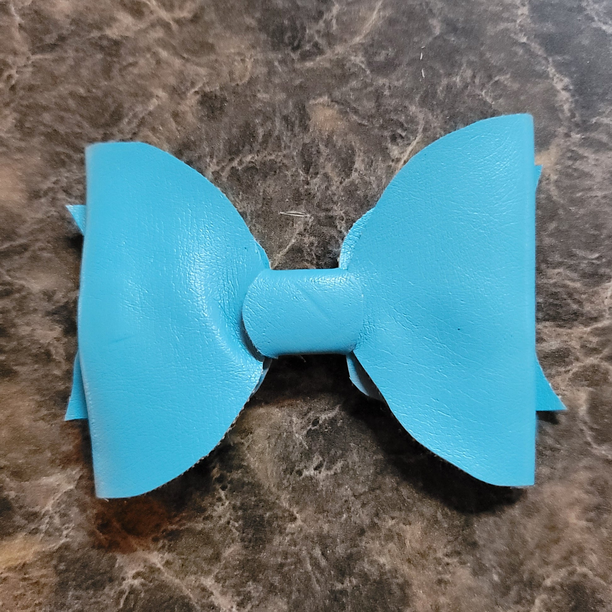 Light blue soft faux leather. Medium bow secured on an alligator clip.