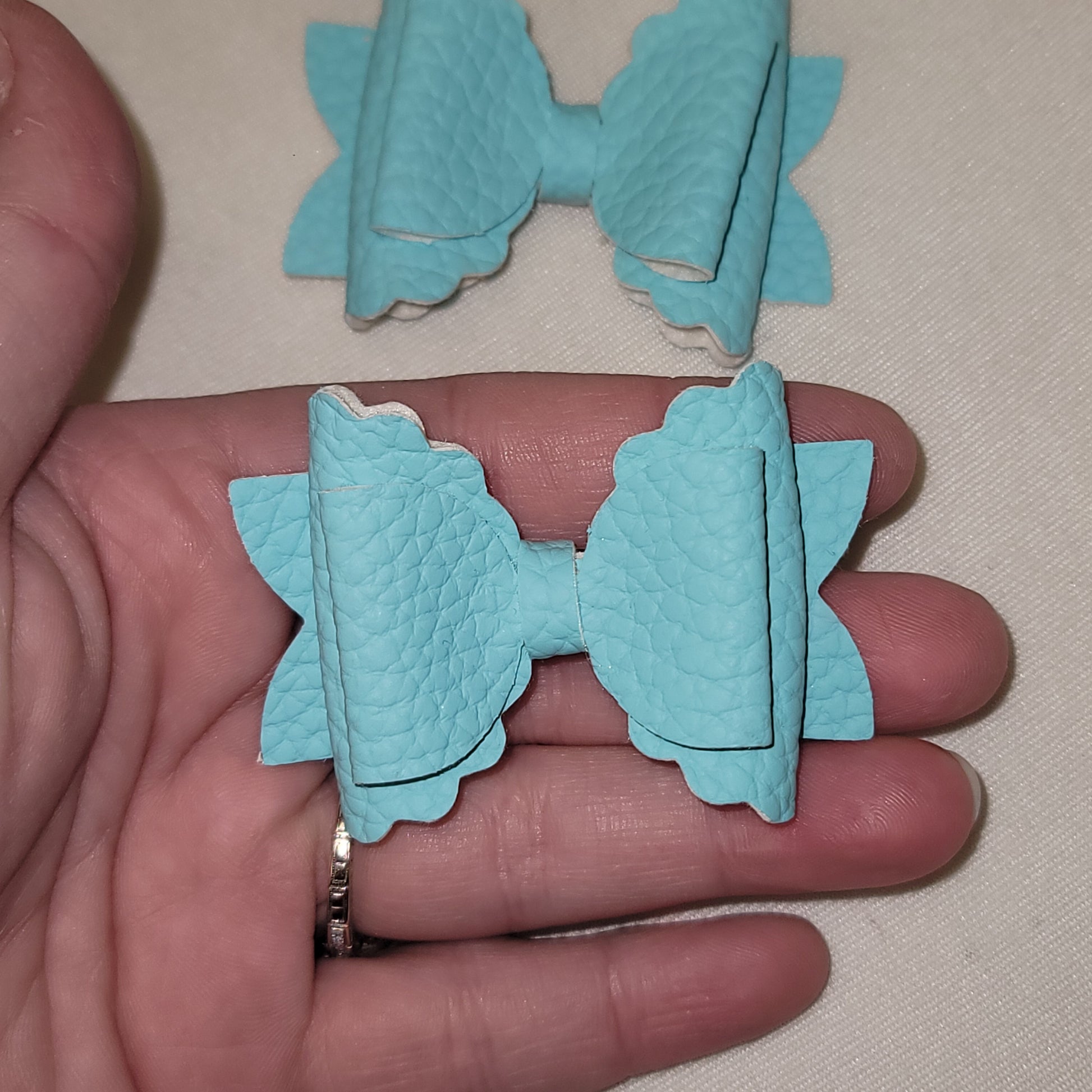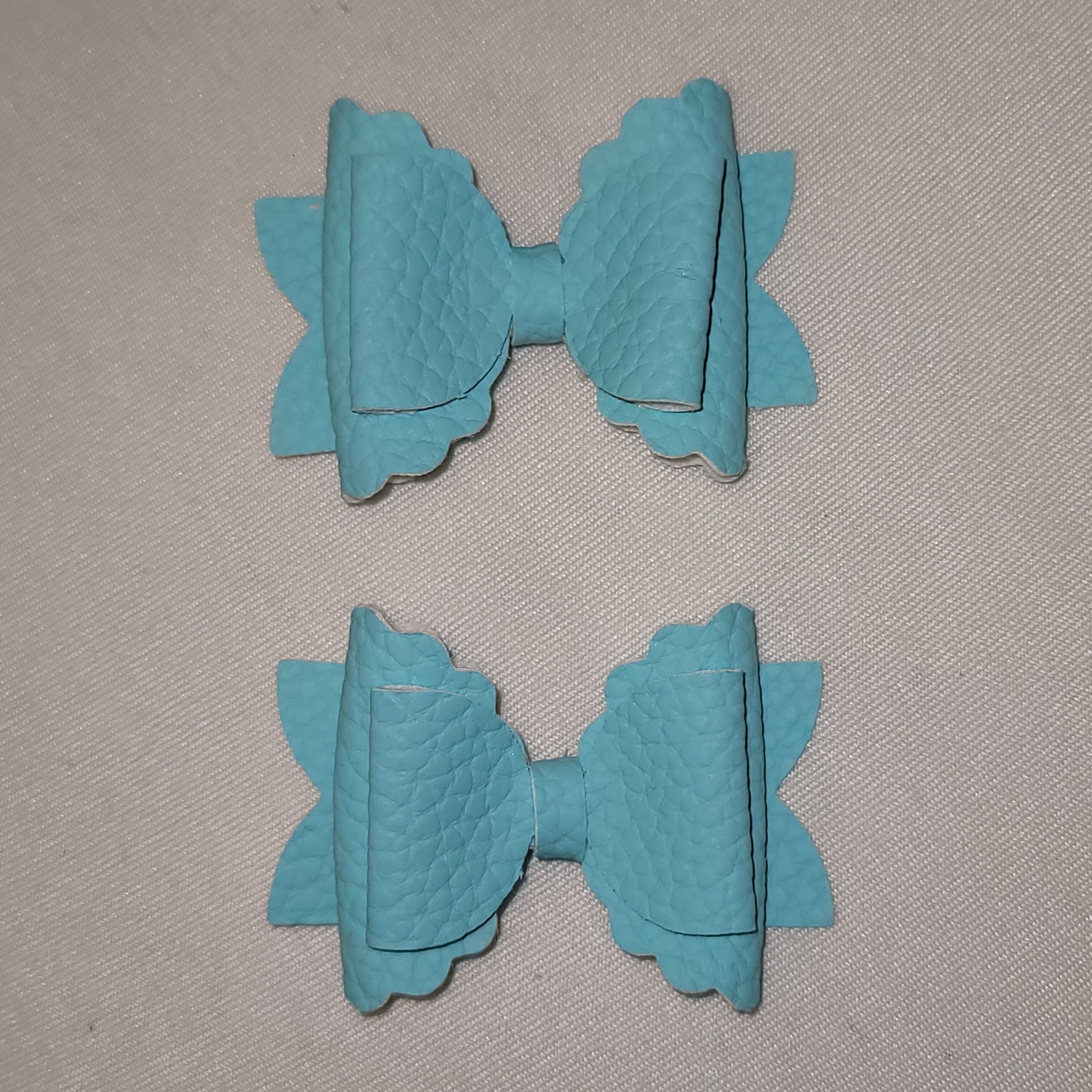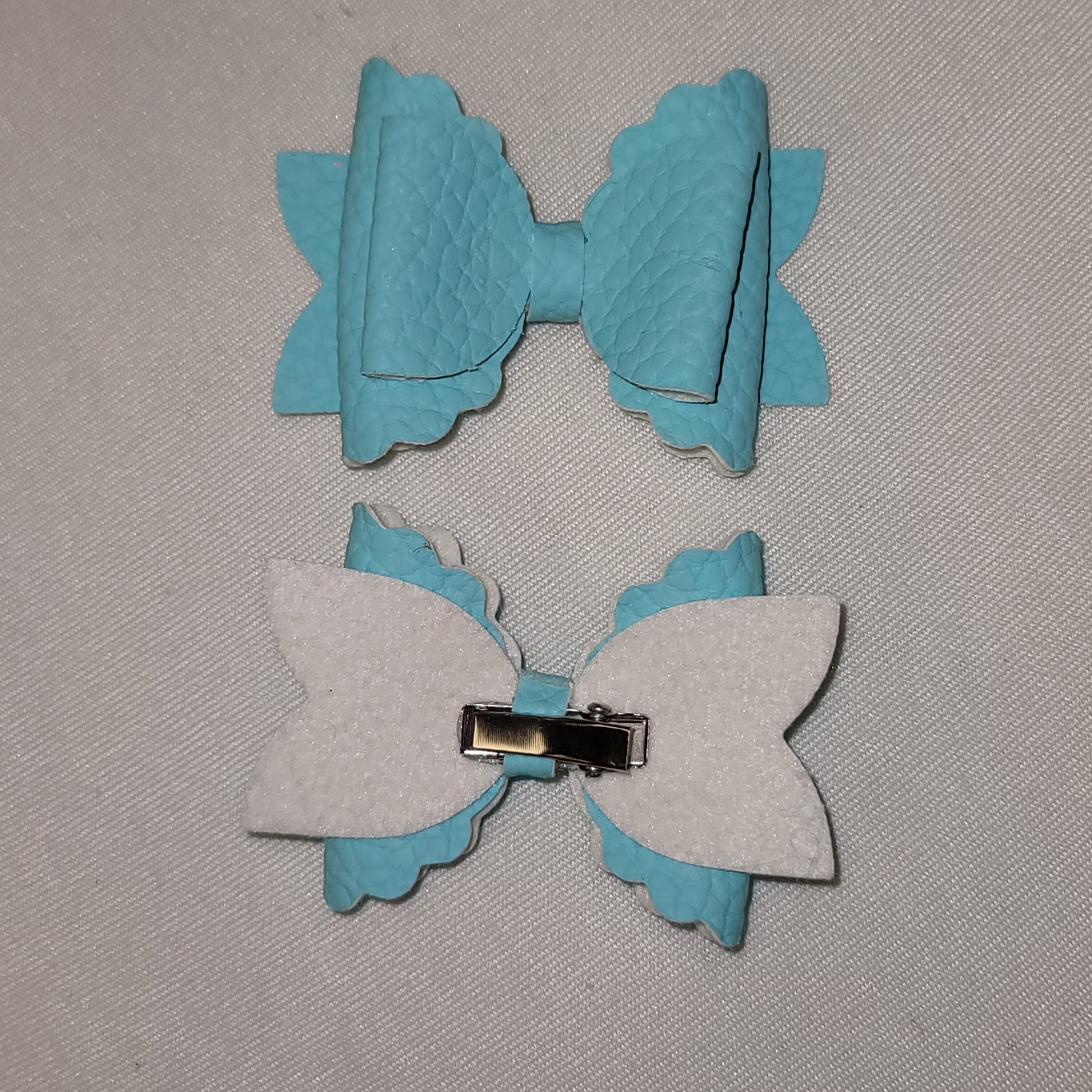 Light blue faux leather material. 2.5 inch piggy style bows secured on alligator clips.