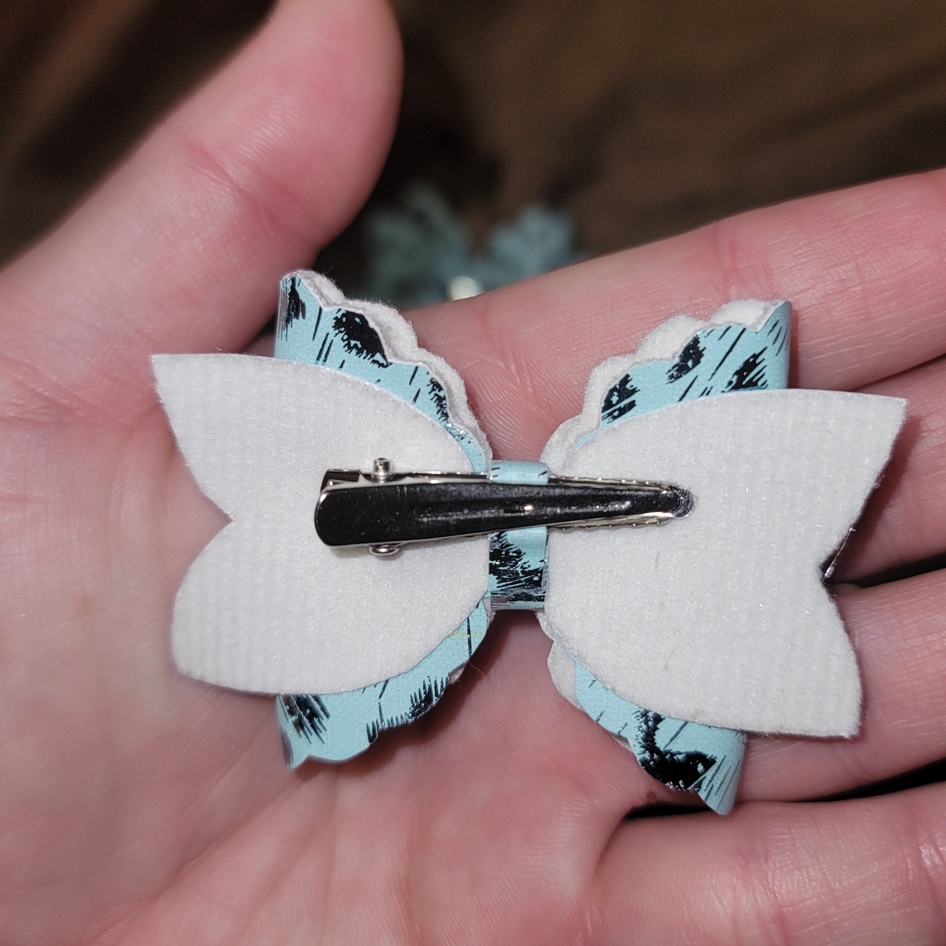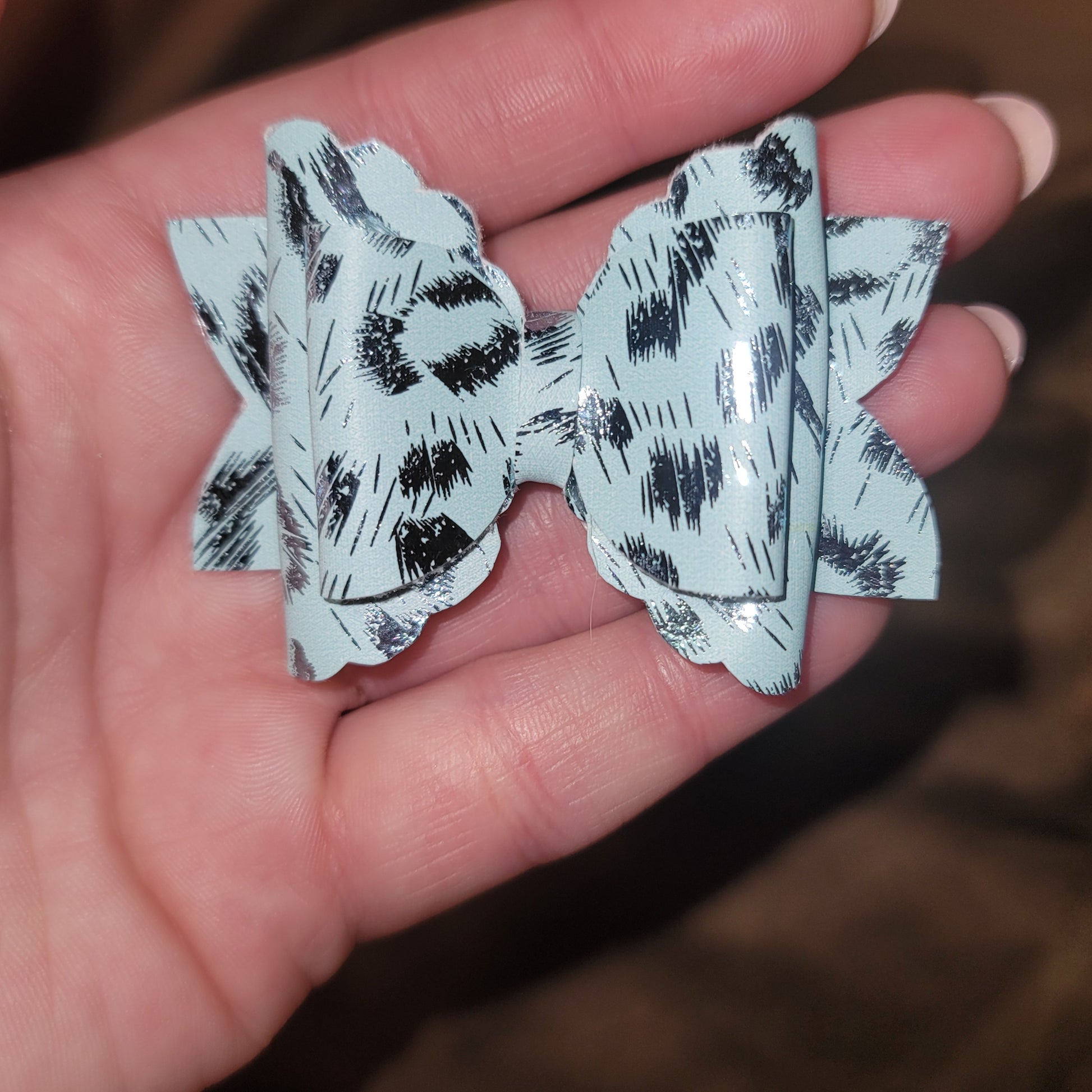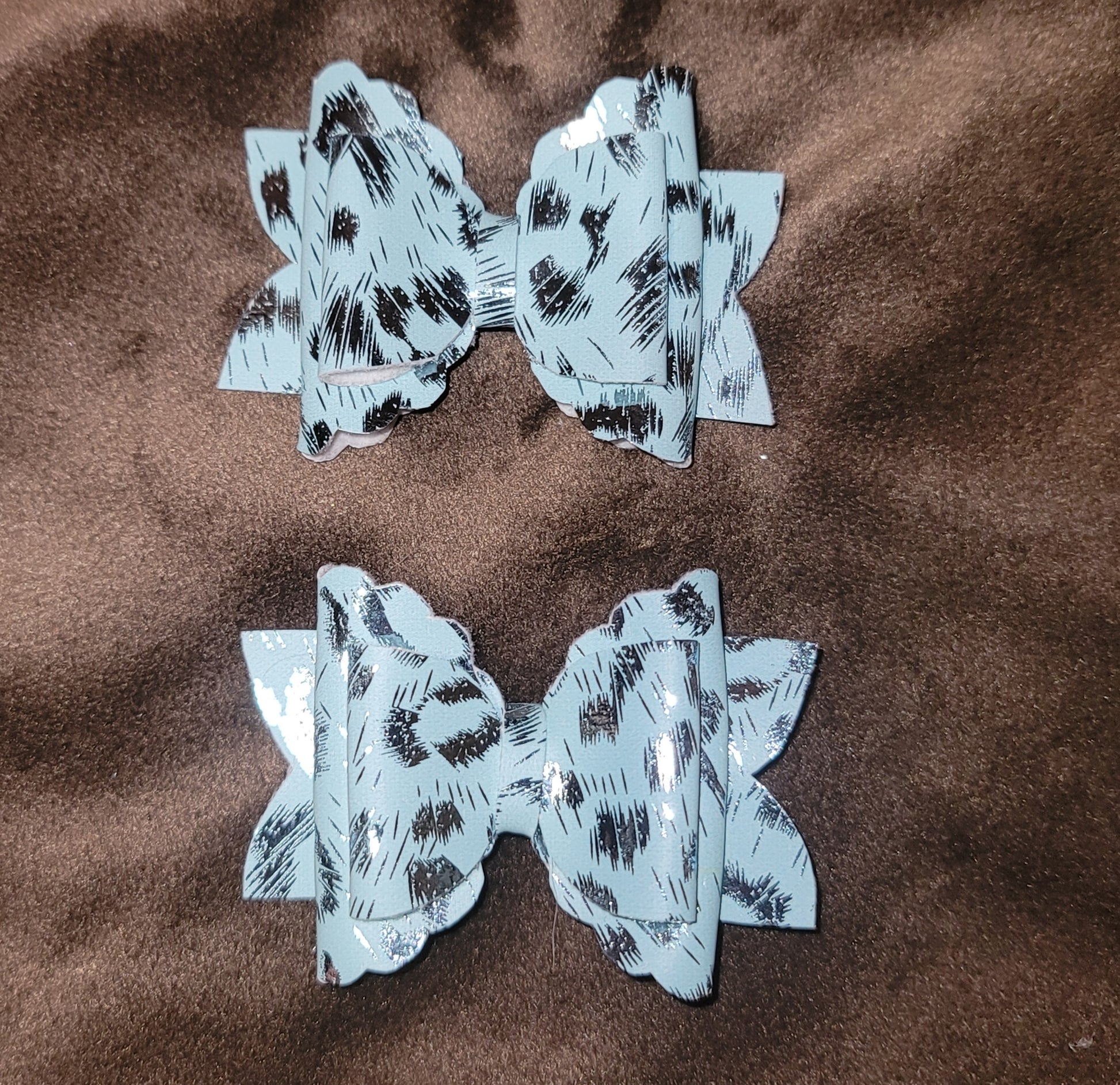 Light blue and silver cheetah print faux leather. 2.5 inch piggy style bows. Secured on alligator clips.
