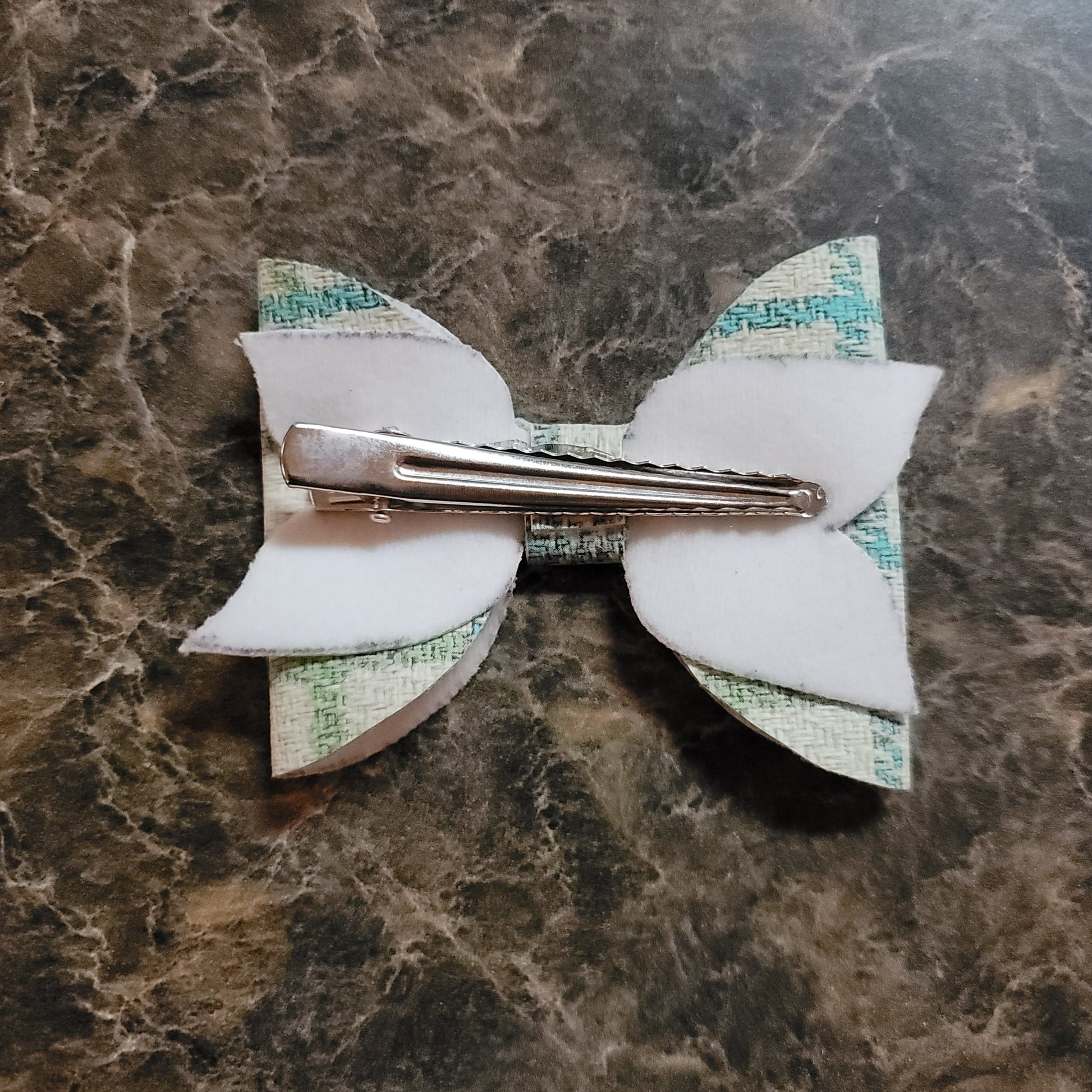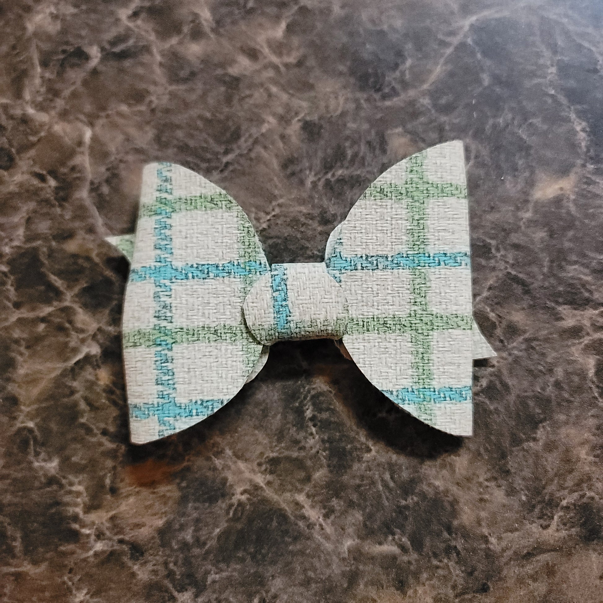 Light green plaid faux leather. Medium bow secured on an alligator clip.