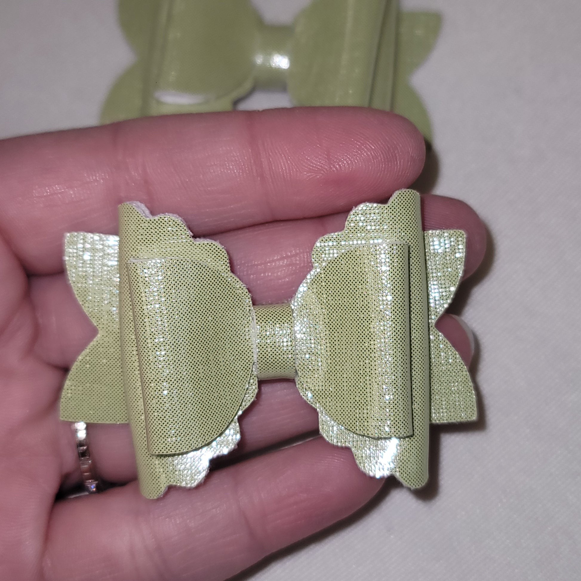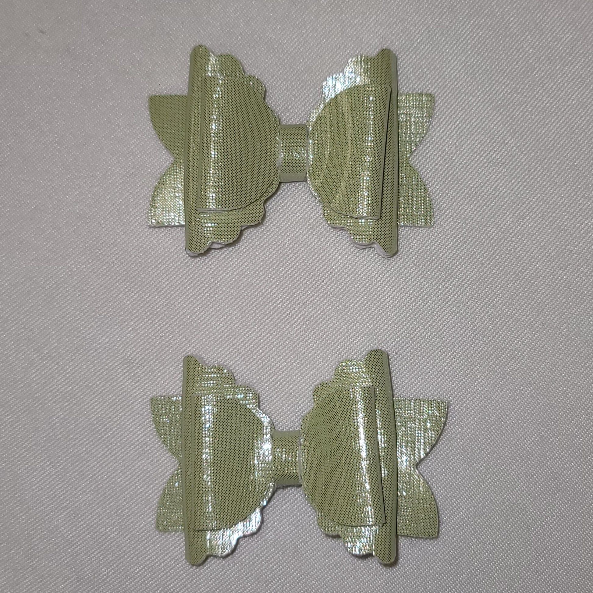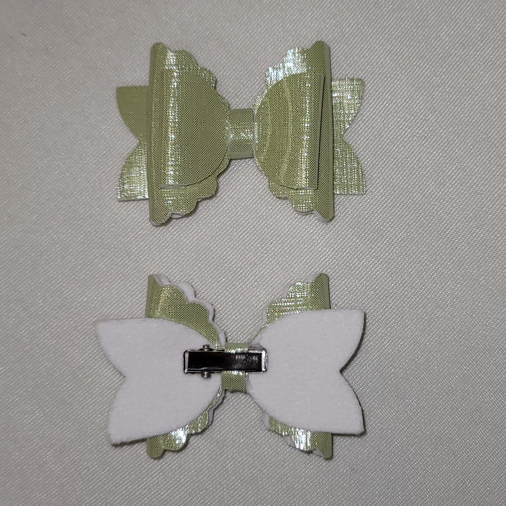 Light green shimmer vinyl material with soft backing. 2.5 inch piggy style bows secured on an alligator clip.