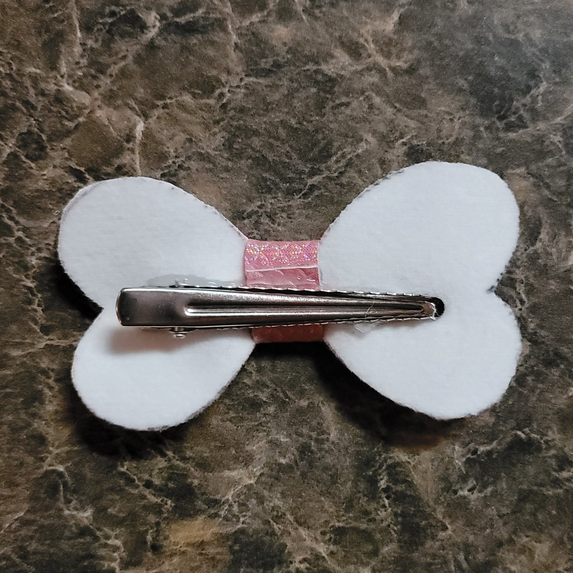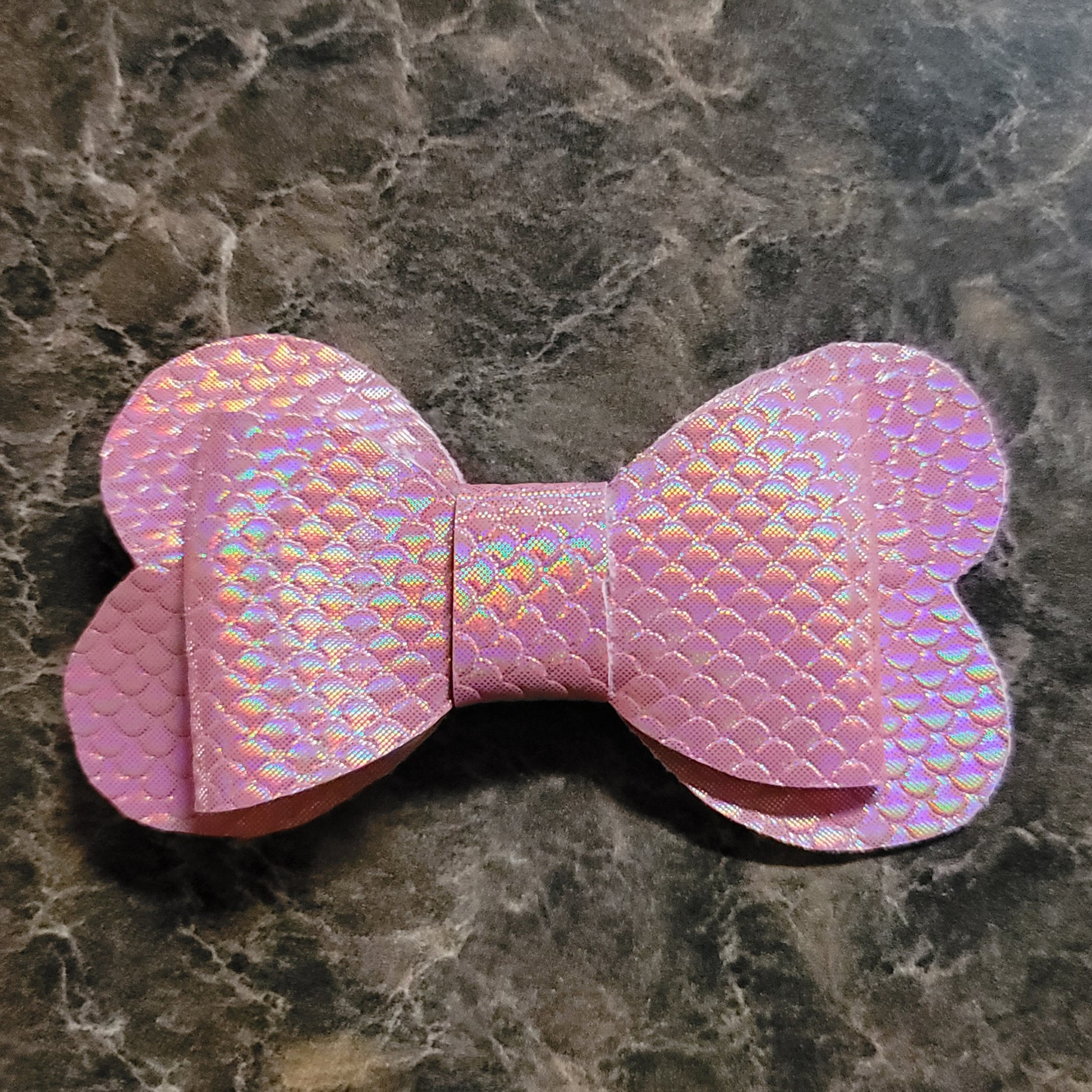 Light Pink color shifting faux leather. Bow secured on an alligator clip.
