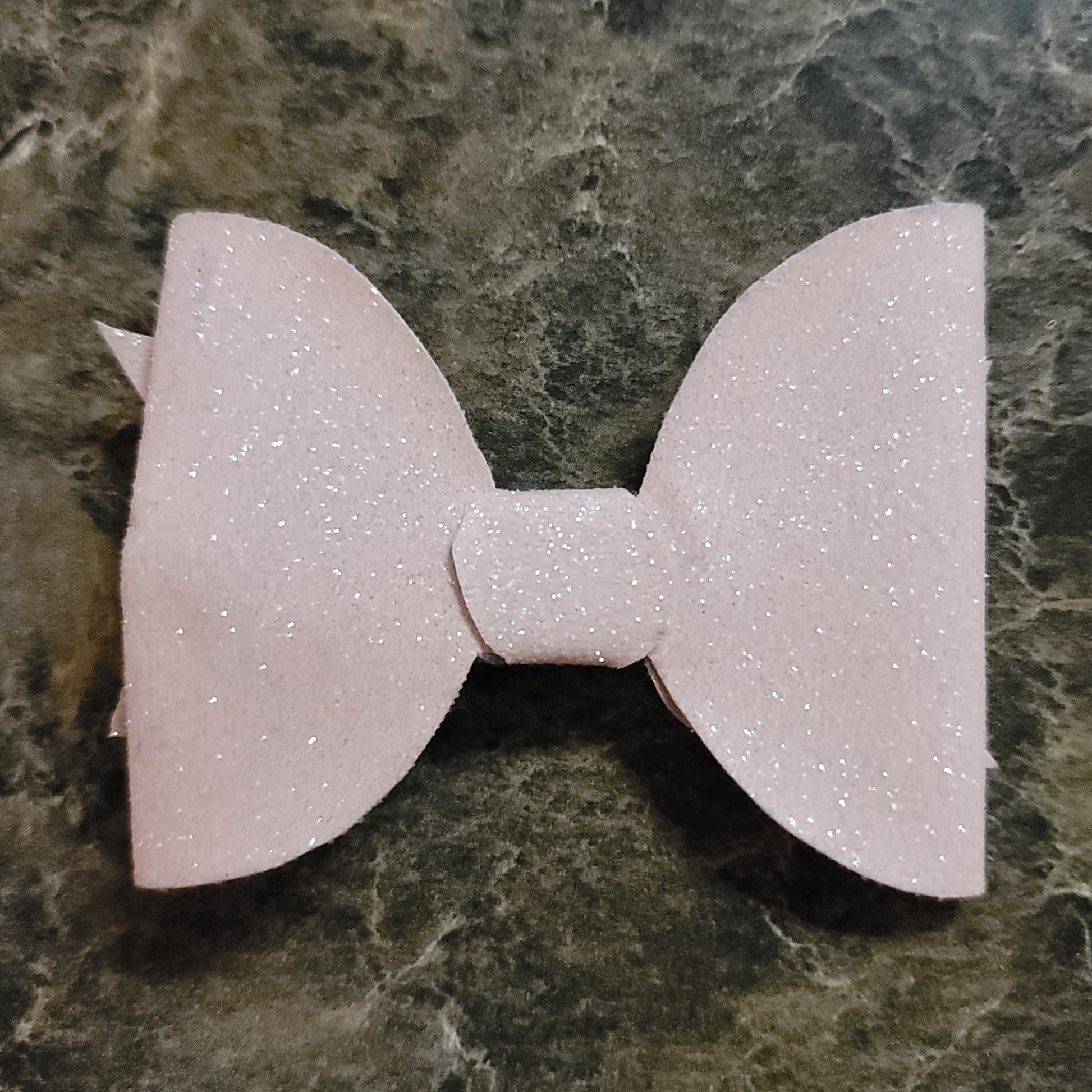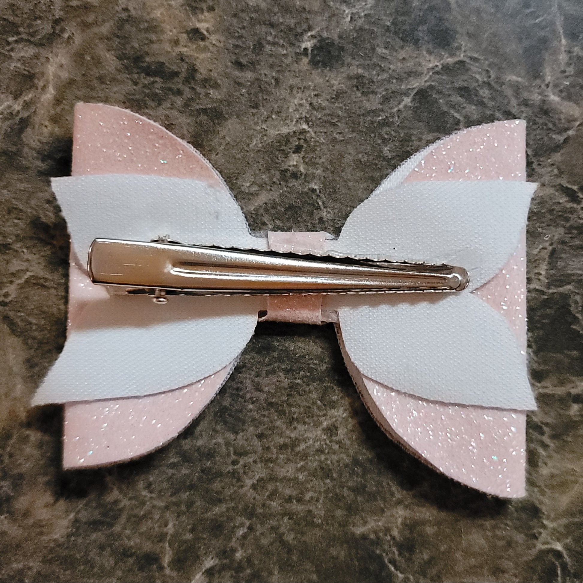 Light Pink glitter material. Medium bow secured on an alligator clip.