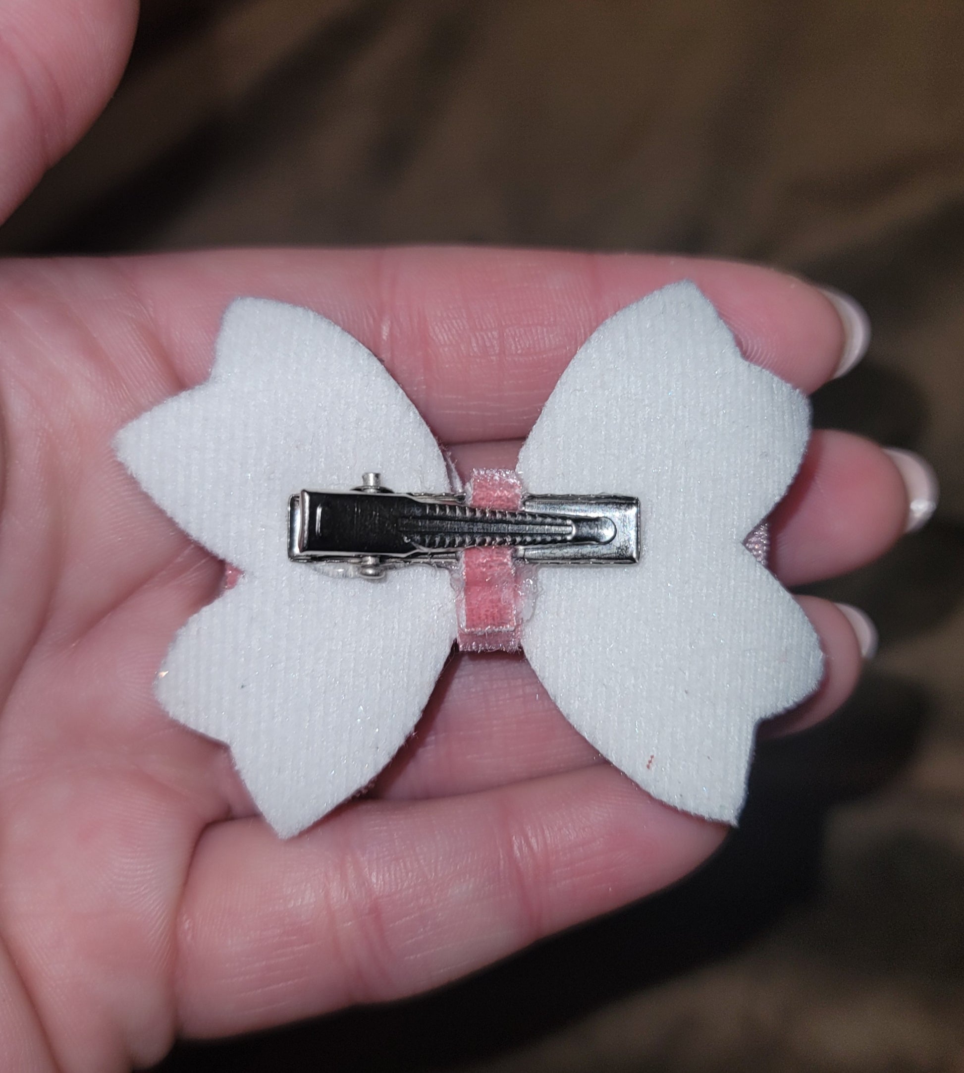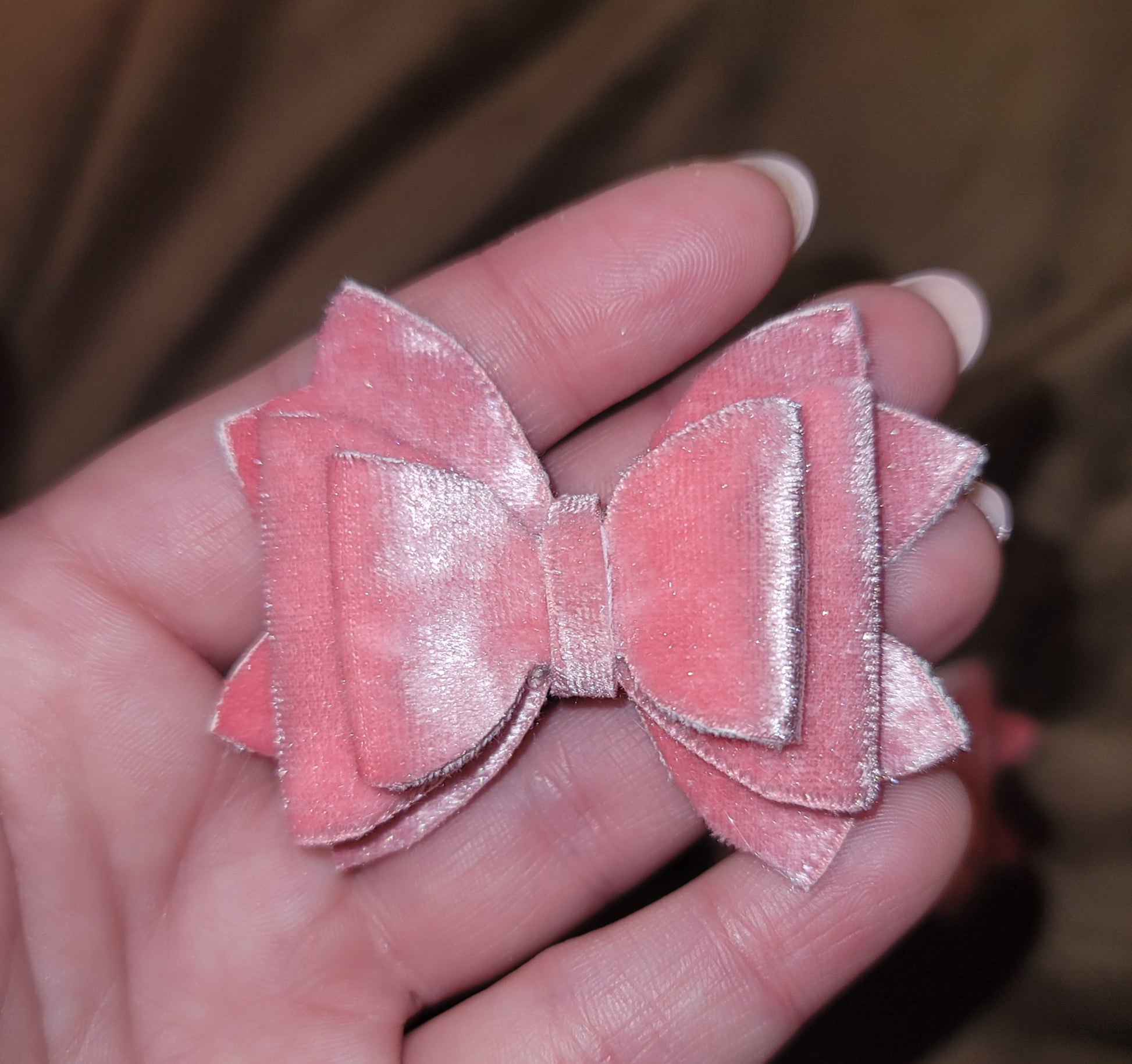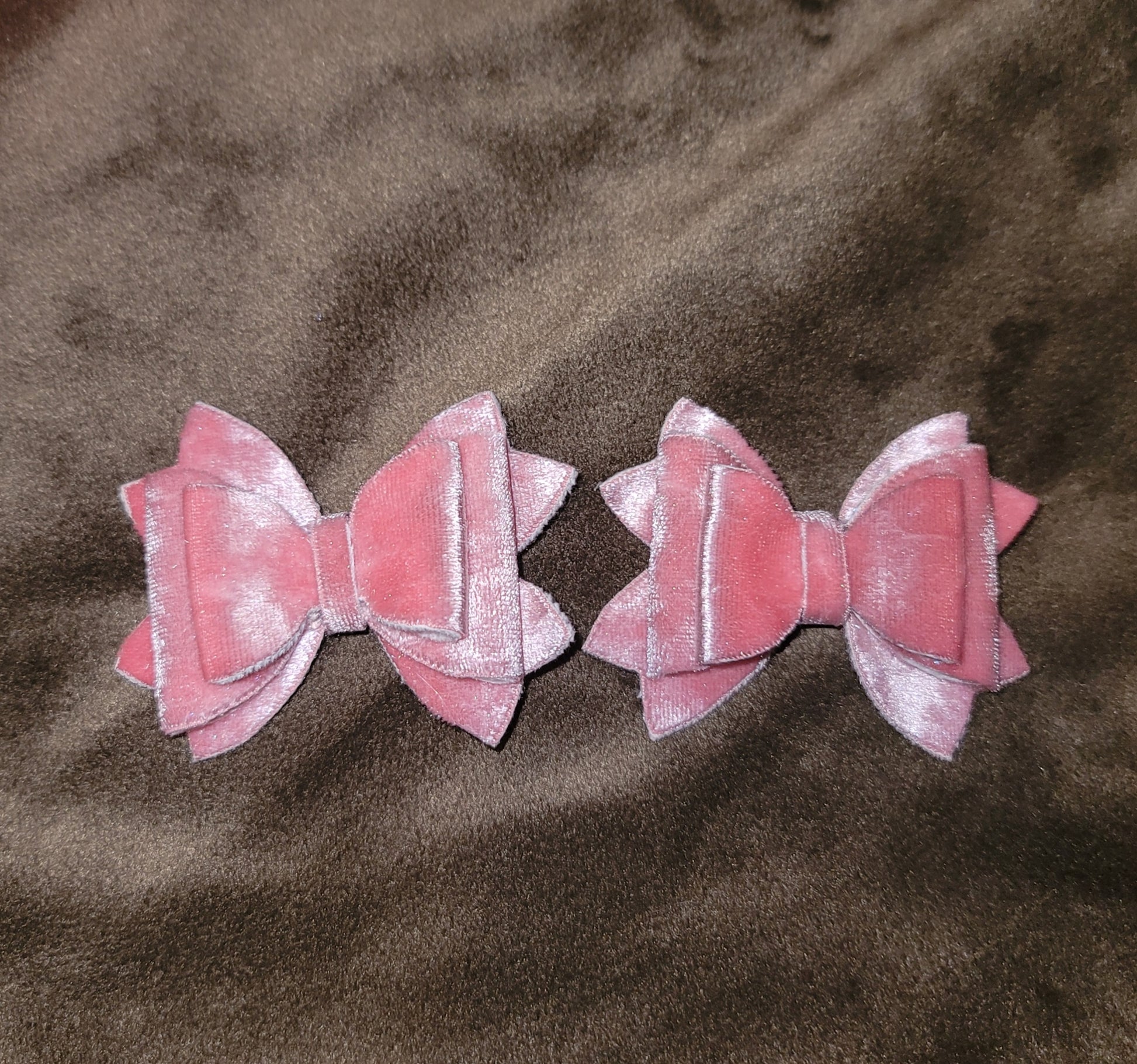 Light Pink velvet material. 2.5 inch Lou Lou style bows. Secured on alligator clips.