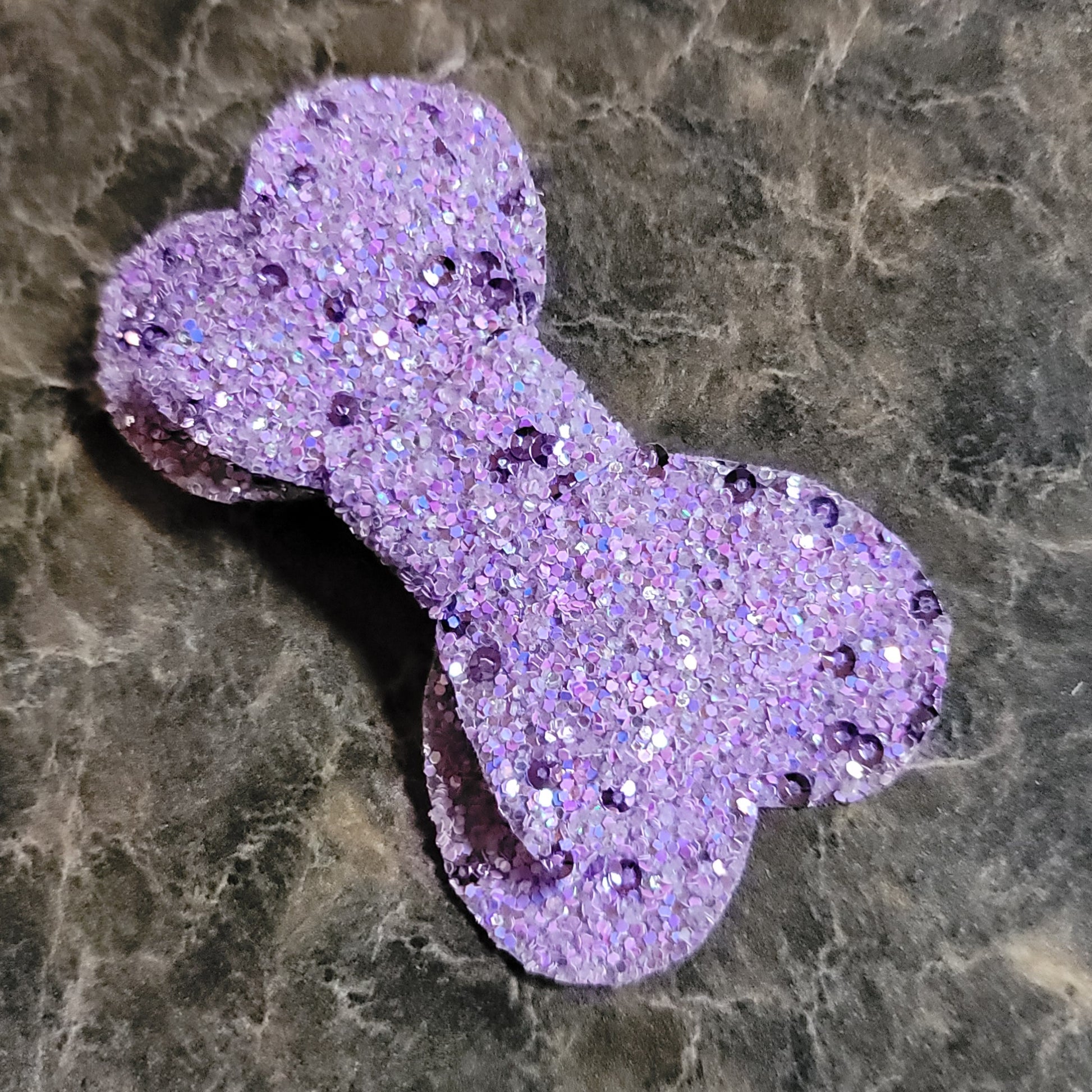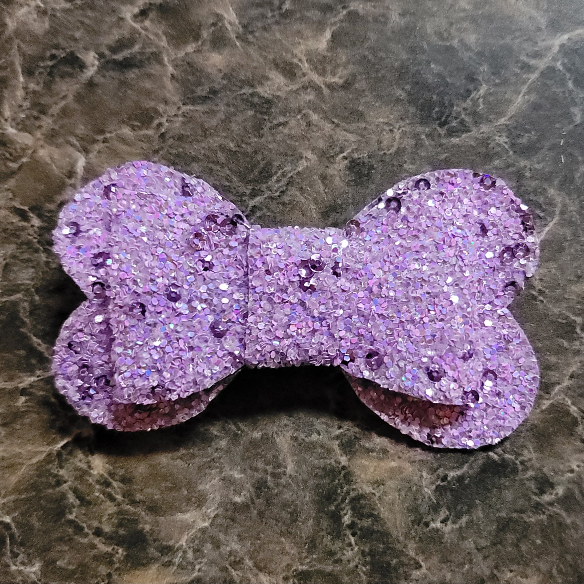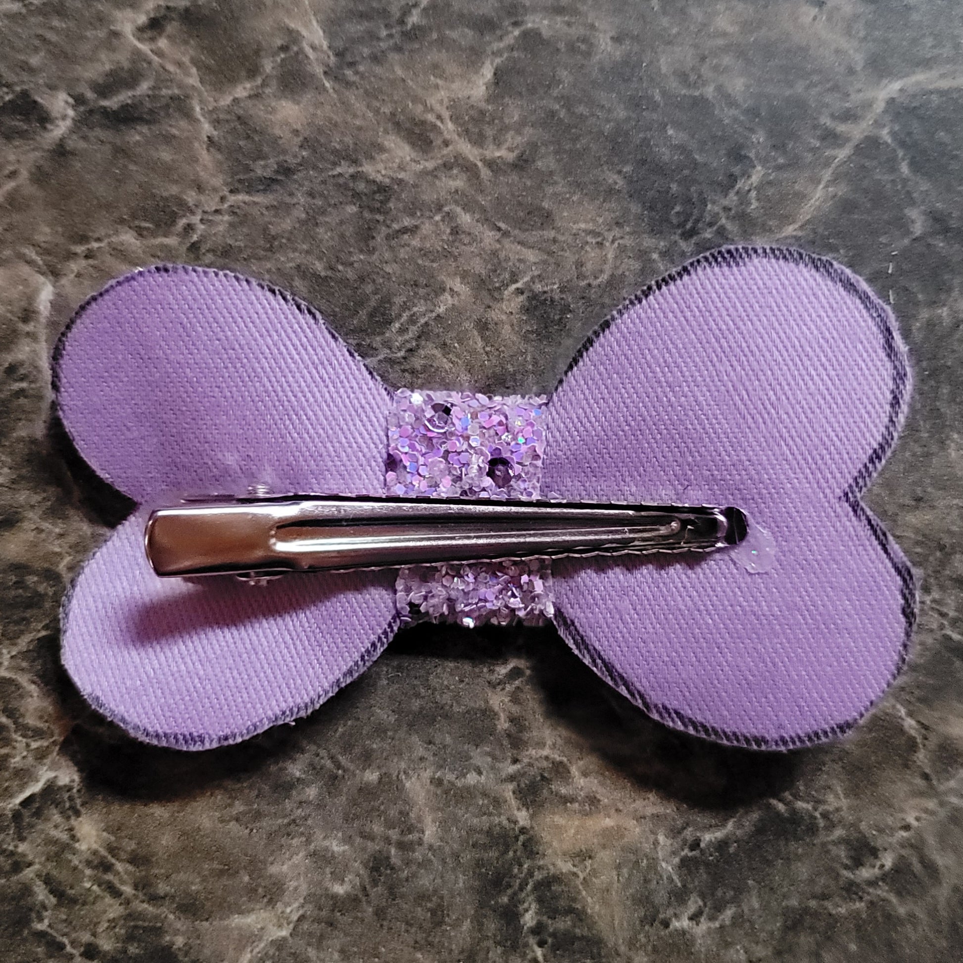 Light purple glitter material with soft backing. Bow secured on an alligator clip.
