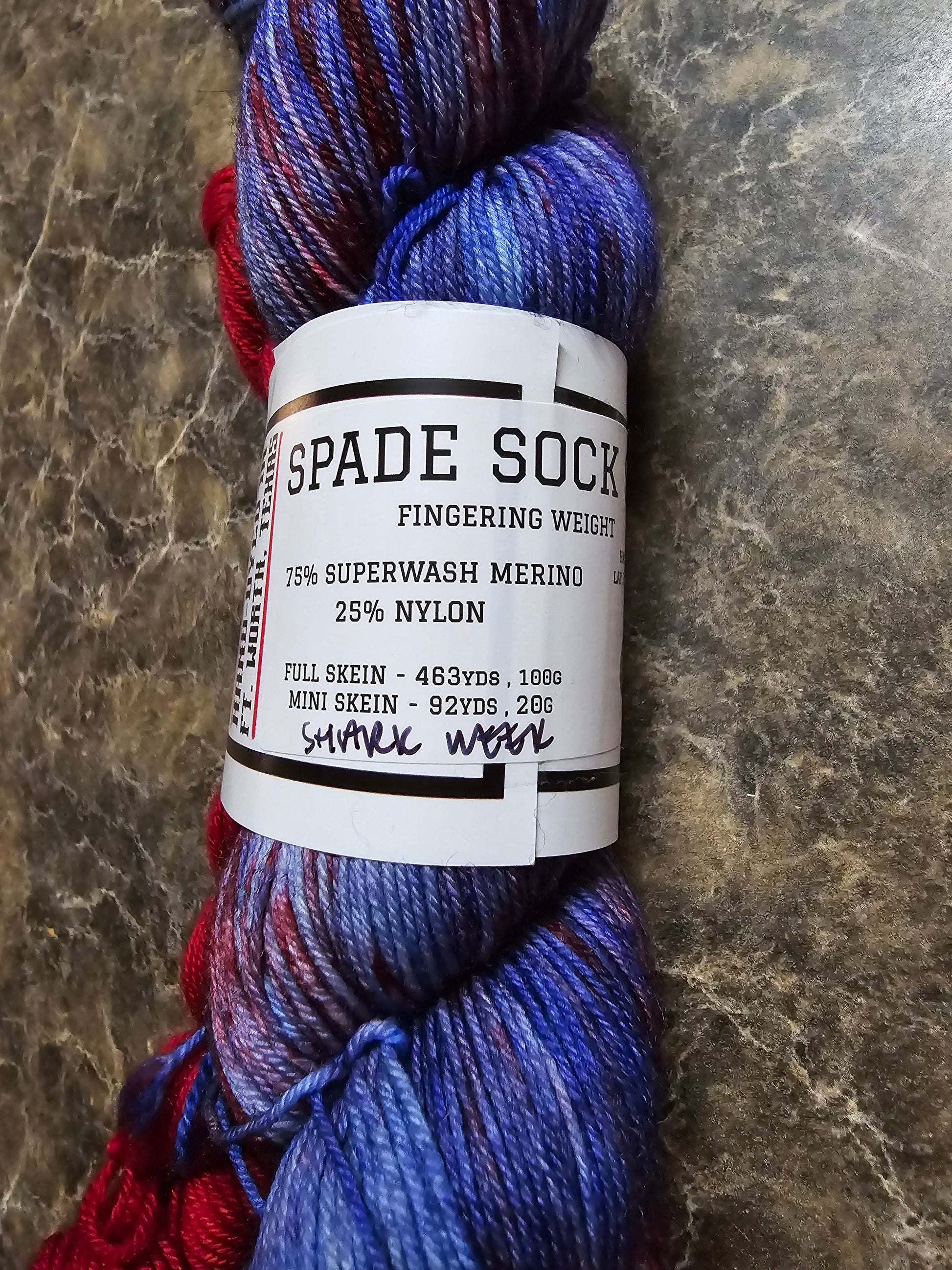 Yarnbase: Spade Sock. Fingering weight 75/25 Superwash Merino/Nylon. 555 total yards.