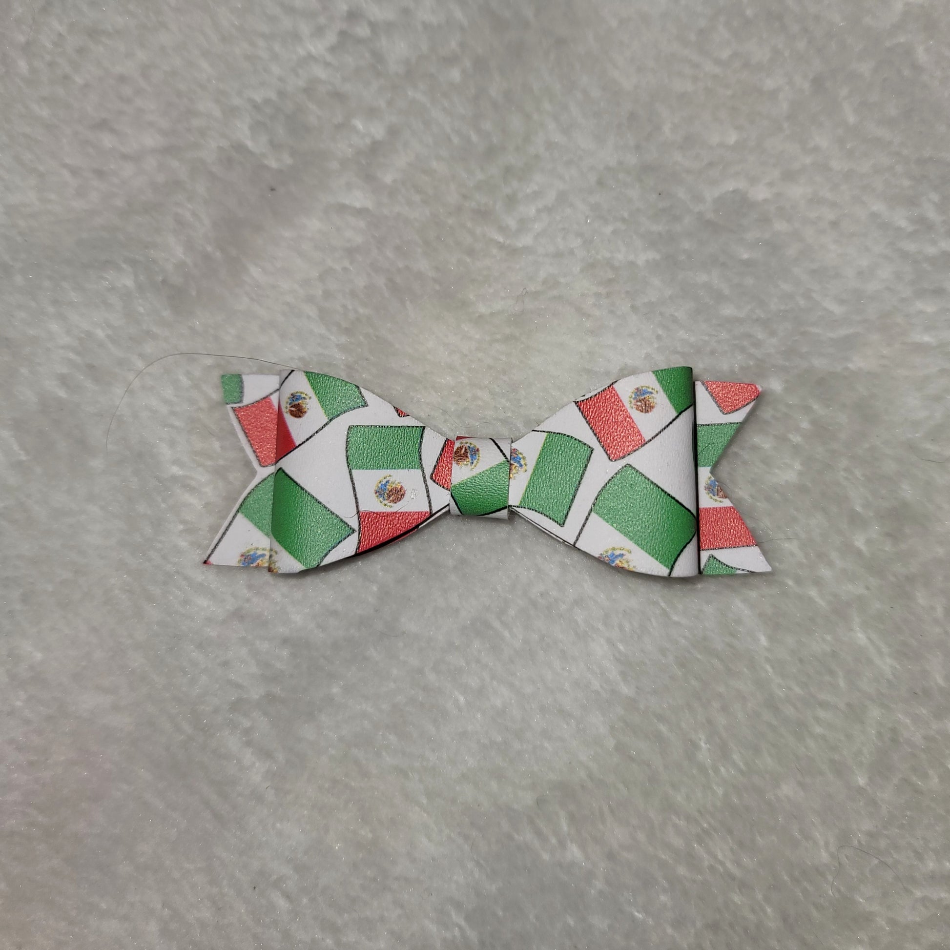 Mexico flag print faux leather, single stack small bow secured on an alligator clip.