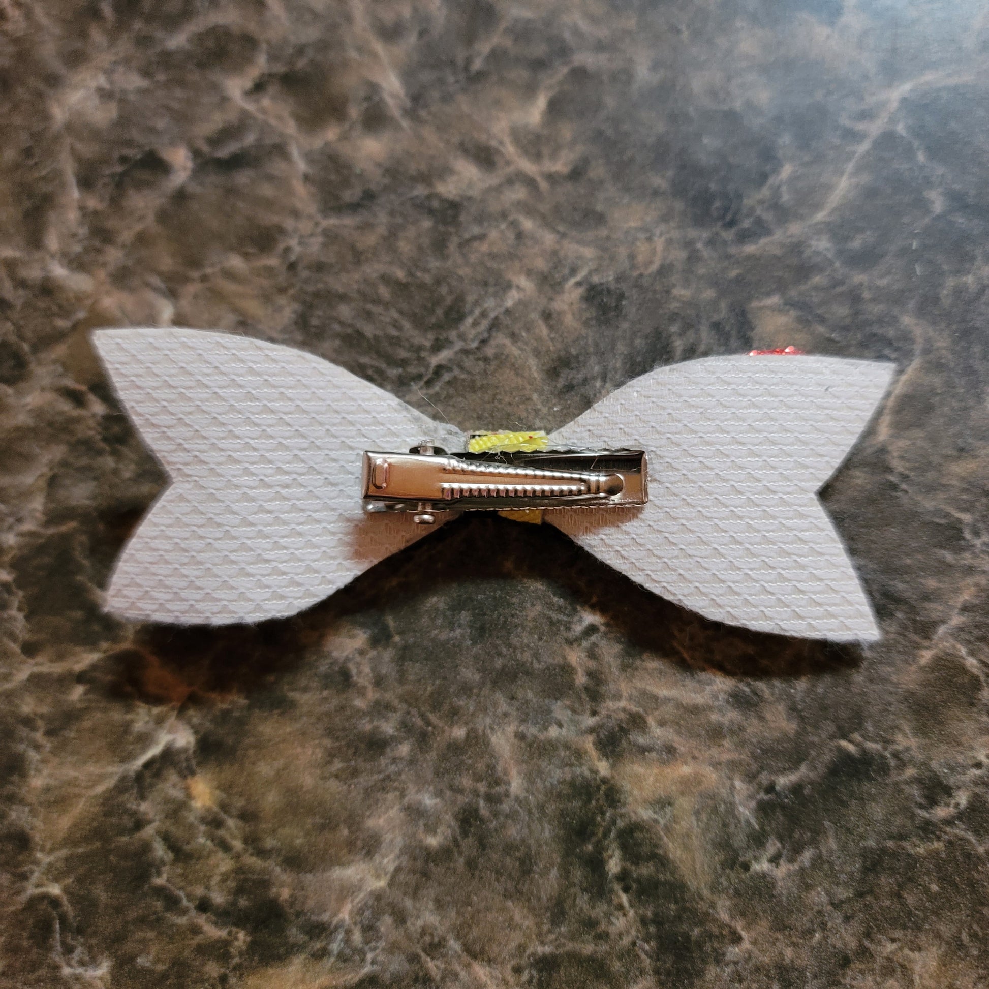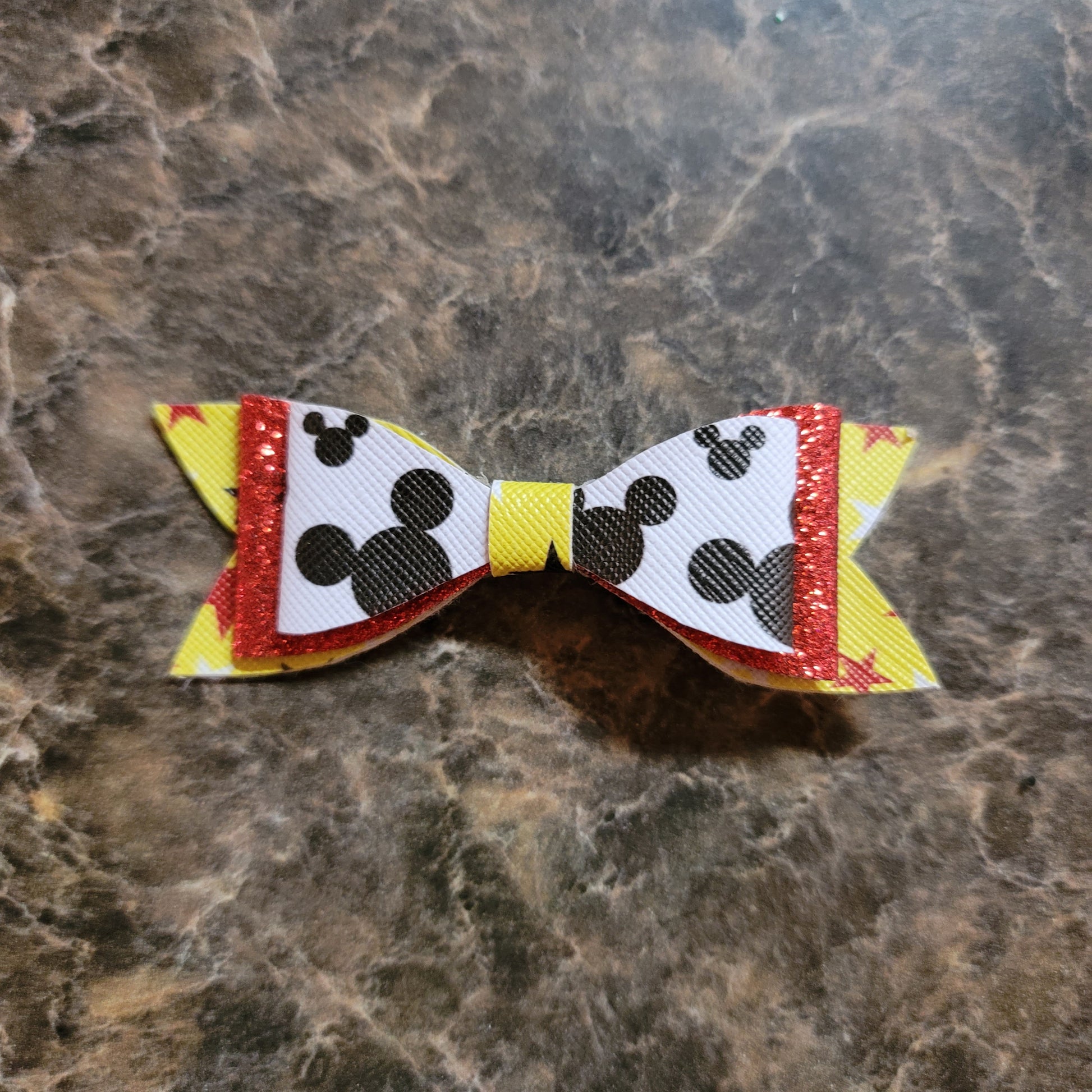 Mickey Mouse faux leather, red and yellow glitter material. Small double stack bow secured on an alligator clip.