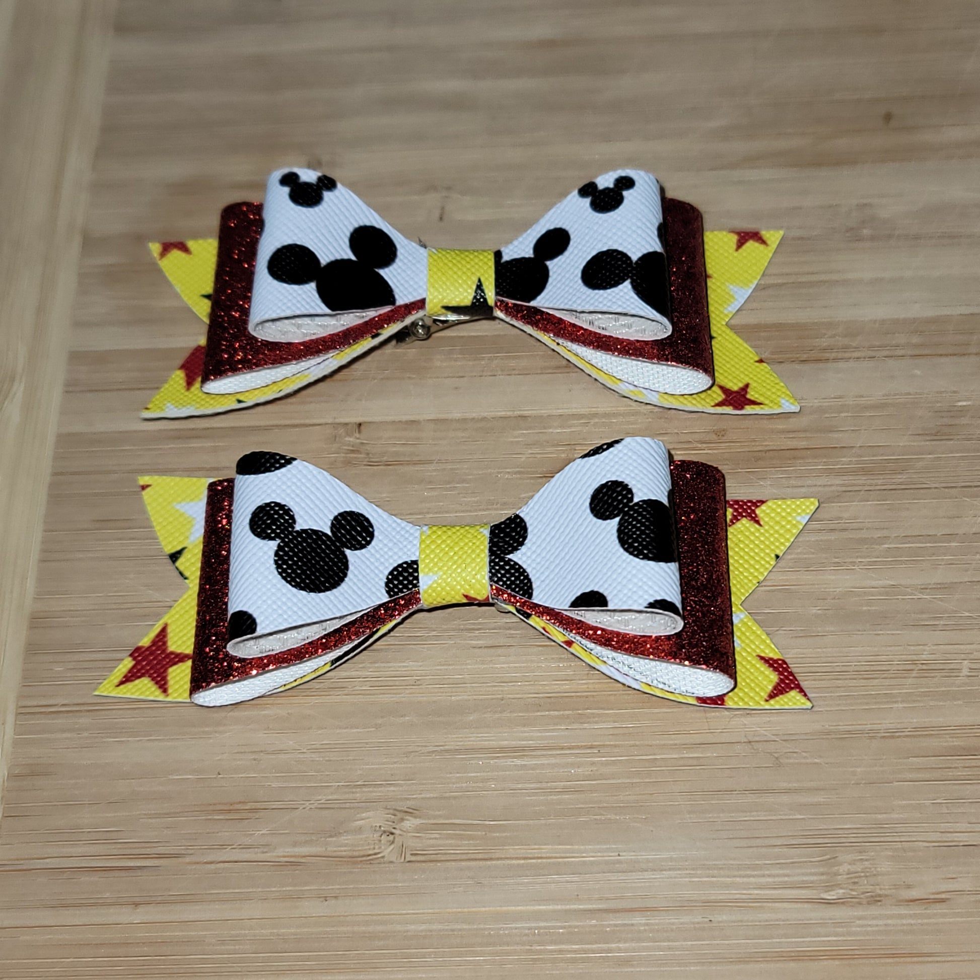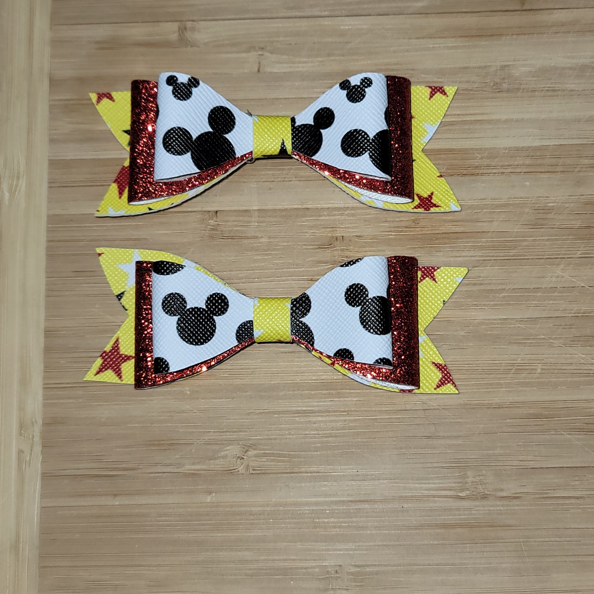 Faux leather Mickey Mouse, red glitter and yellow with stars double stack small bow set secured on alligator clips.