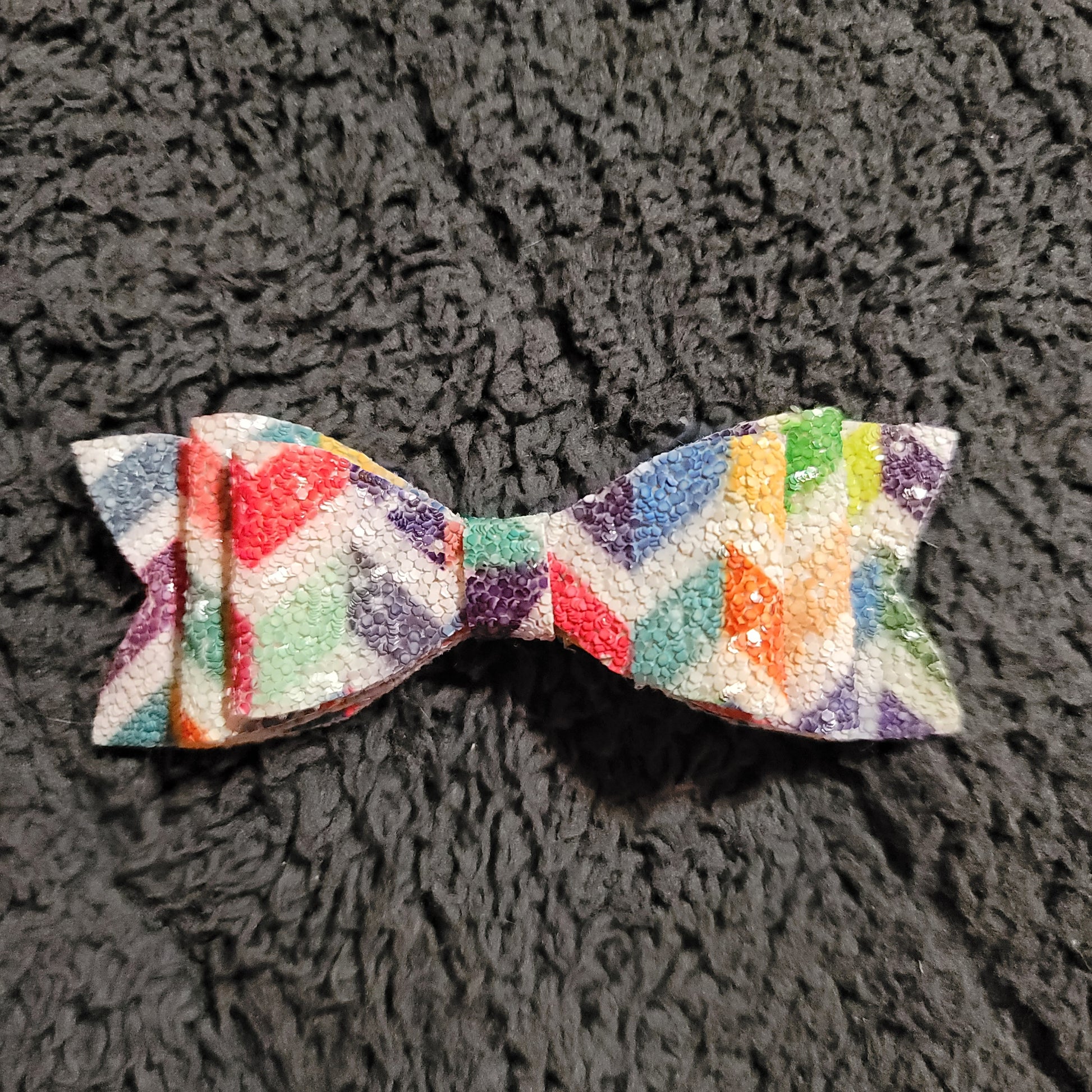 Multicolor chevron glitter faux leather double stack bow secured to an alligator clip.