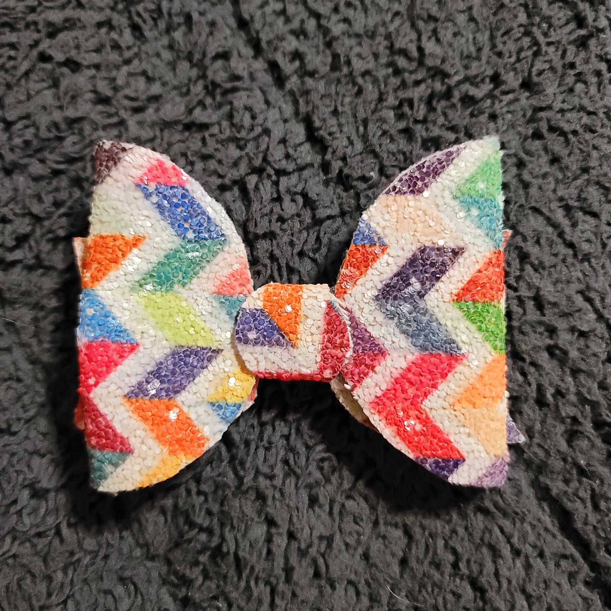 Multicolor chevron glitter print faux leather bow secured to an alligator clip.