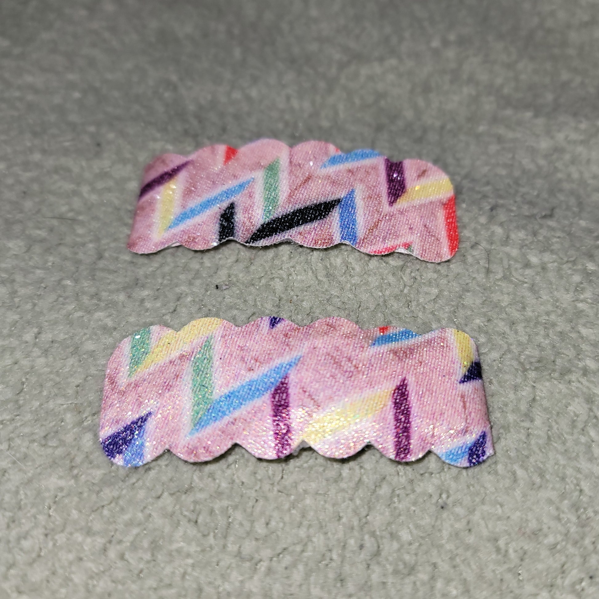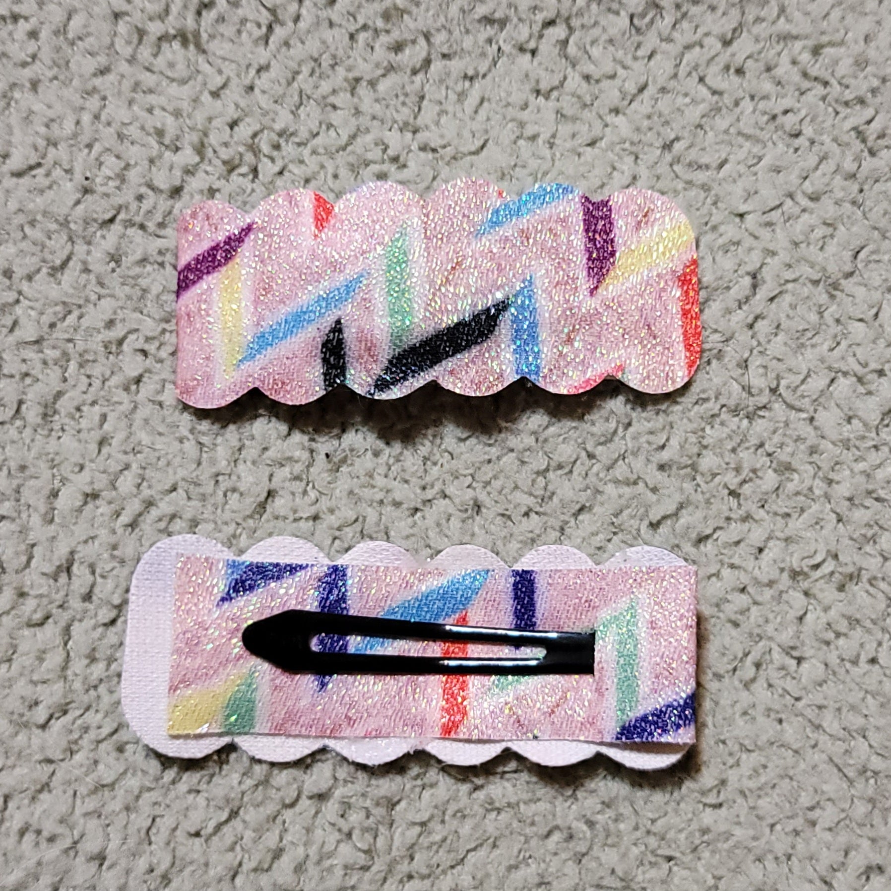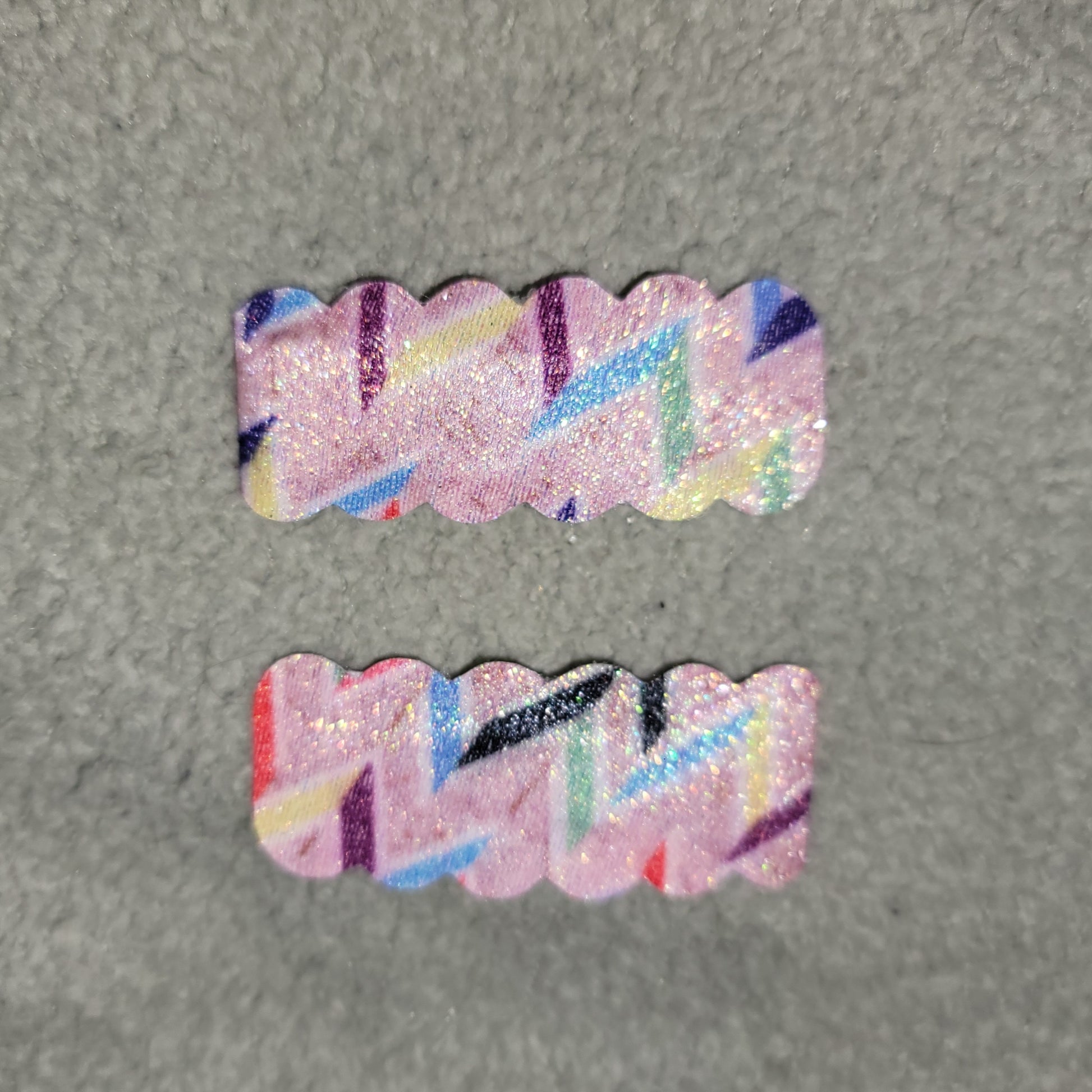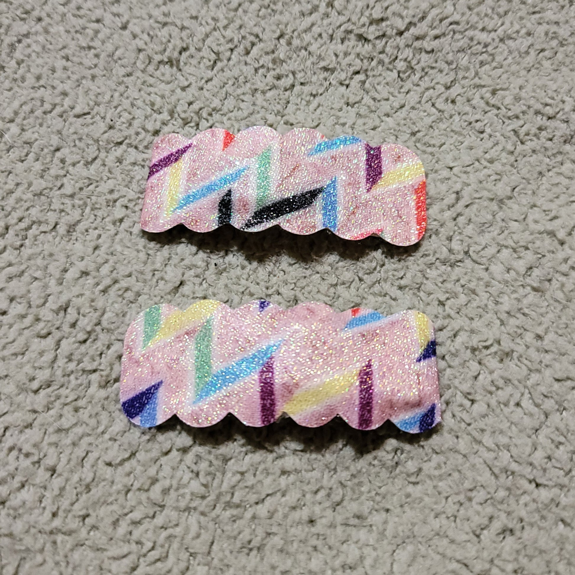 Multicolor chevron glitter material with soft backing. Secured on 2 inch snap clips.