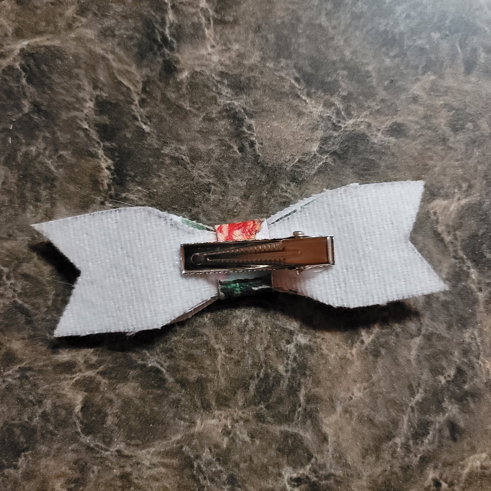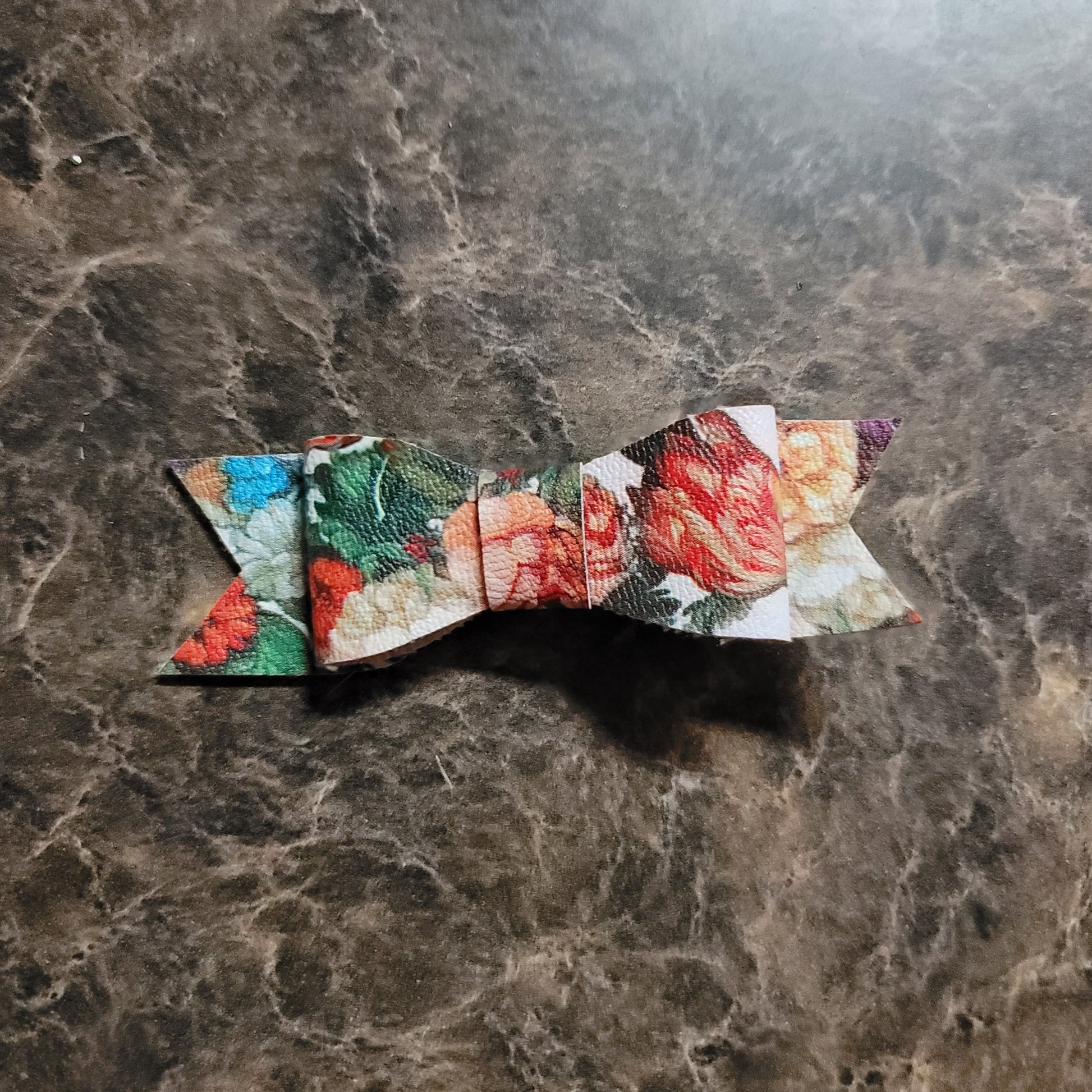 Multicolor floral faux leather. Small bow secured on an alligator clip.