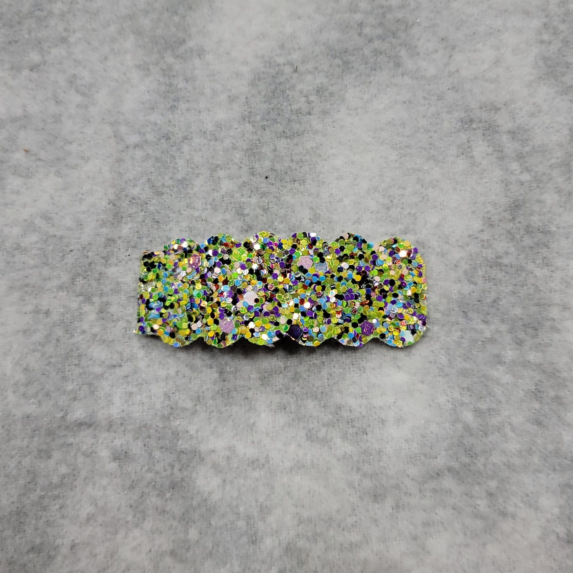Scalloped design, multicolor glitter with soft backing secured on a 2 inch snap clip.