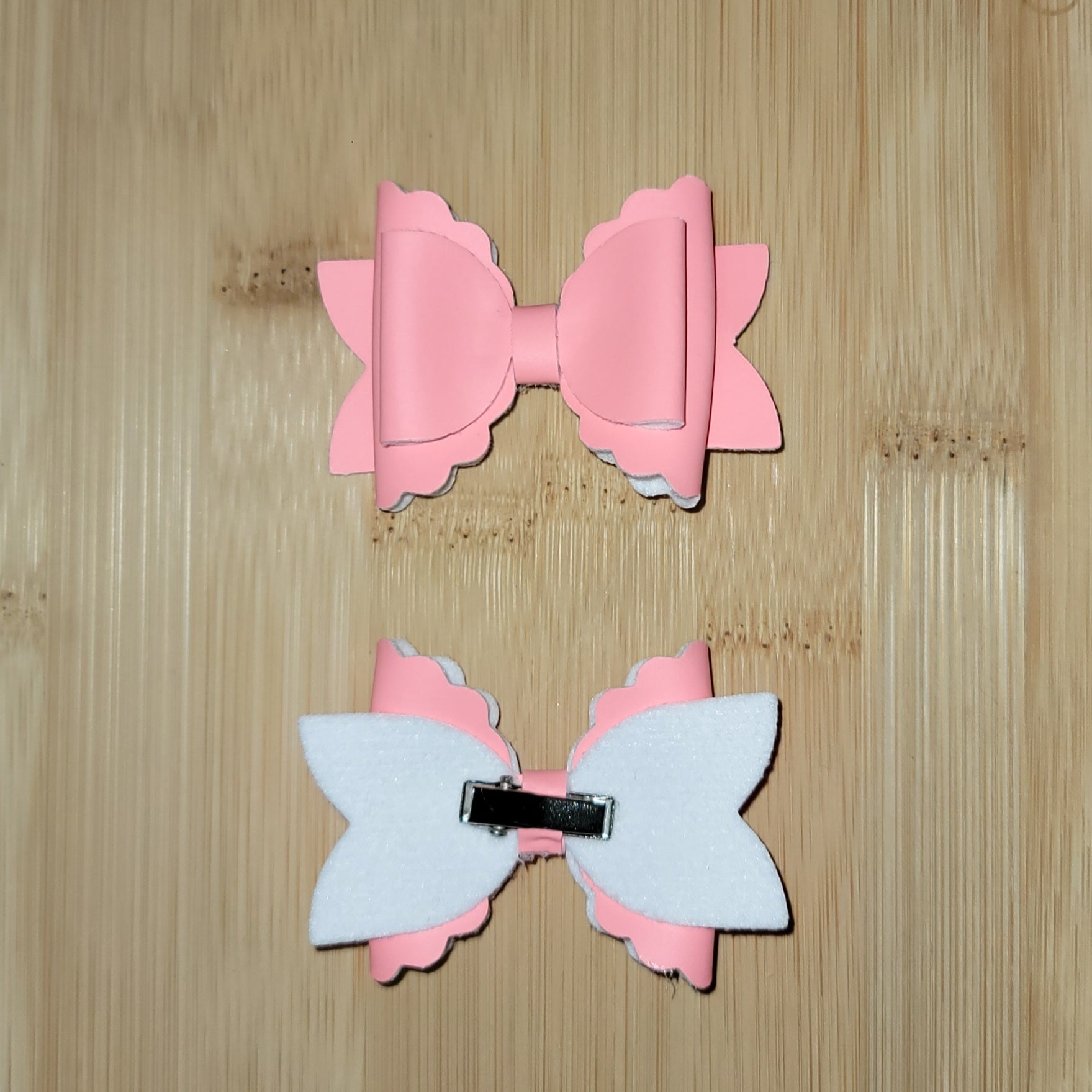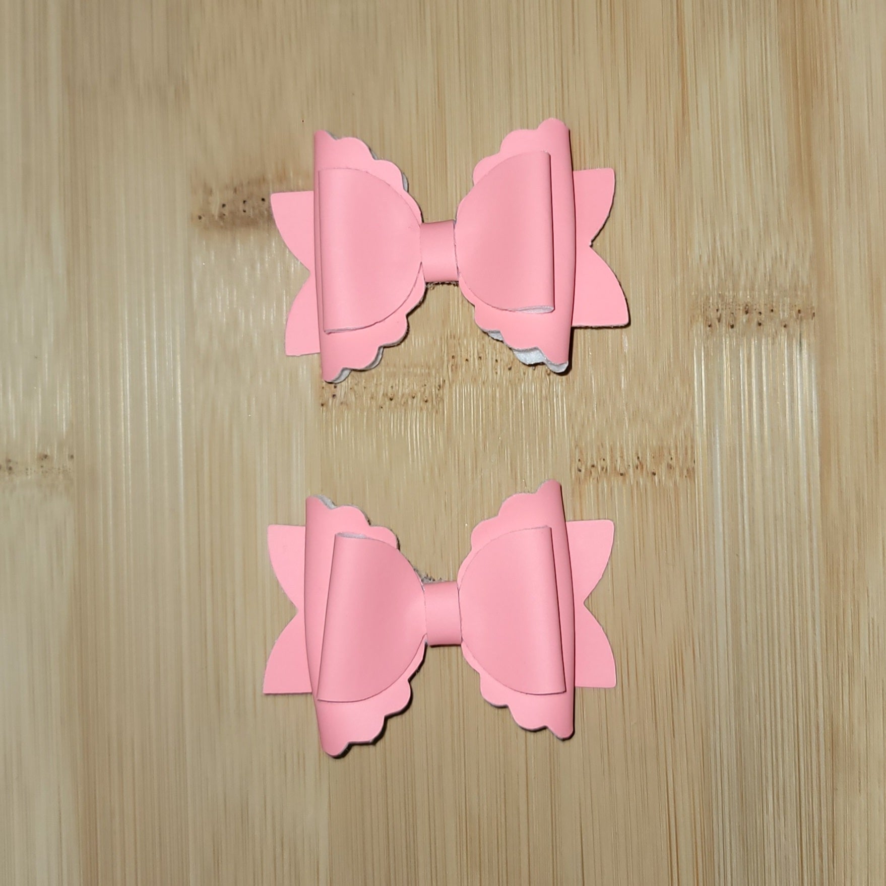 Neon coral faux leather. 2.5 inch piggy style bows secured on alligator clips.