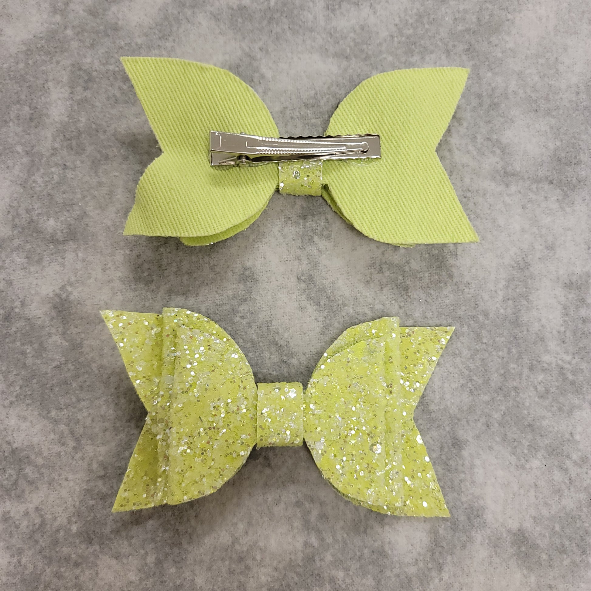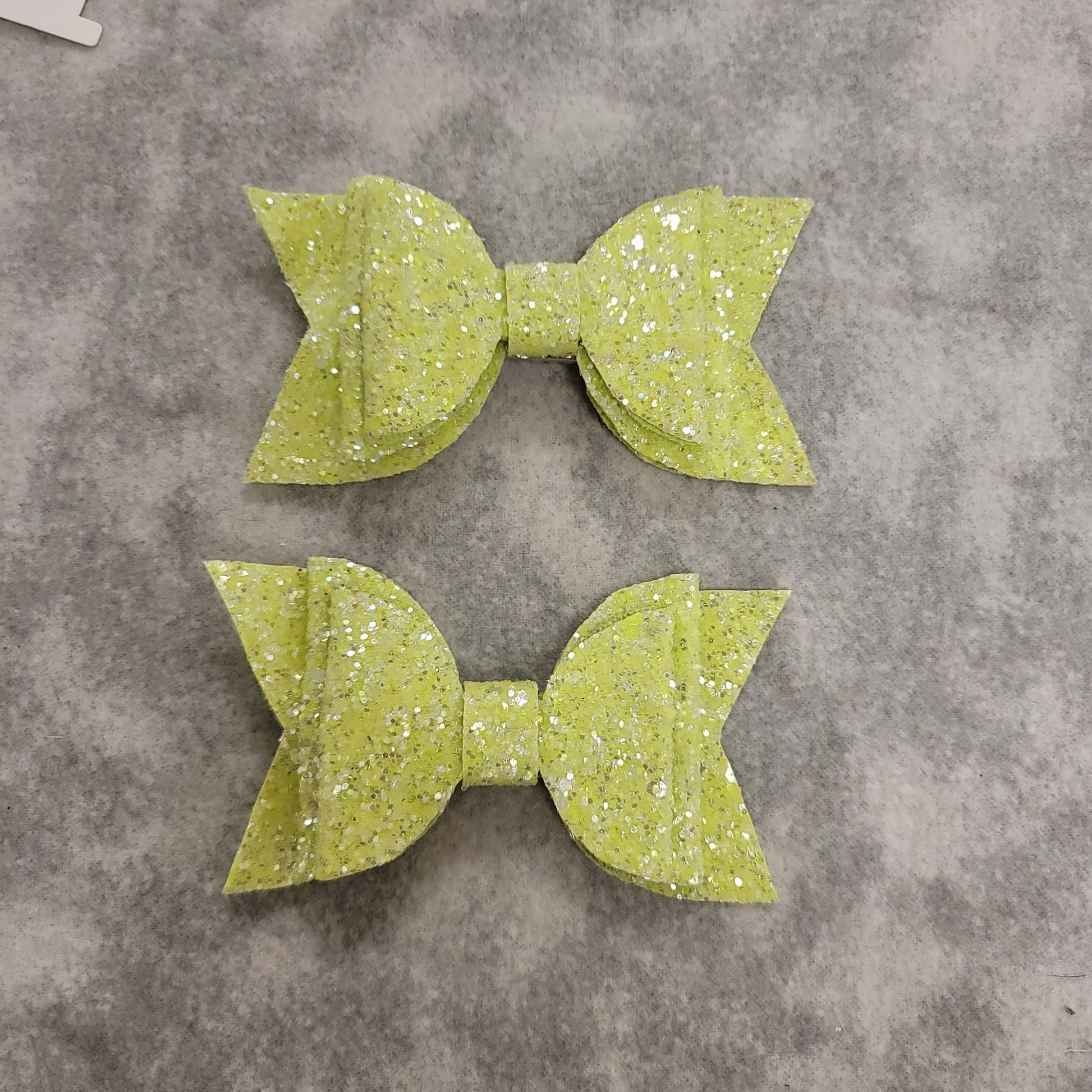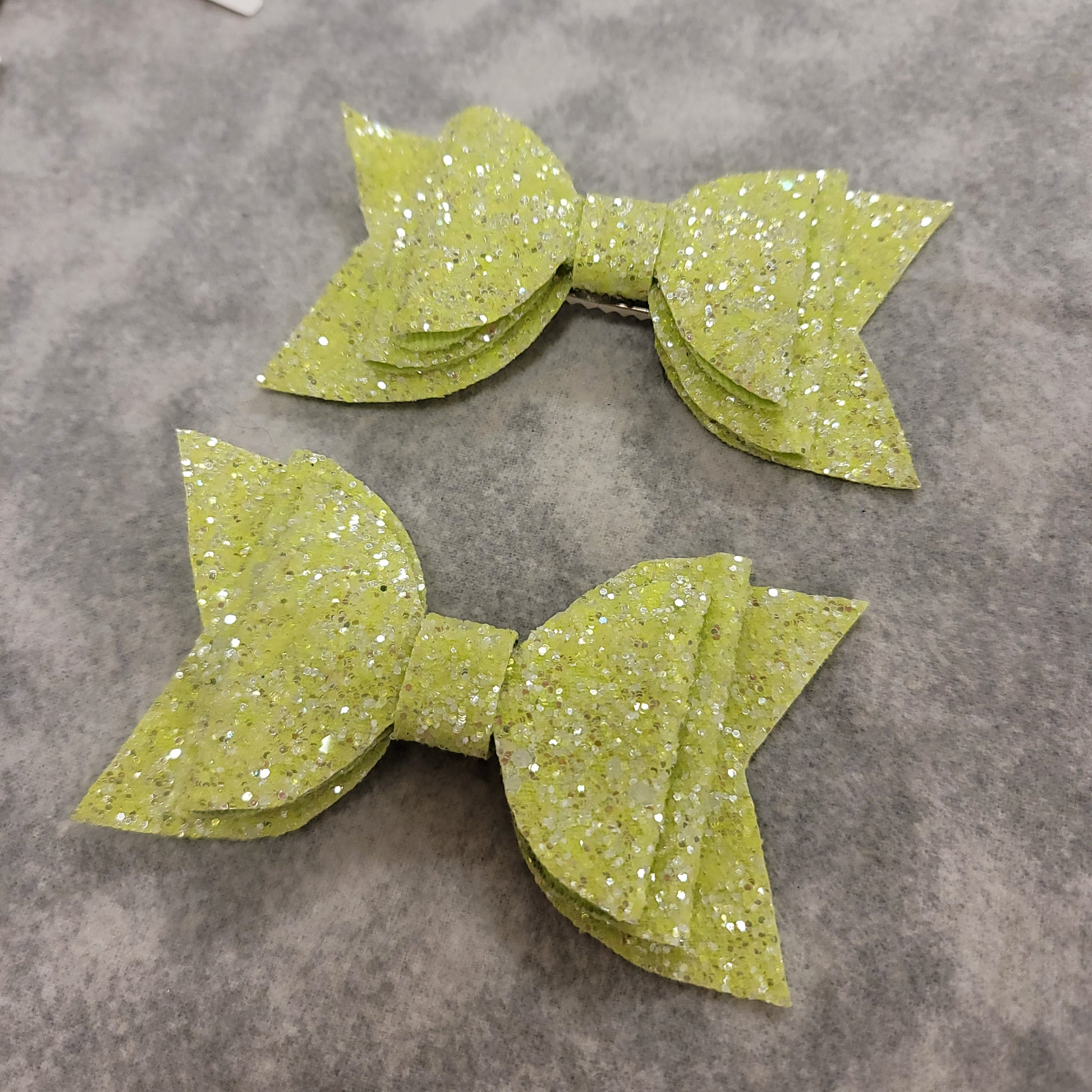 Neon yellow glitter material with soft backing. Double stack large bow secured on an alligator clip.