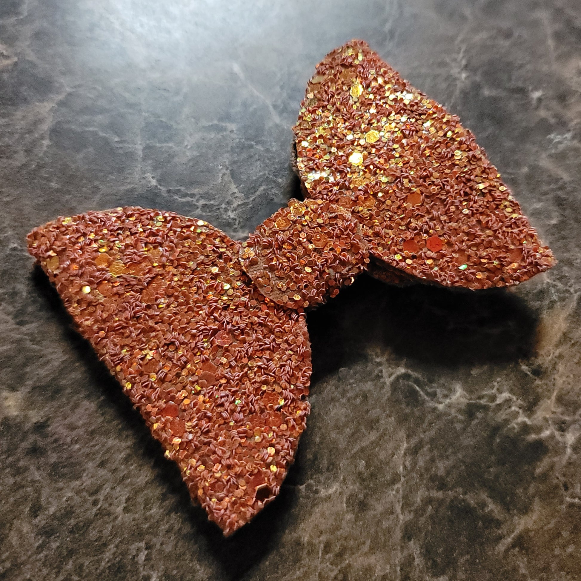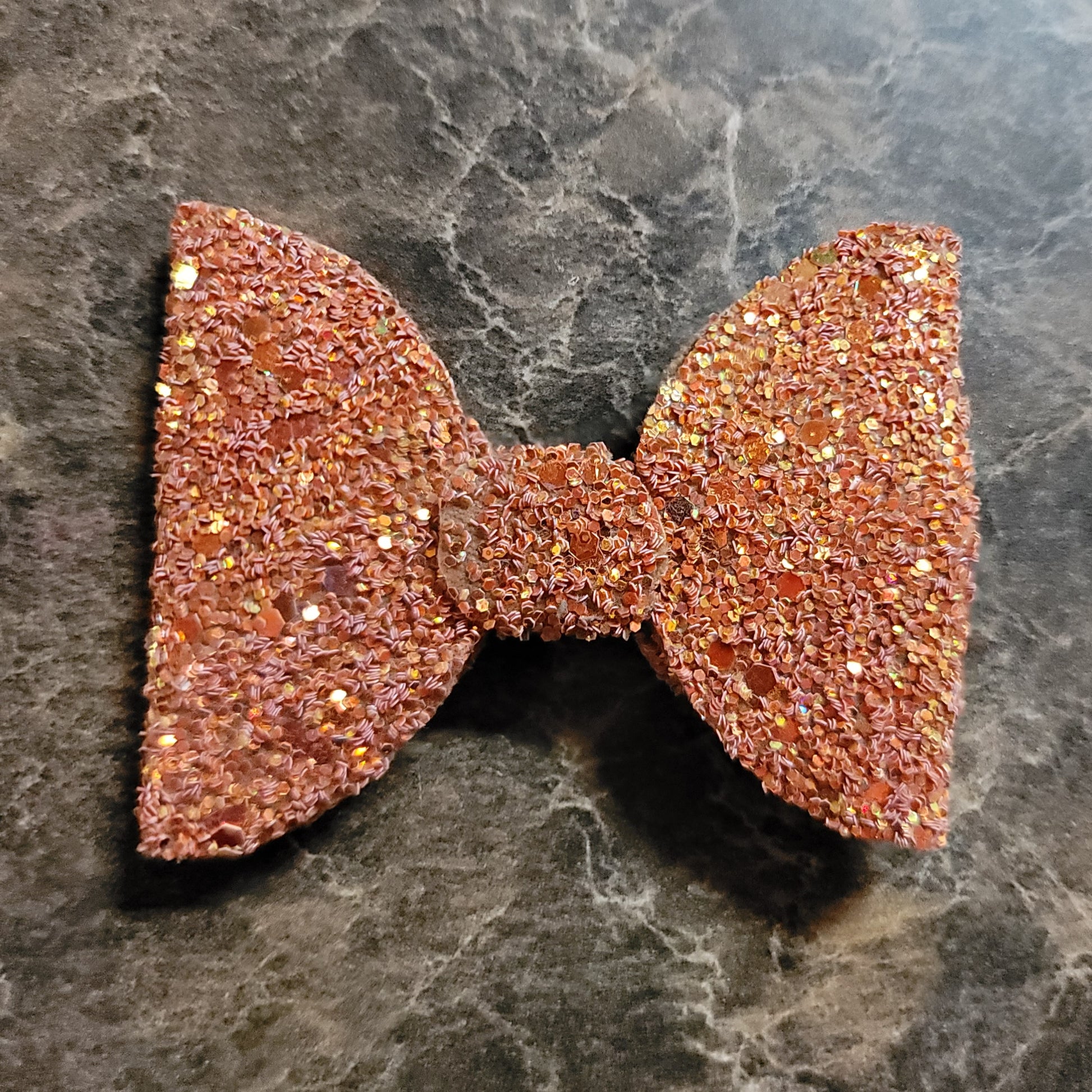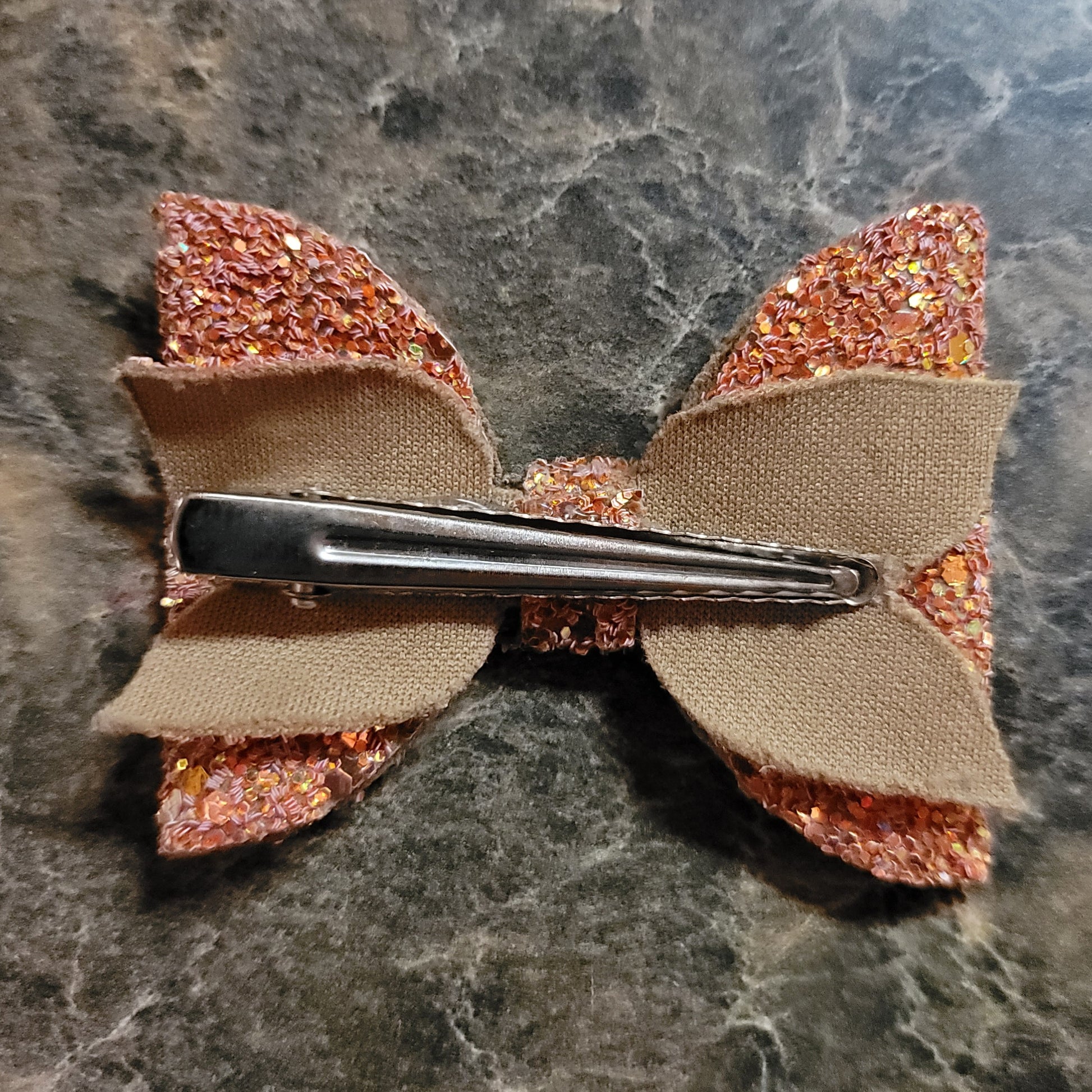 Orange glitter material with soft backing. Medium bow secured on an alligator clip.