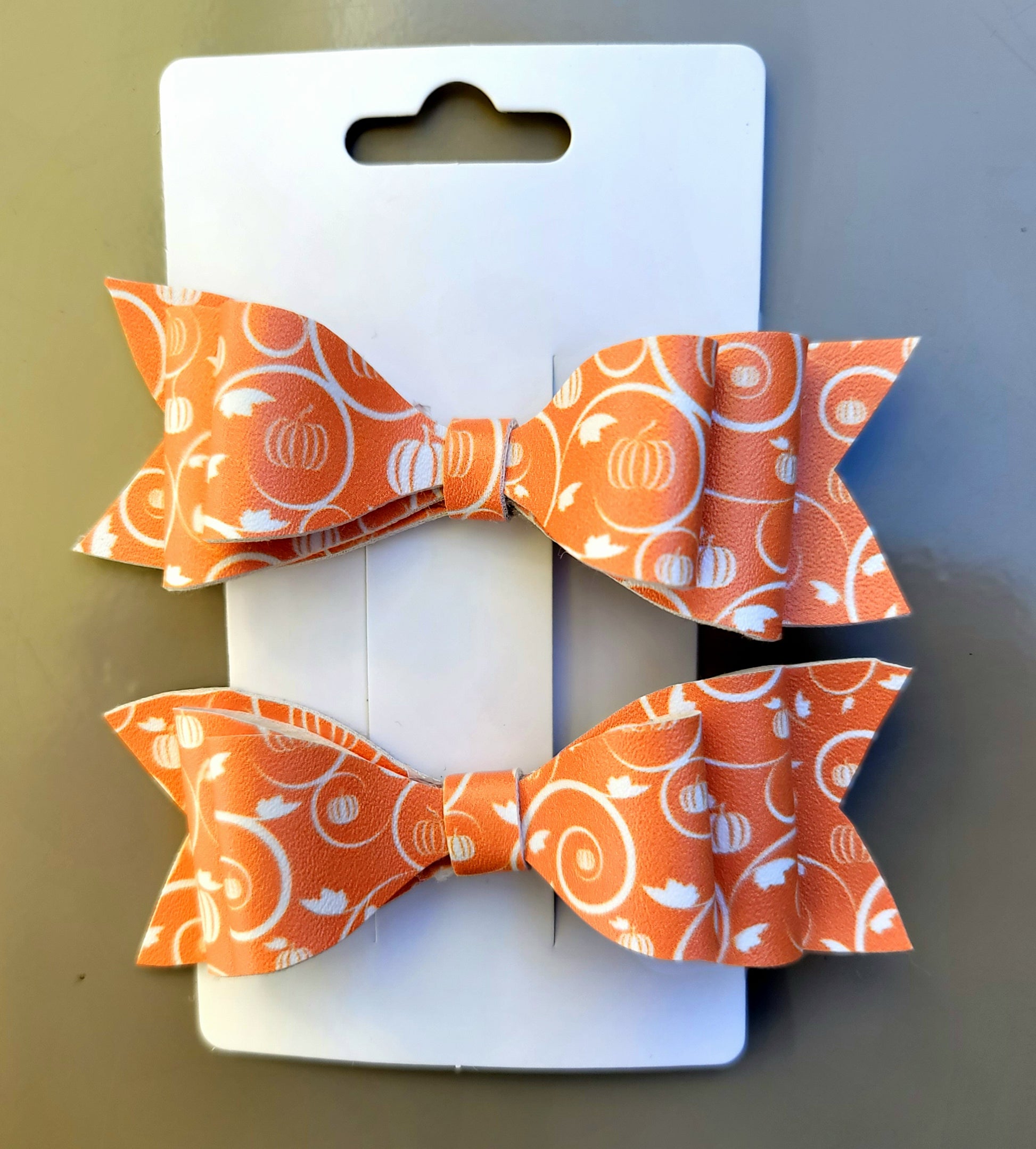 Faux vegan leather, double stack small bow set. Secured to an alligator clip.