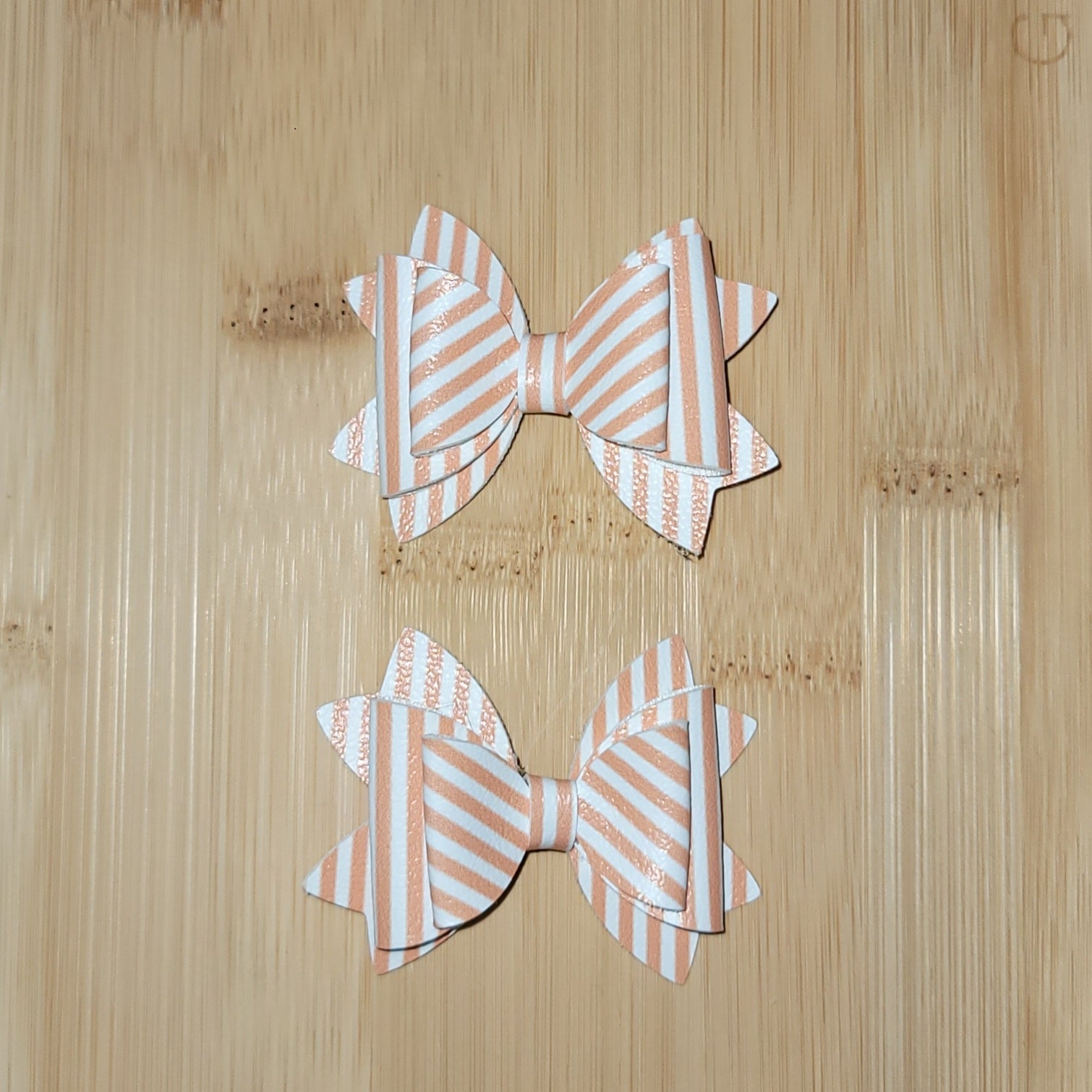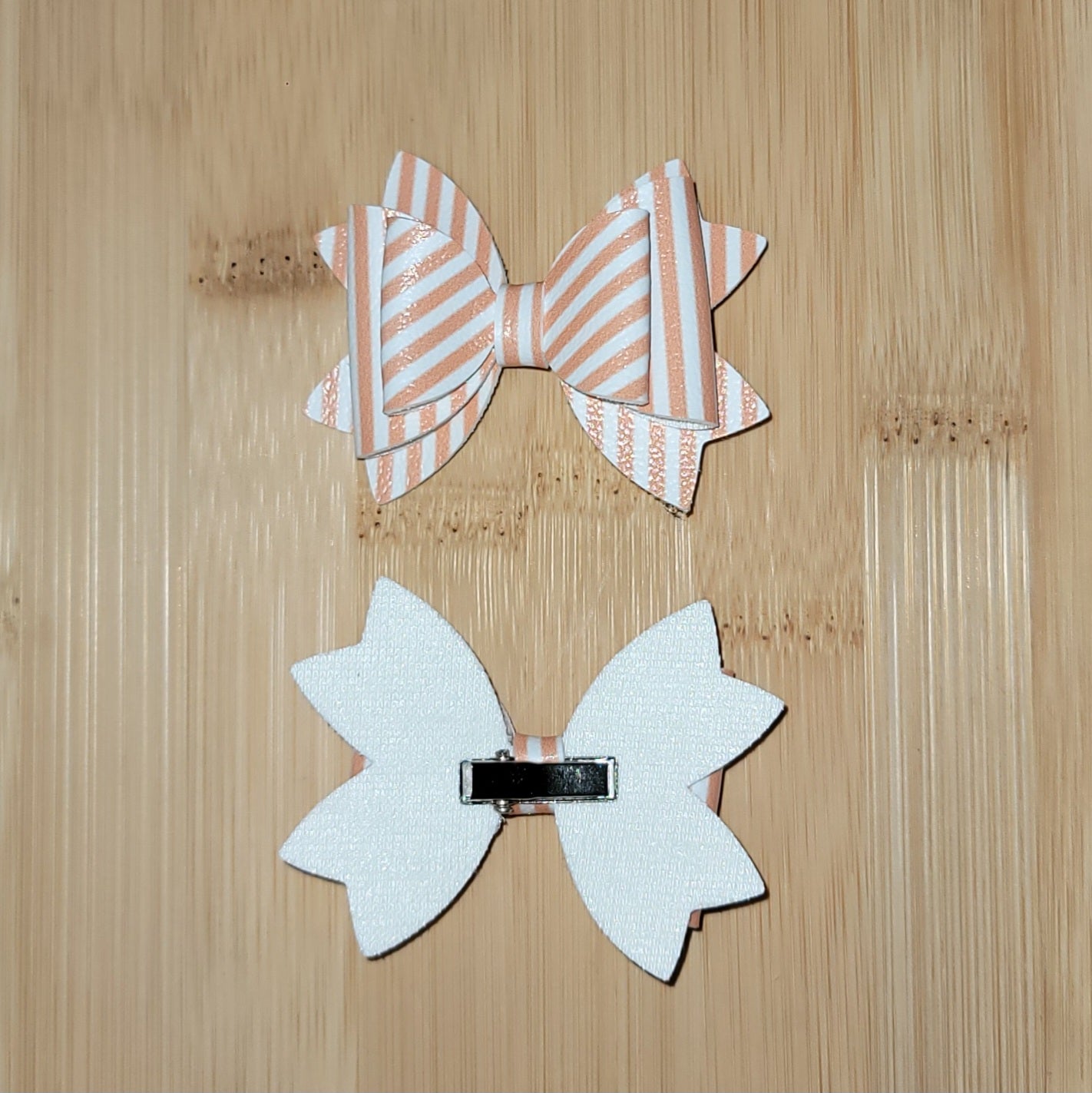 Orange and white striped faux leather. 2.5 inch Lou Lou bows secured on alligator clips.