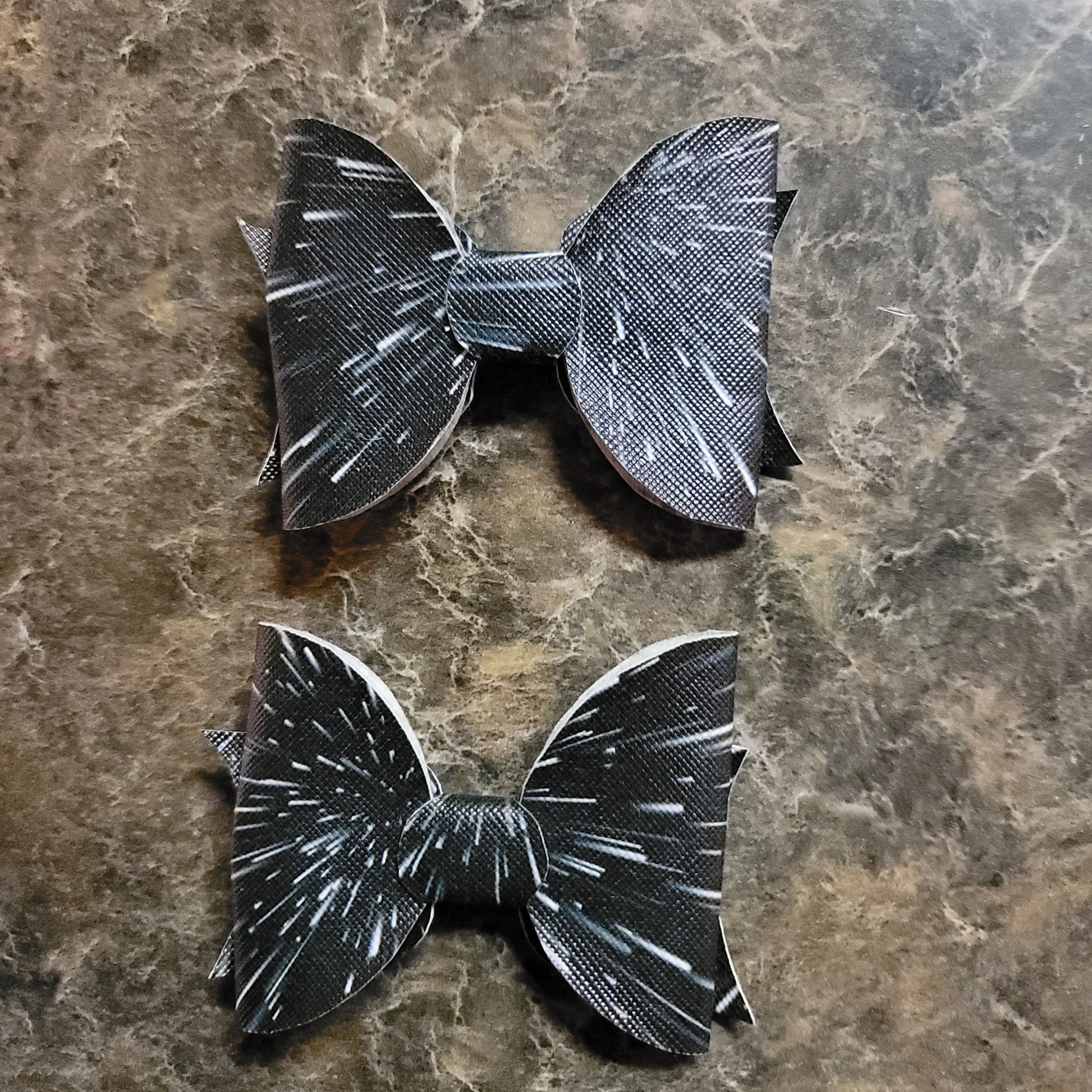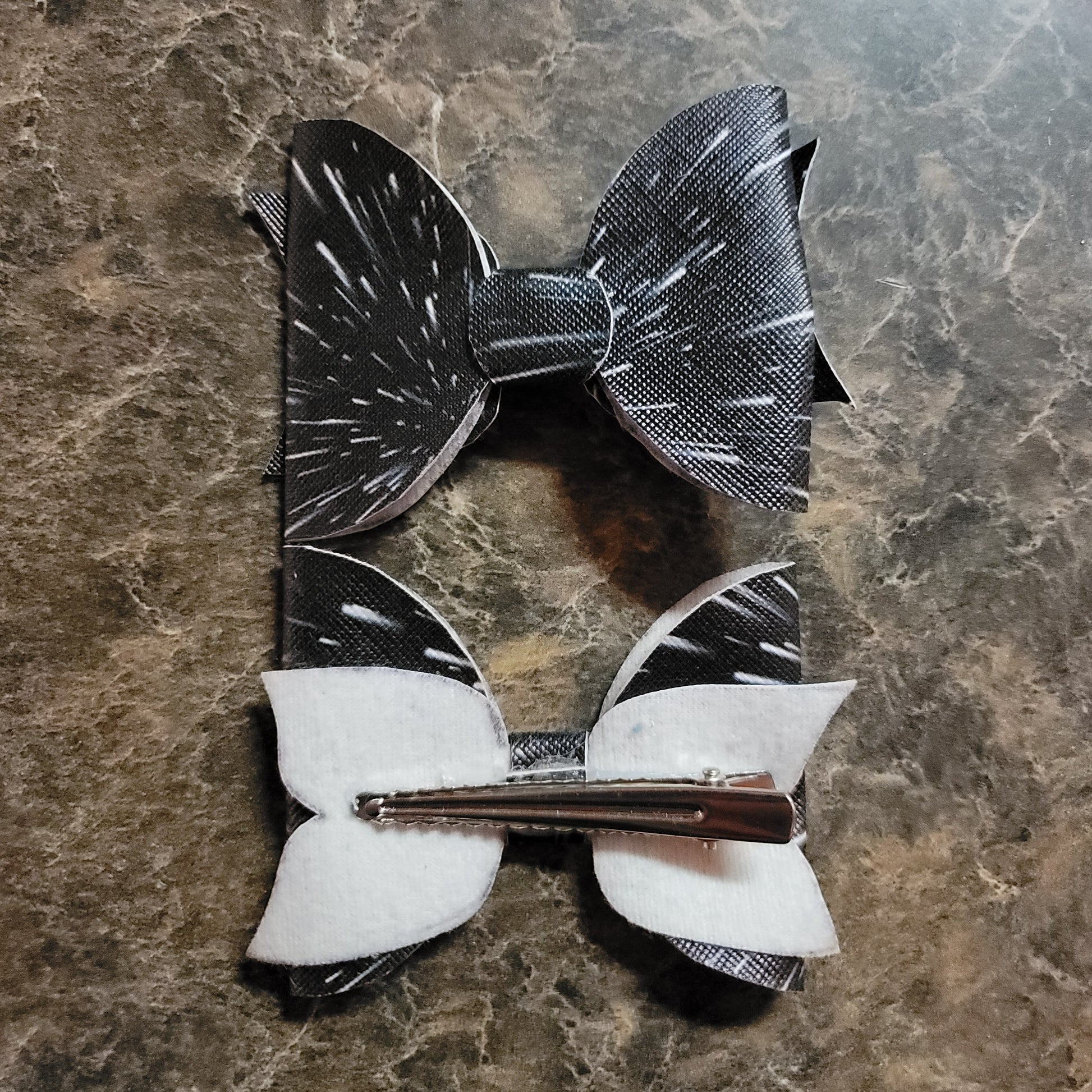 Outer space print faux leather. Medium bow secured on an alligator clip.