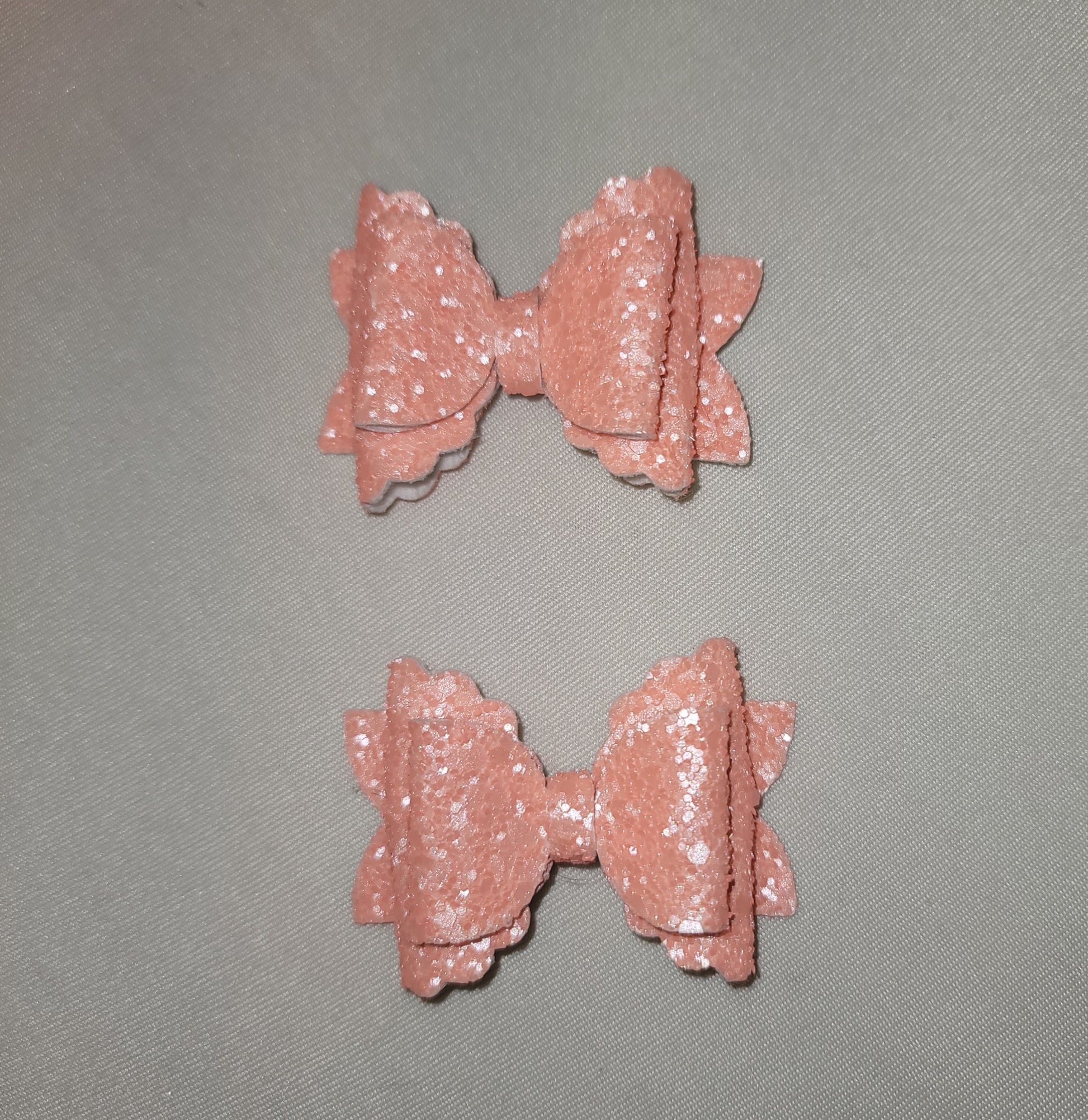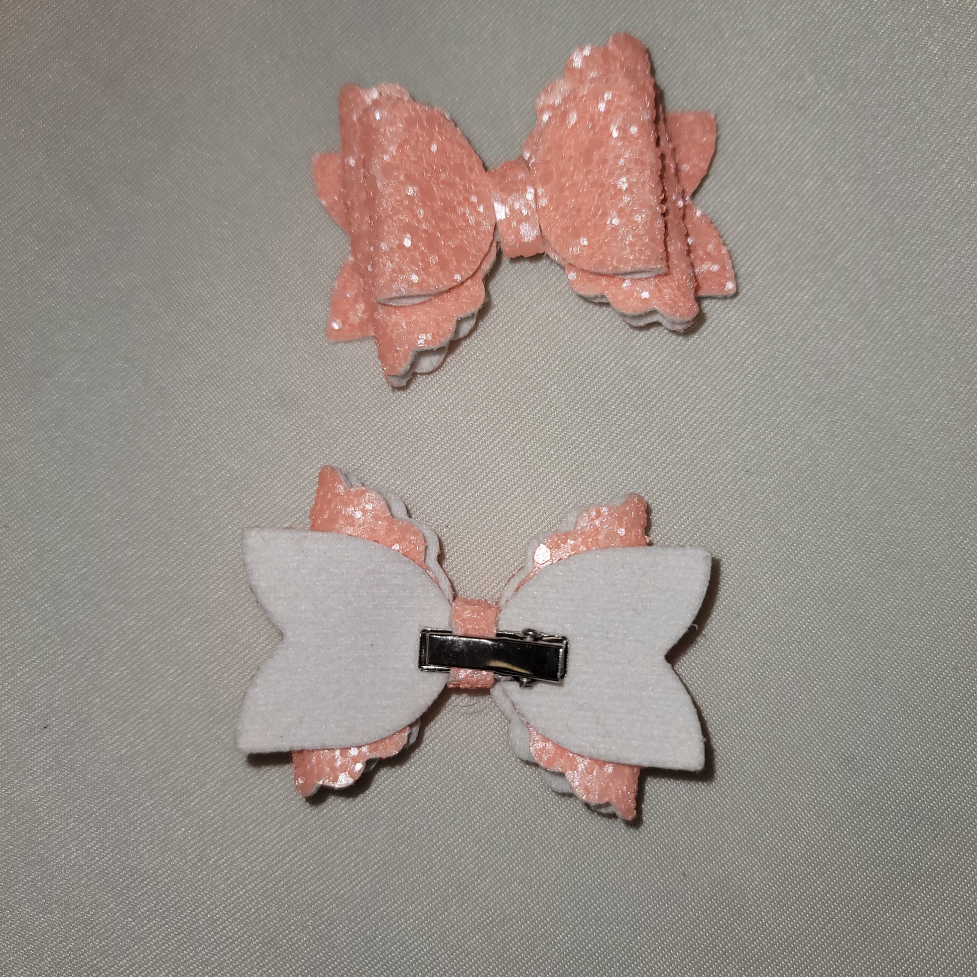 Pastel peach glitter material with soft backing. 2.5 inch piggy bows secured on alligator clips.