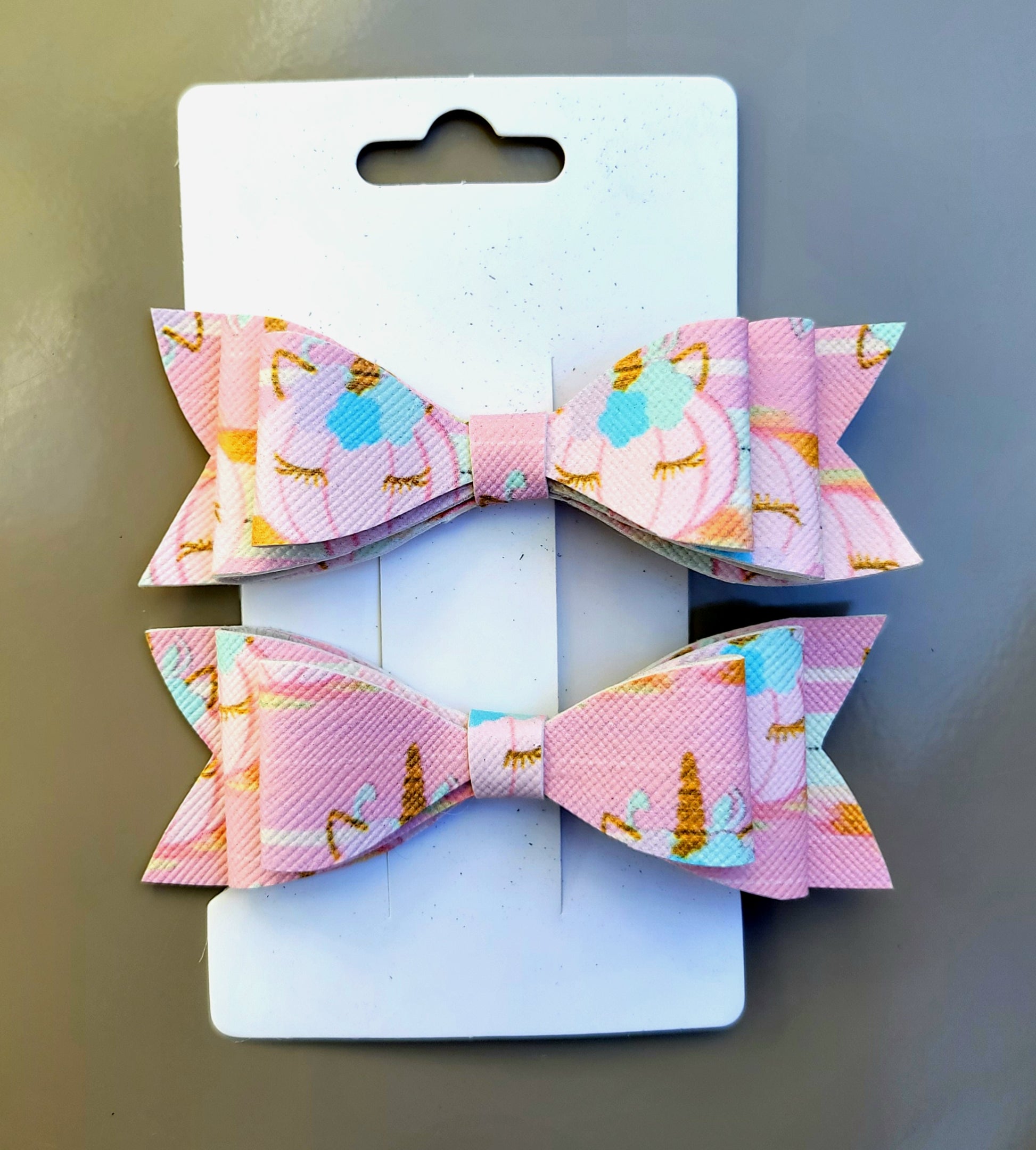 Vegan faux leather. Pastel pink unicorn pumpkin print double stack small bows. Secured to an alligator clip.