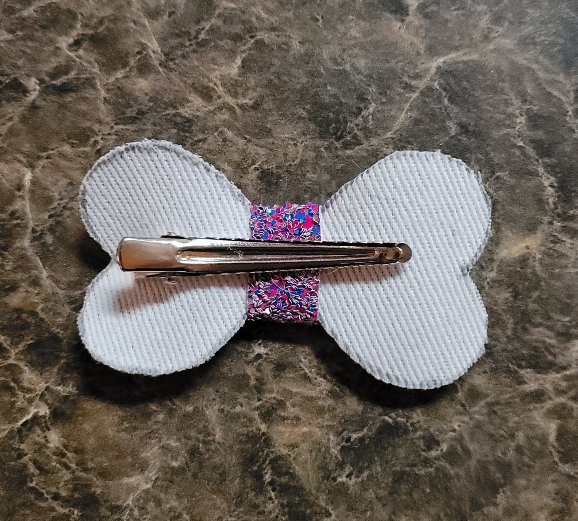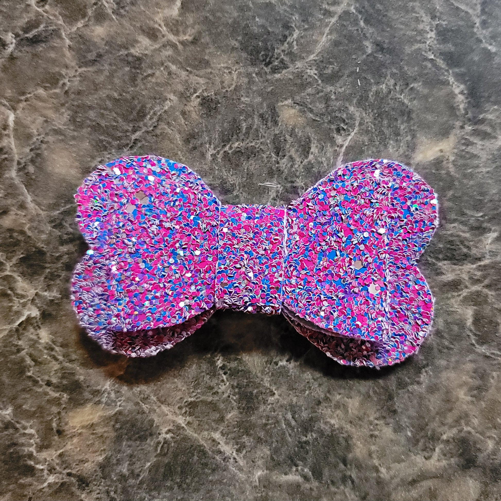 Pink and blue glitter material with soft backing. Bow secured on an alligator clip.