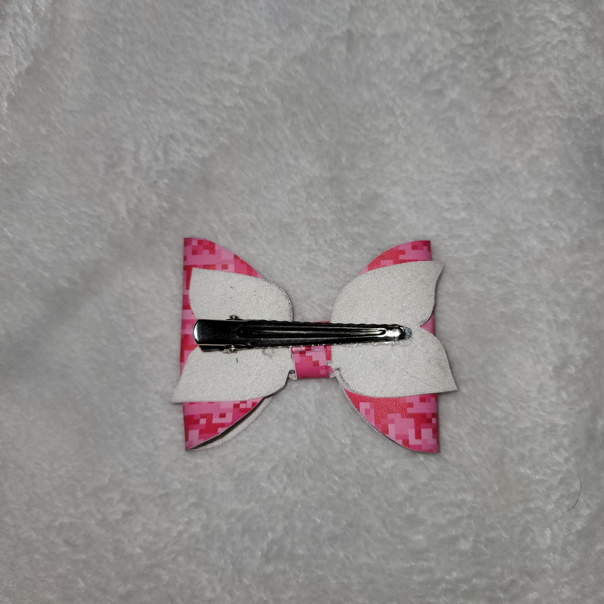 Pink camo faux leather secured on an alligator clip. Medium sized bow.
