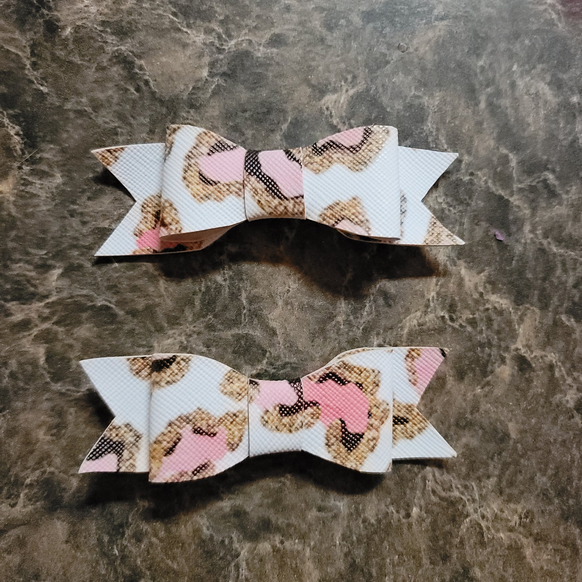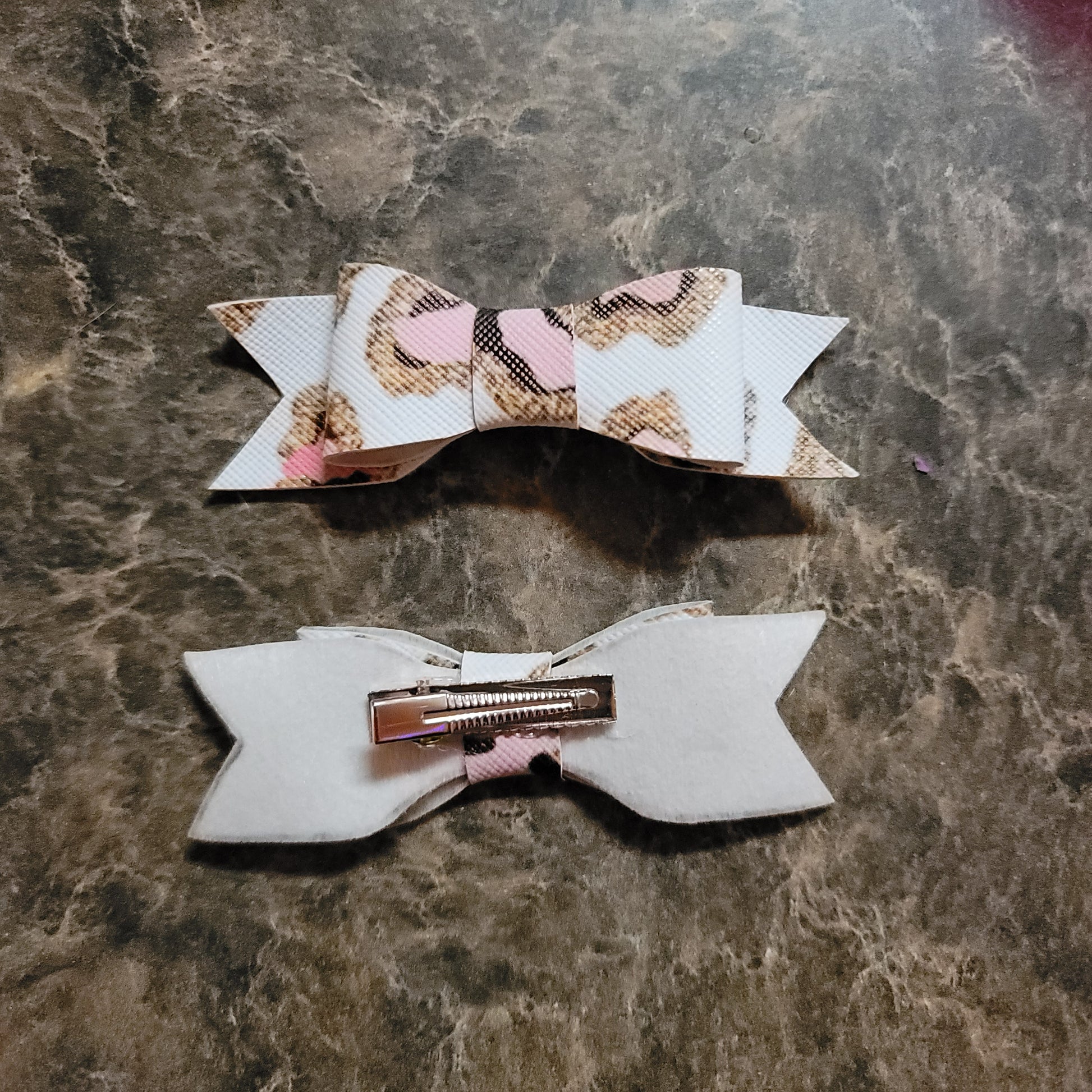 Pink and gold cheetah print faux leather. Small bow set secured on alligator clips.