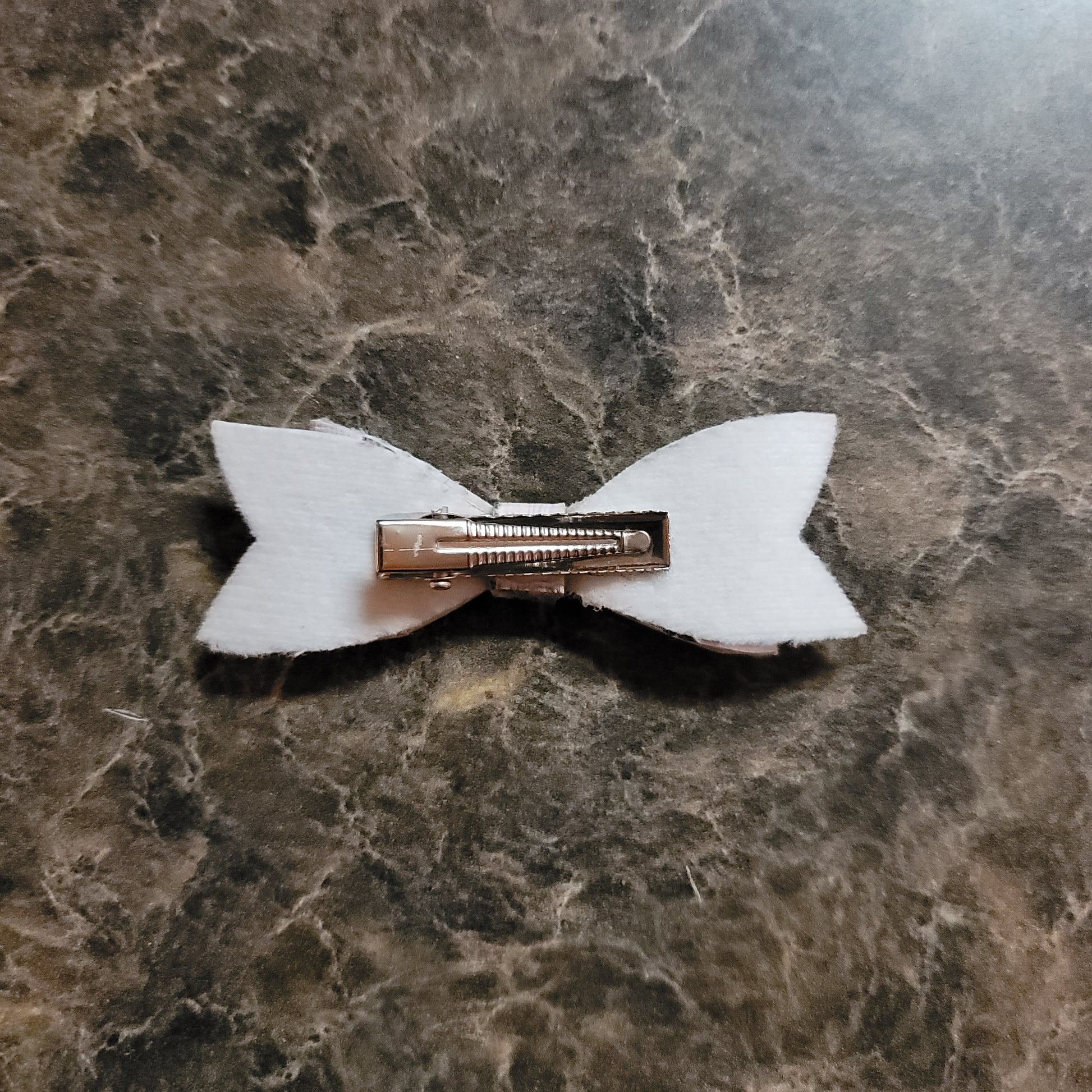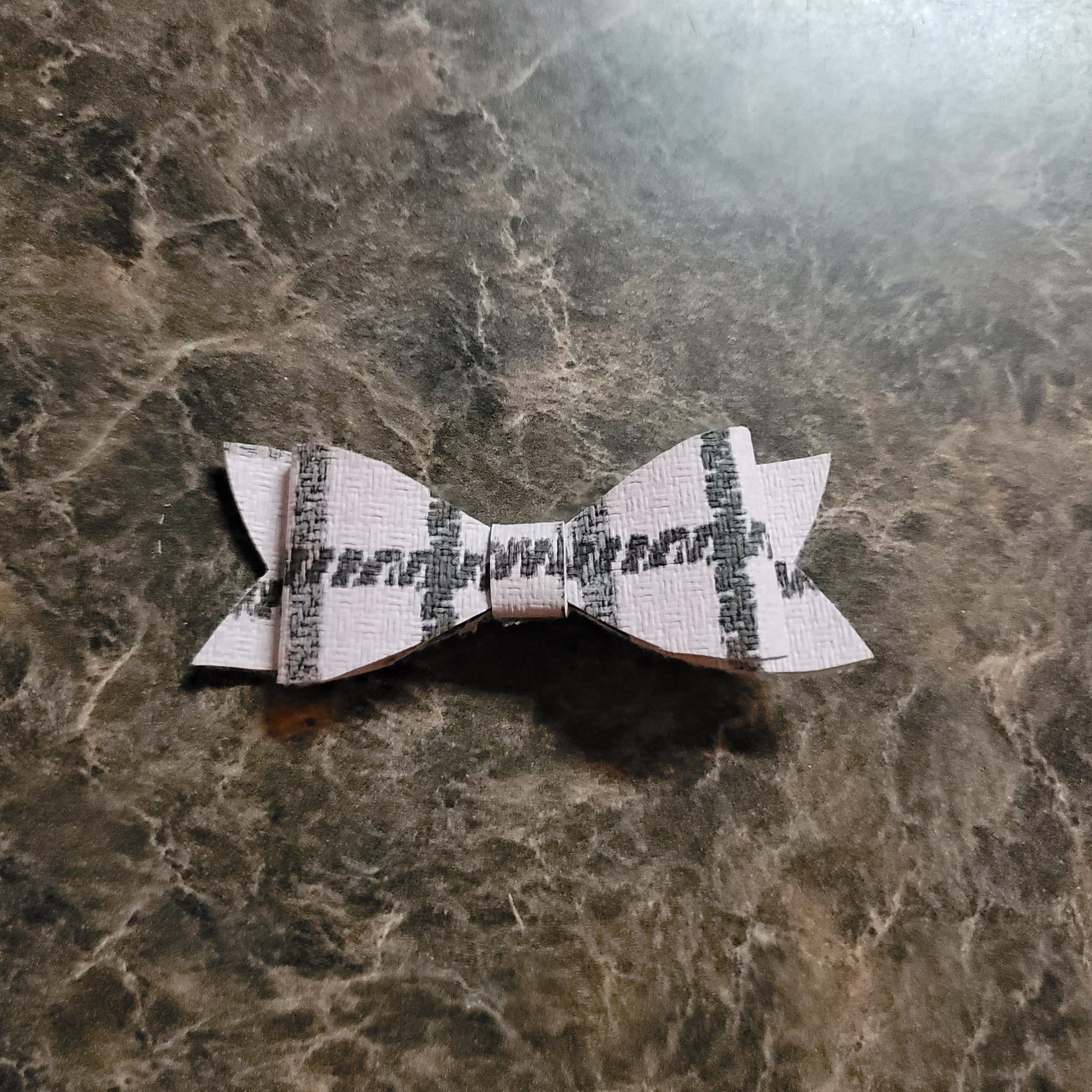 Pink and gray plaid faux leather. Small bow secured on an alligator clip.