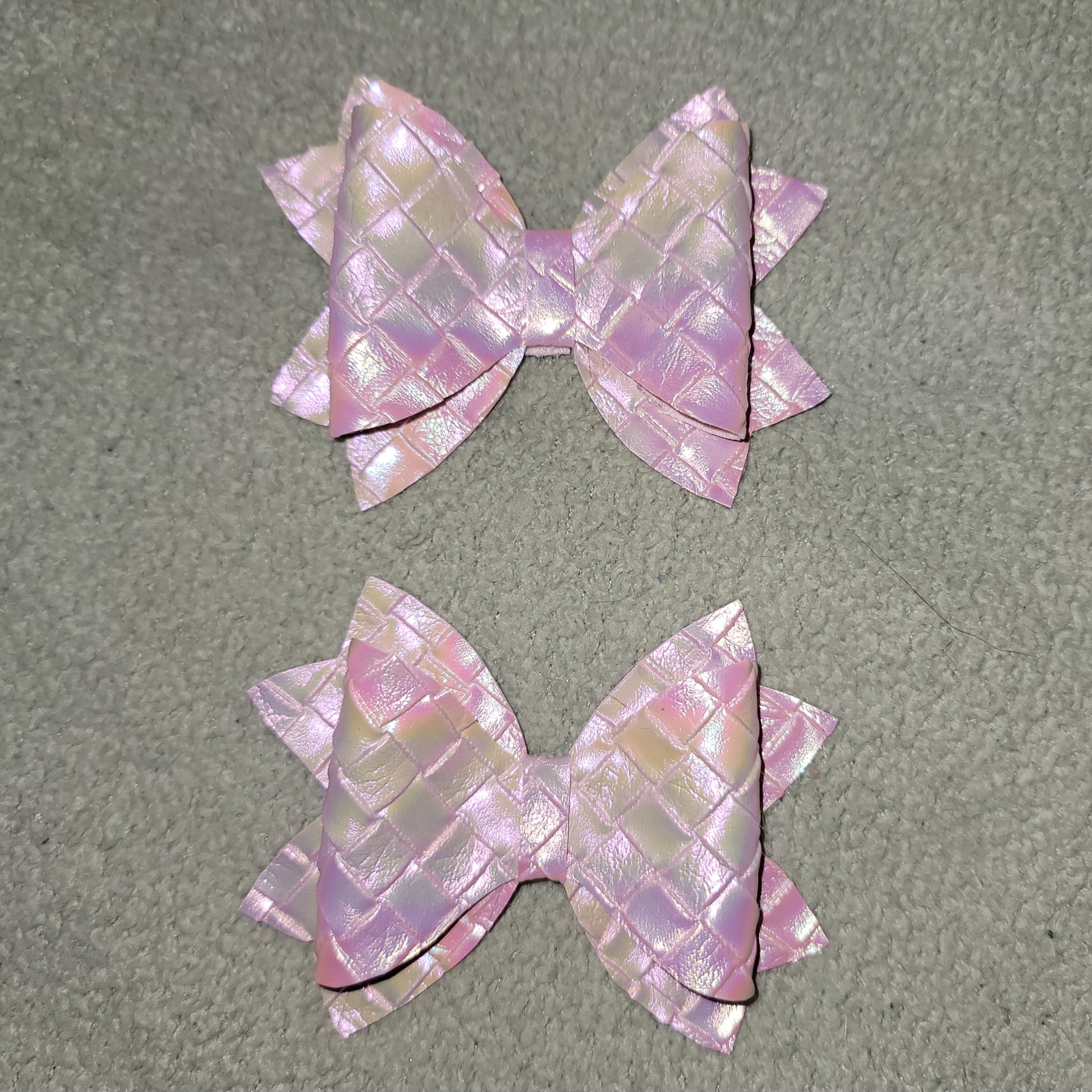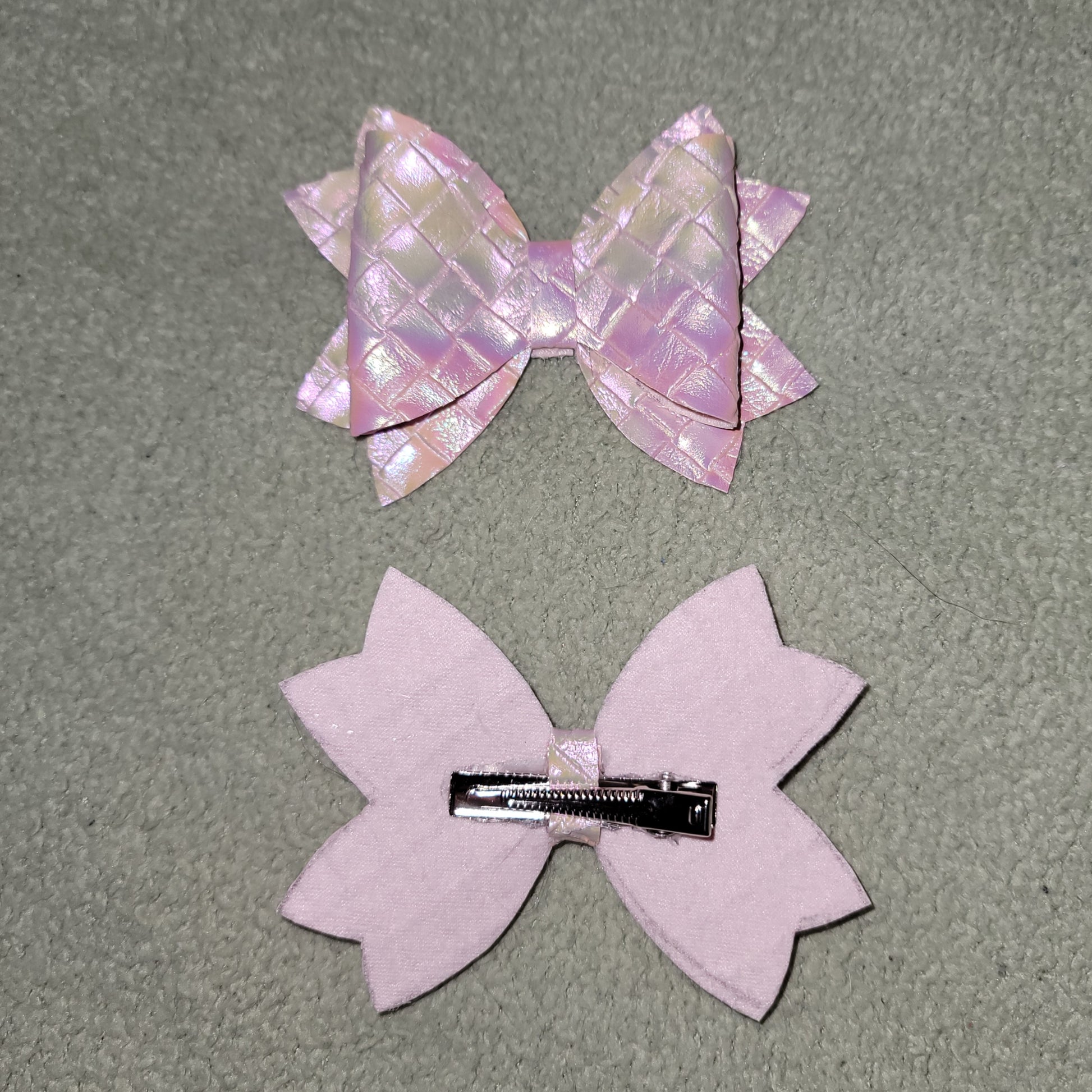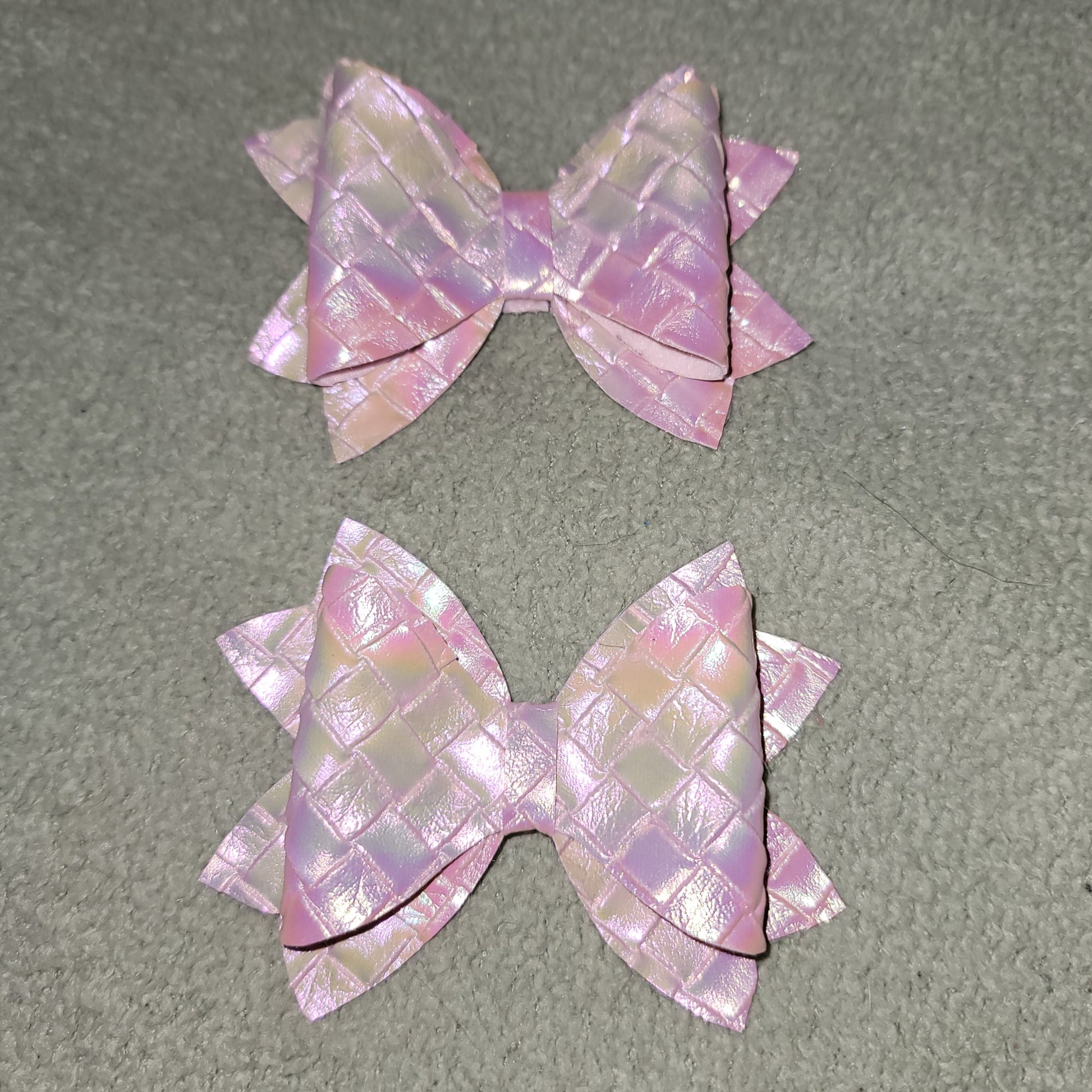 Pink iridescent textured soft faux leather. Medium bows secured on alligator clips.