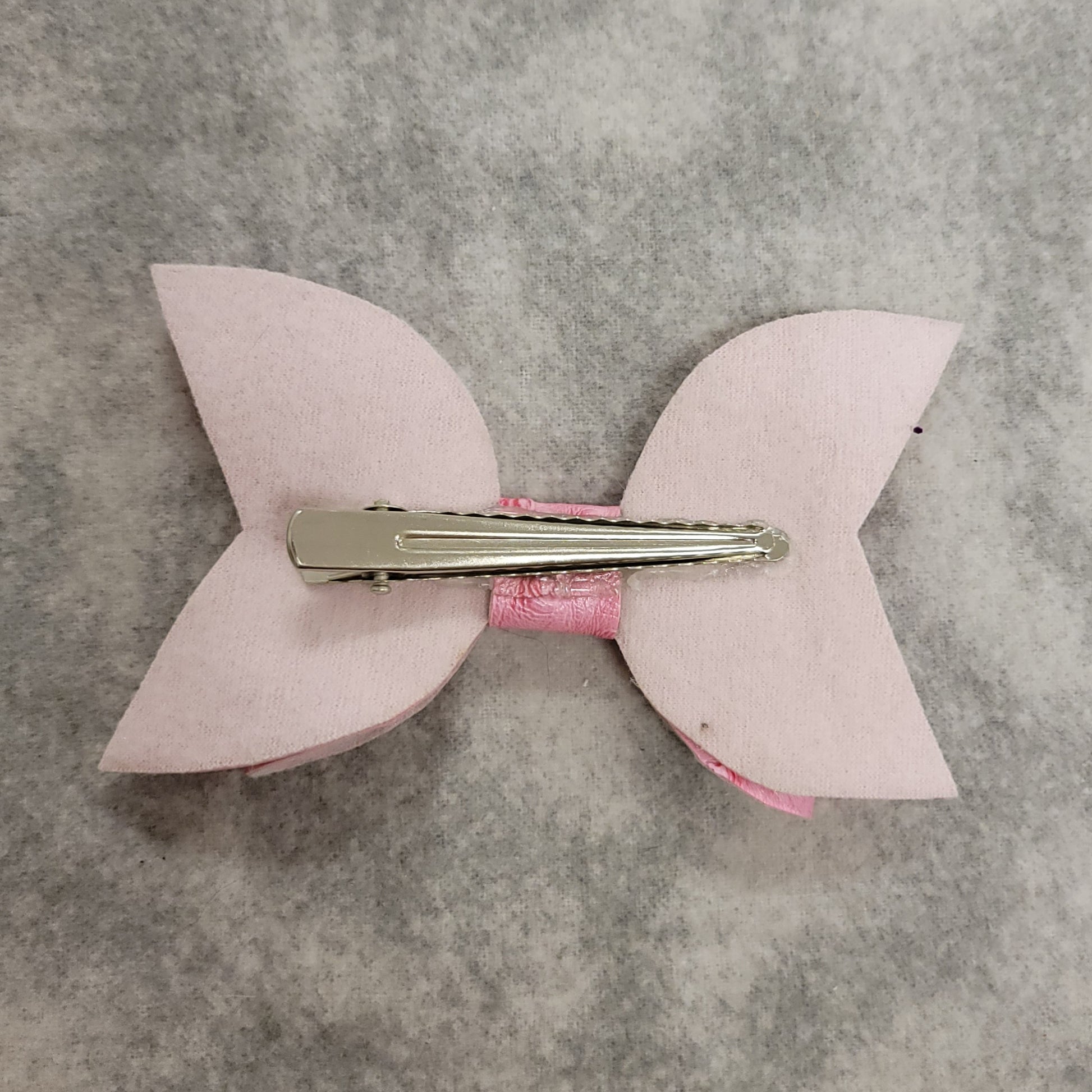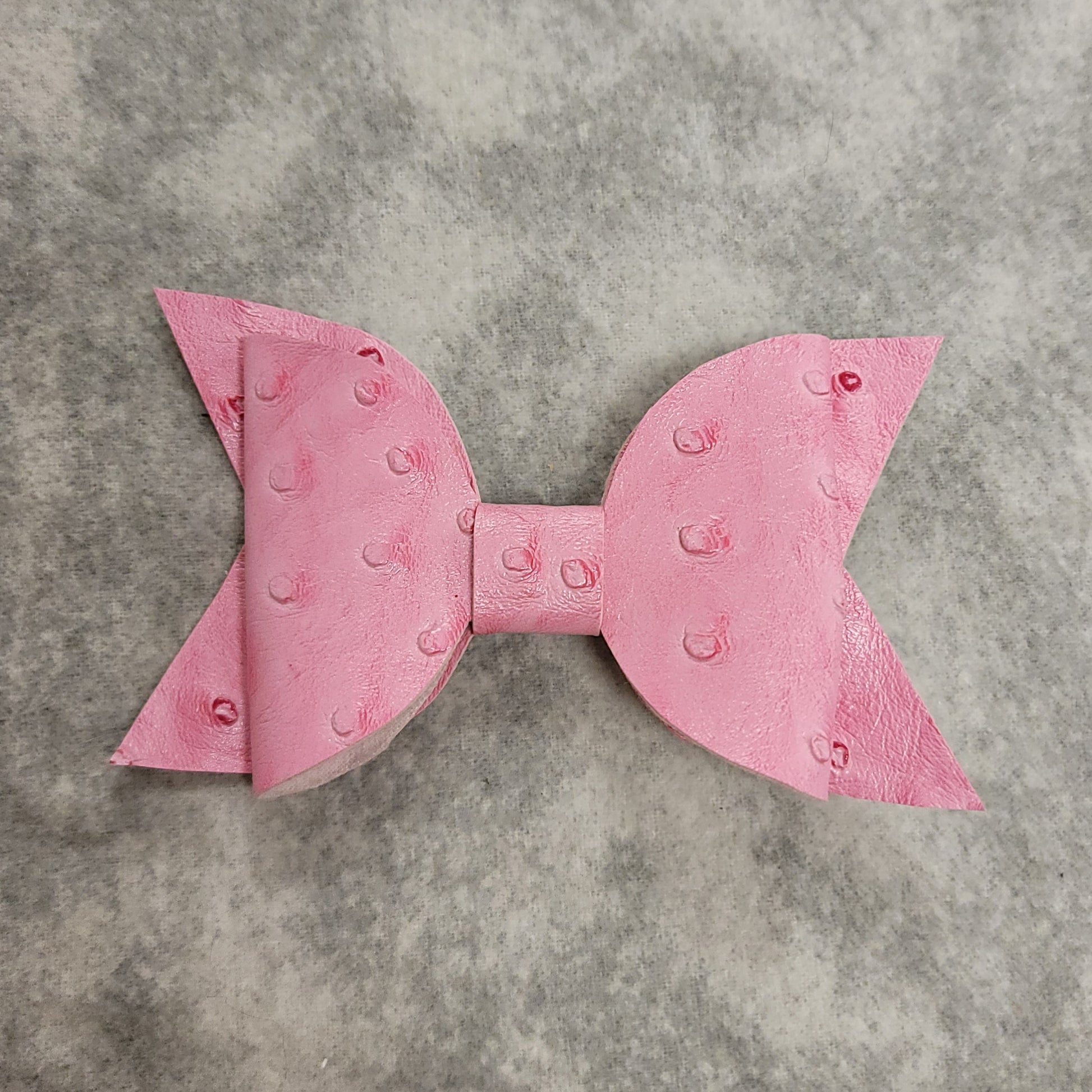 Pink ostrich print faux leather. Single stack bow secured on an alligator clip.