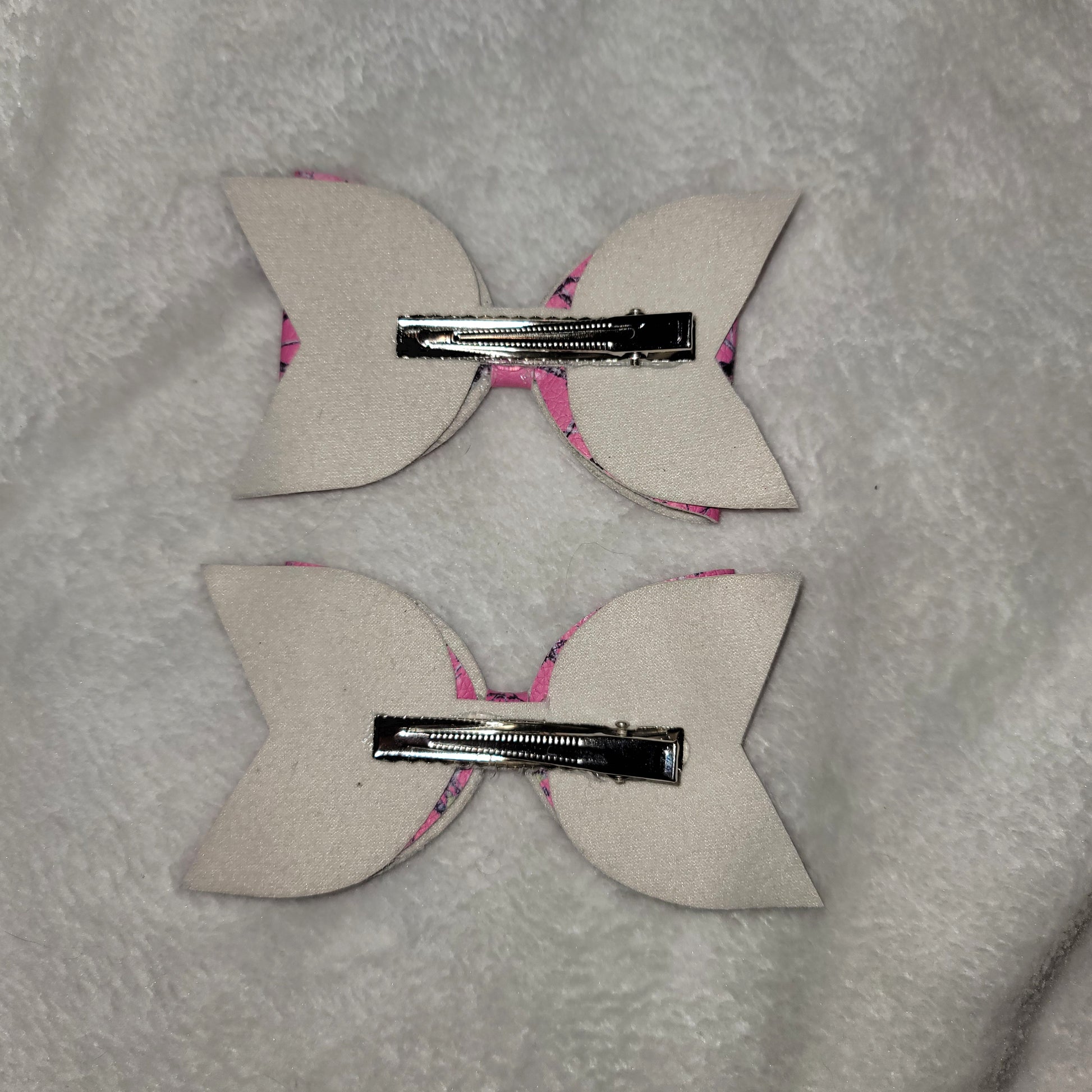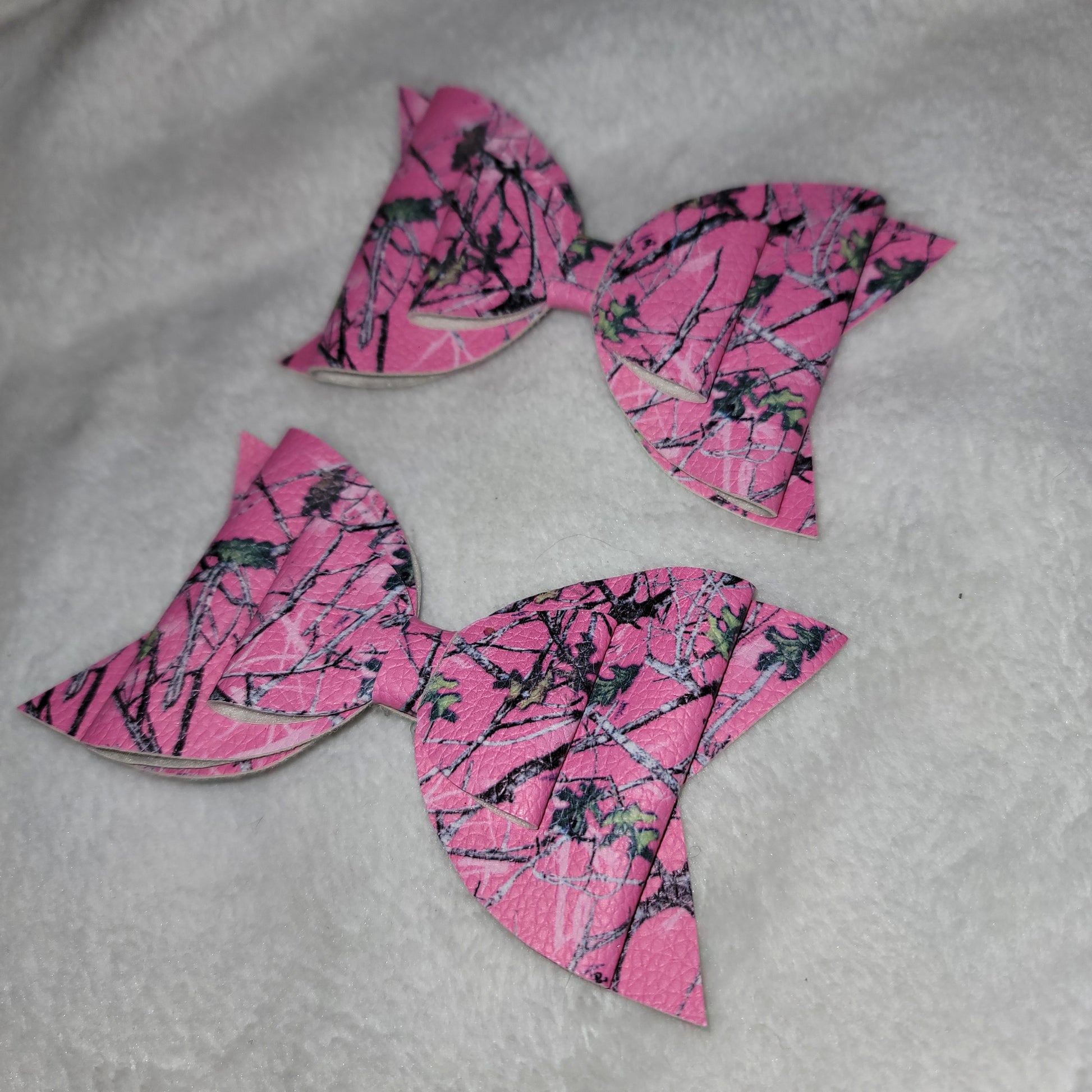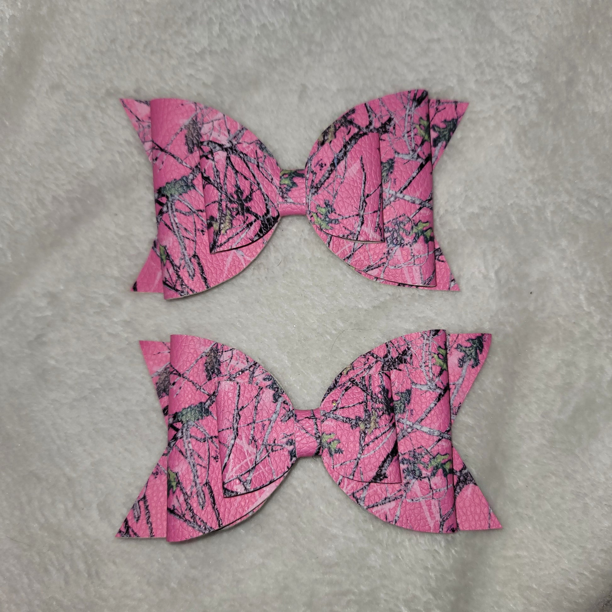 Pink tree camo print faux leather, large double stack bow secured on an alligator clip.