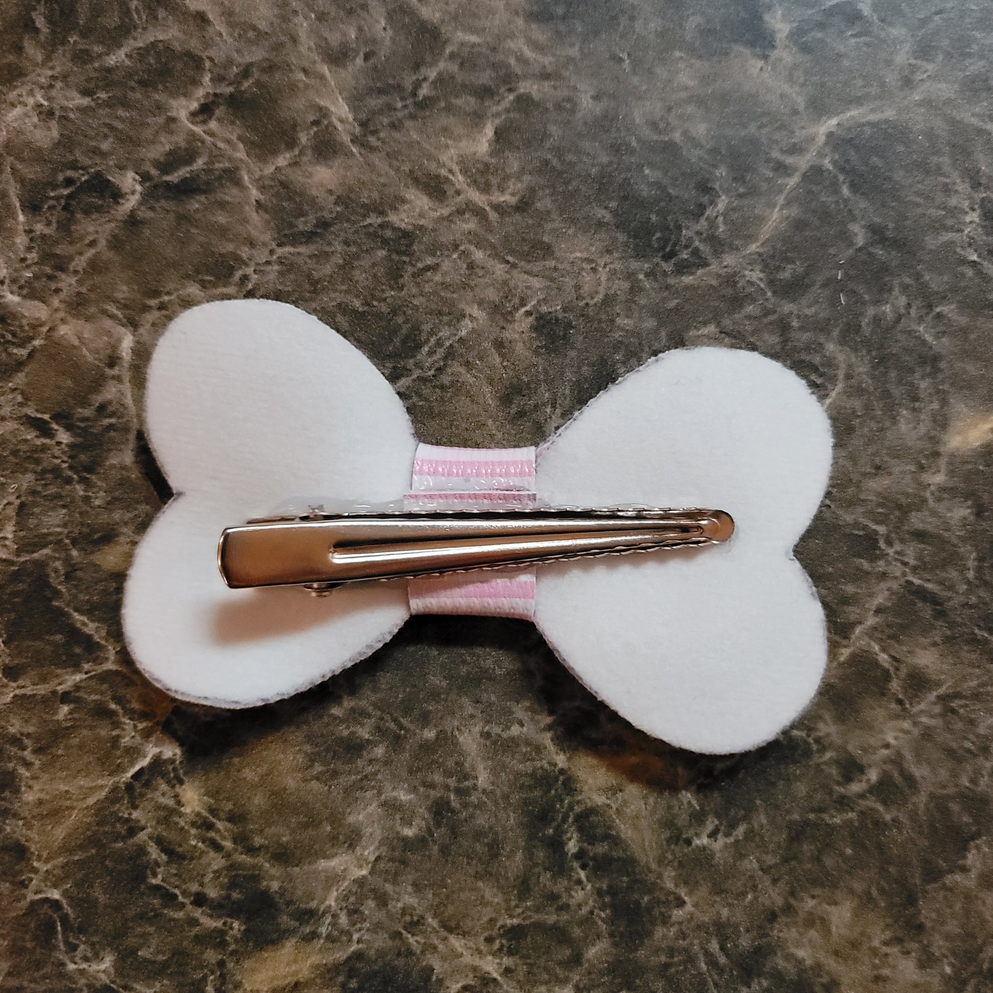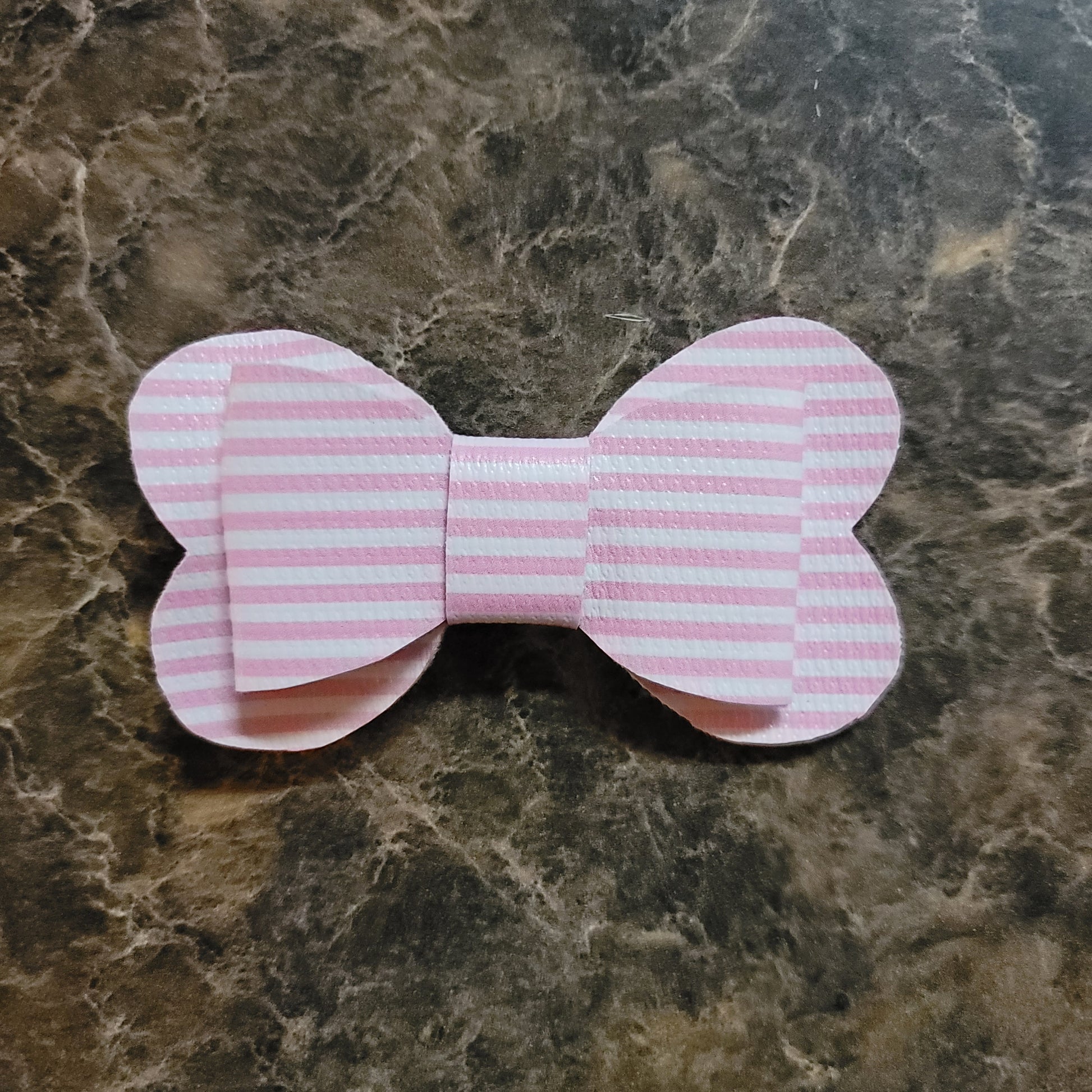 Pink & white stripe faux leather. Bow secured on an alligator clip.