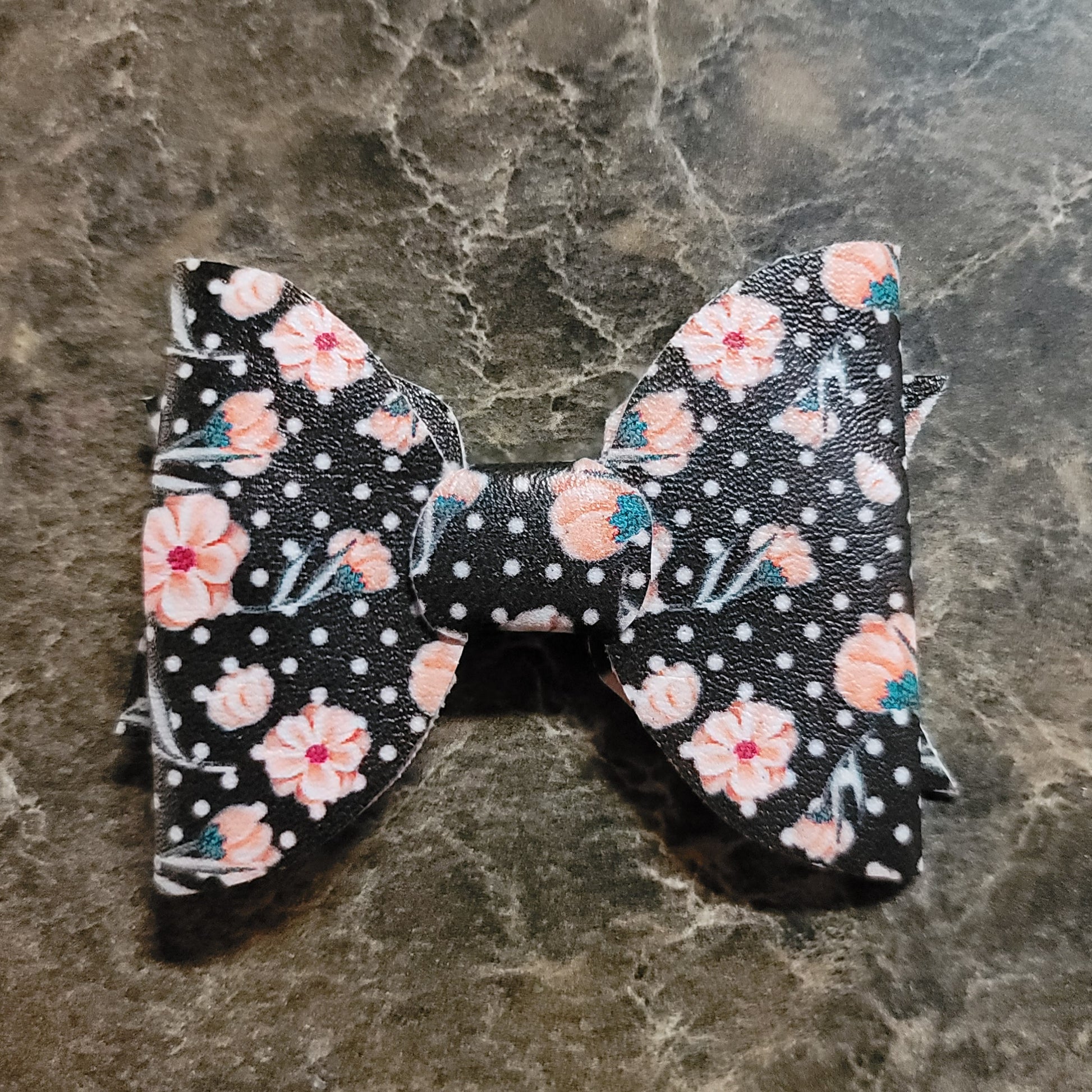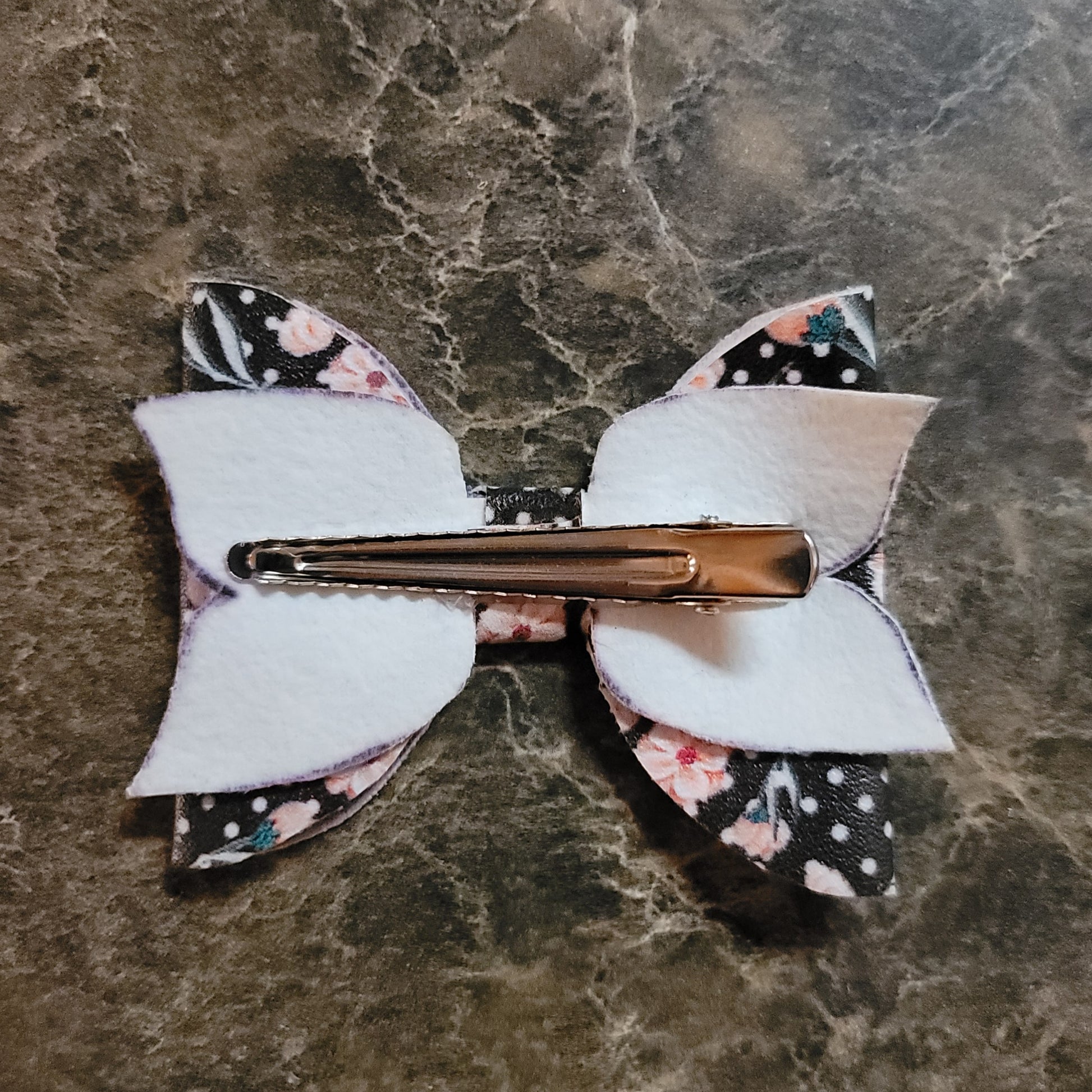 Black & white polka dots with flowers soft faux leather. Medium bow secured on an alligator clip.
