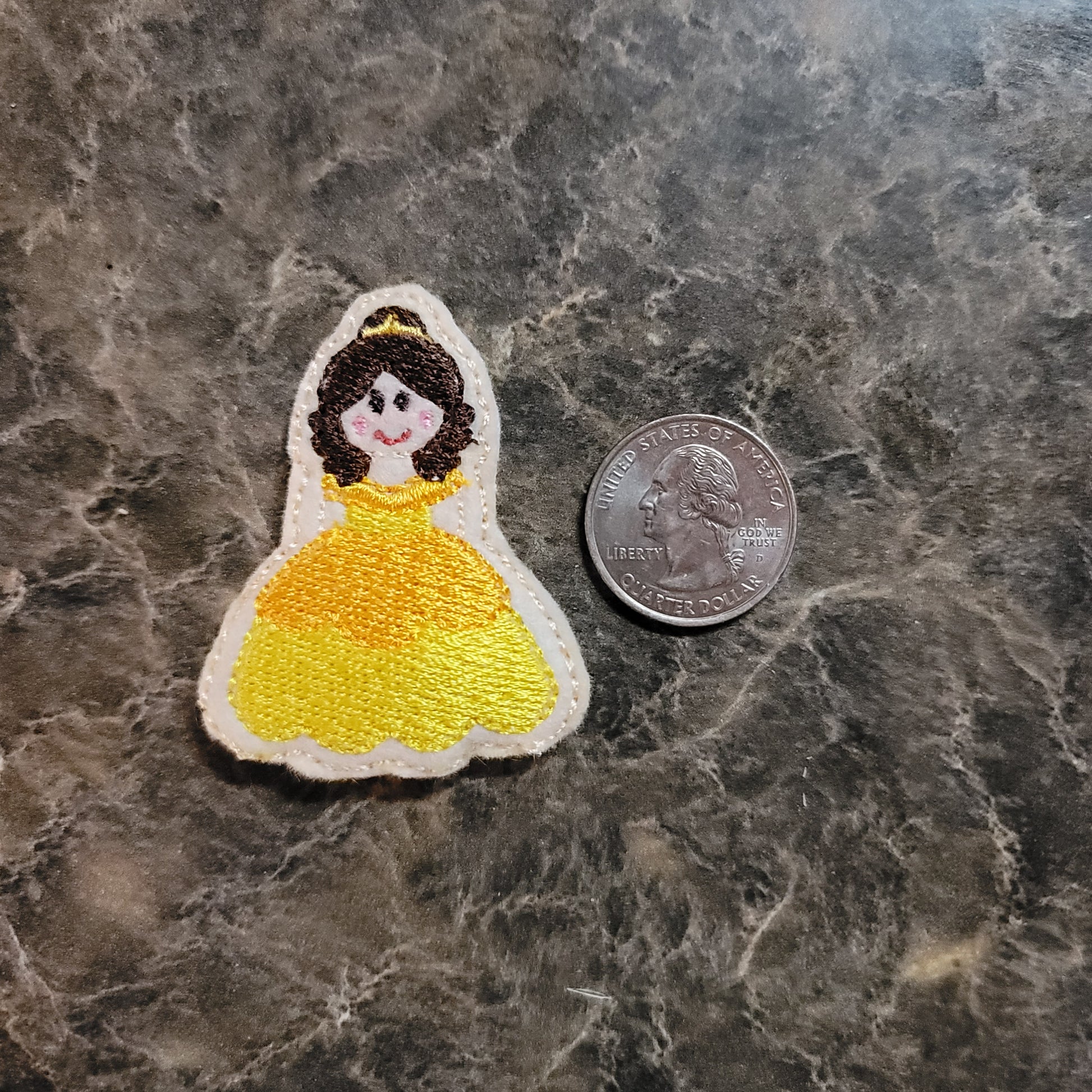 Embroidered princess Belle feltie secured on a 1.2 inch snap clip.