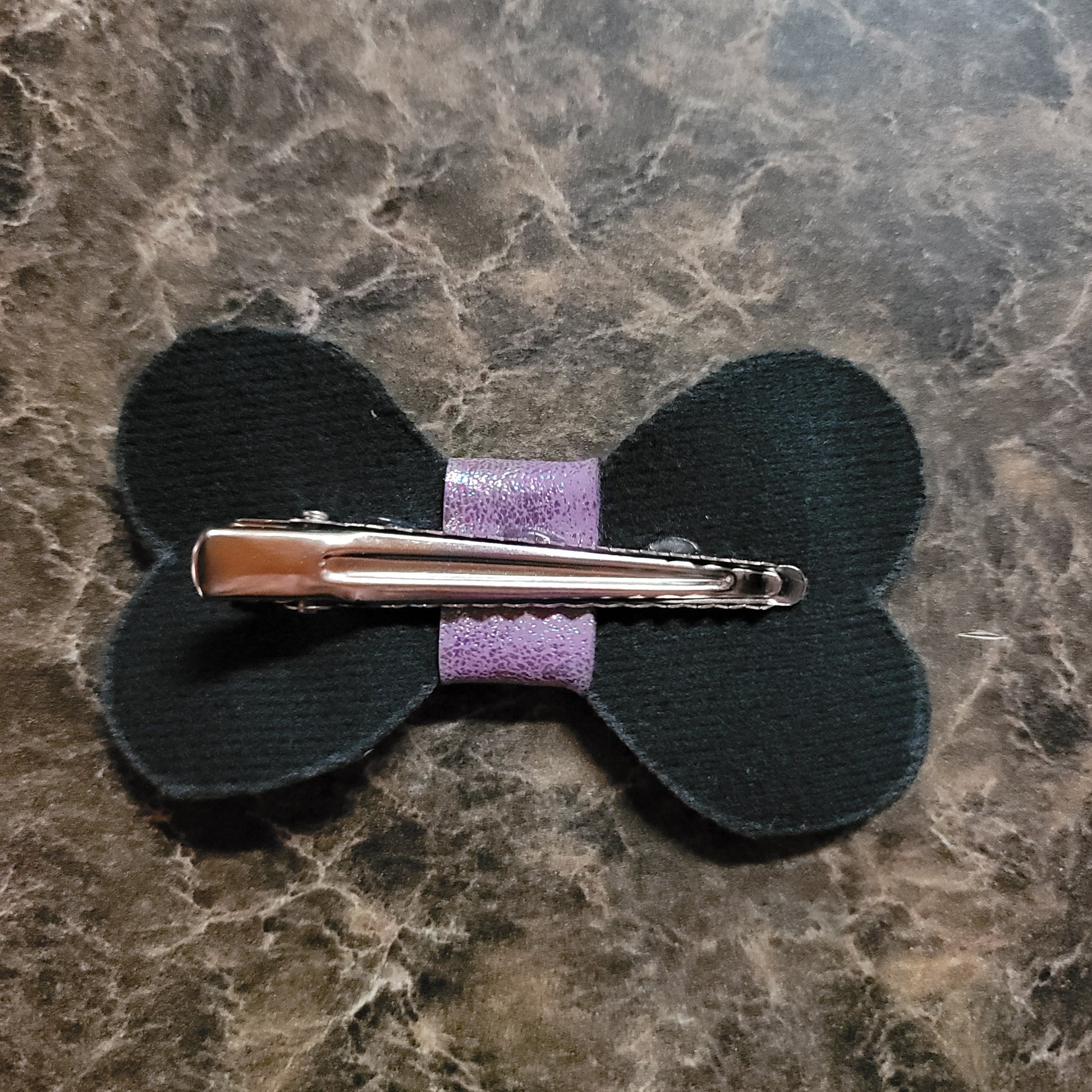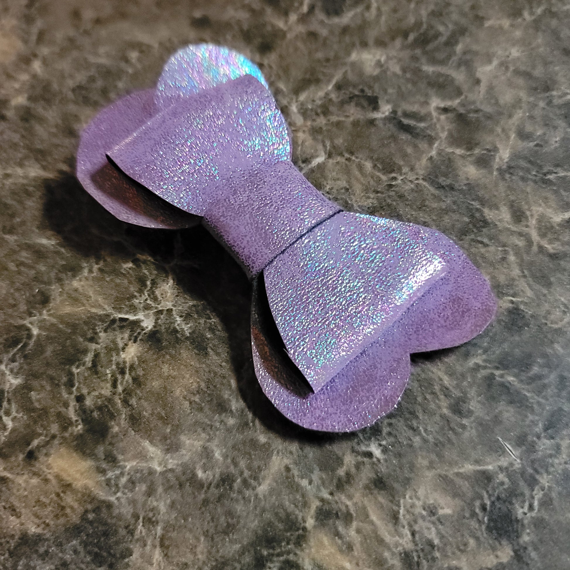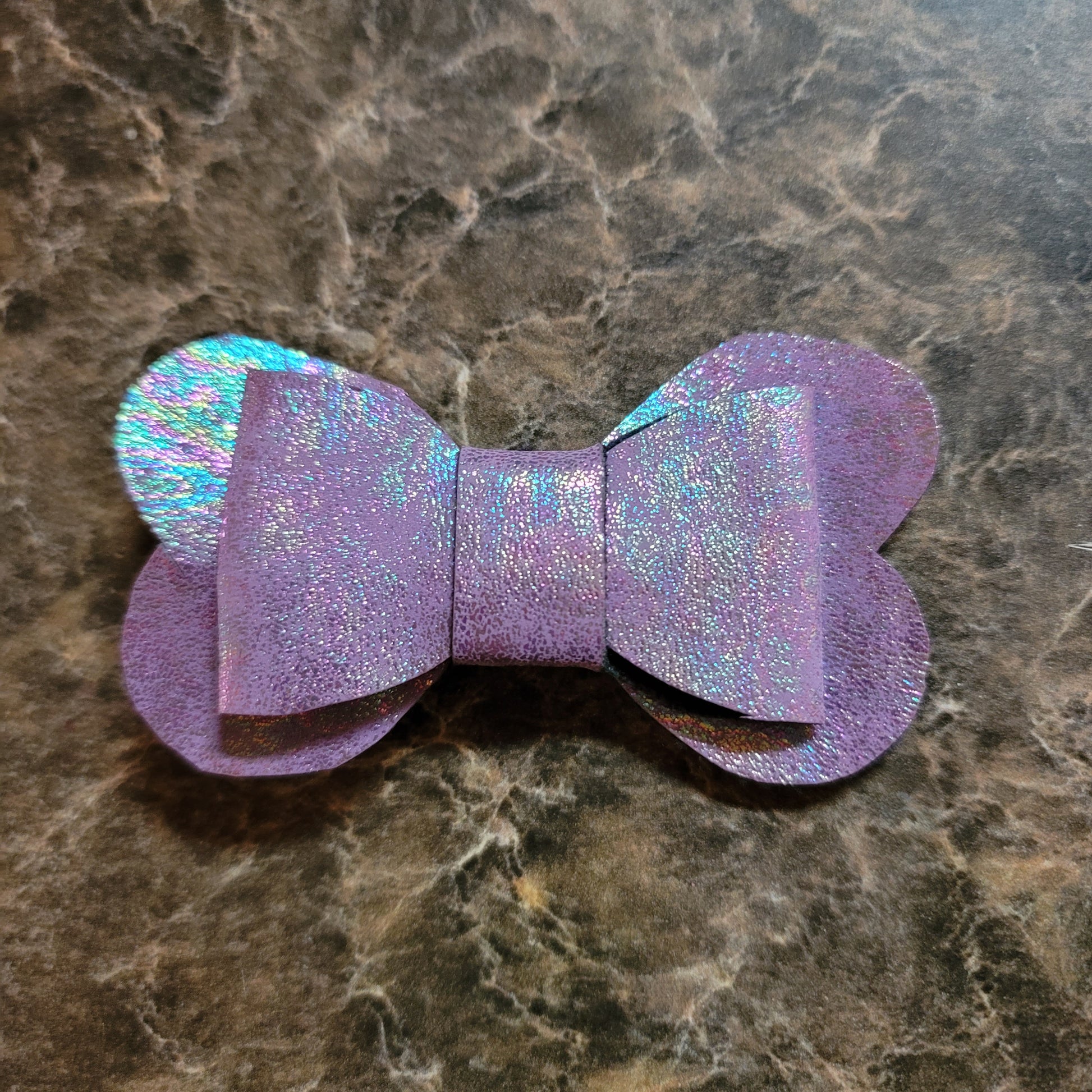 Purple color shifting faux leather. Bow secured on an alligator clip.