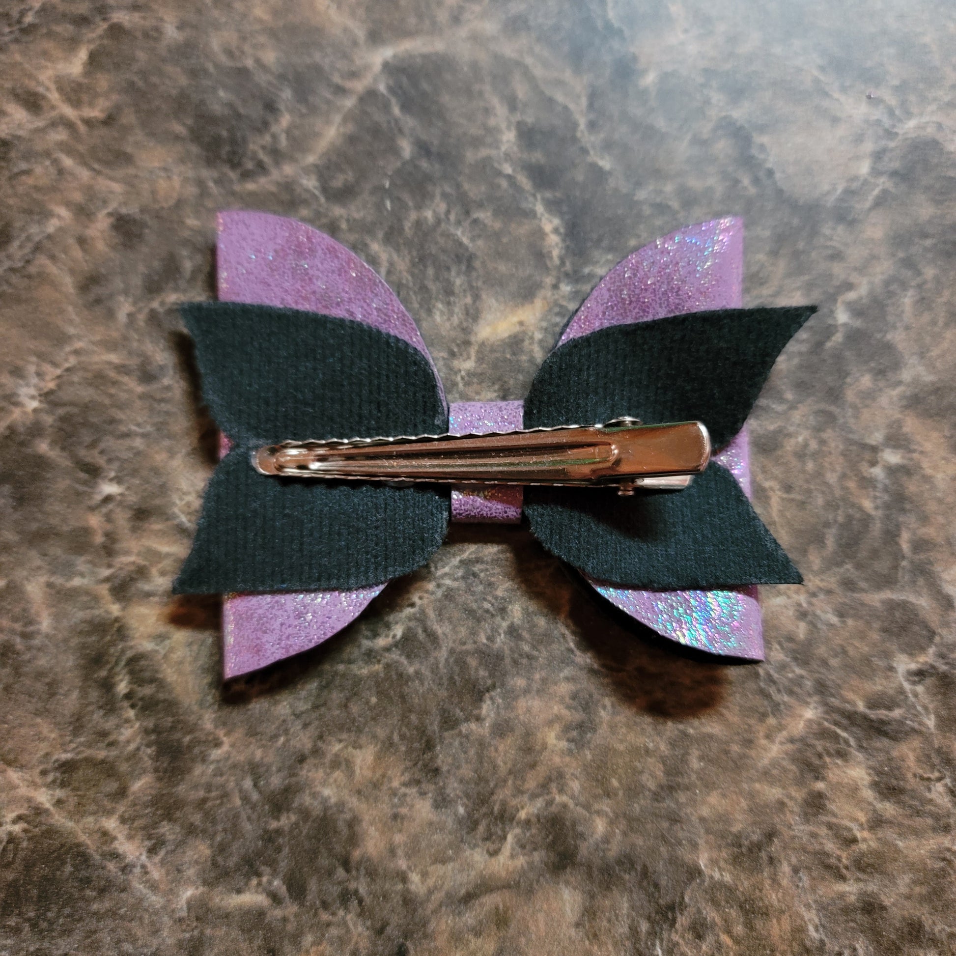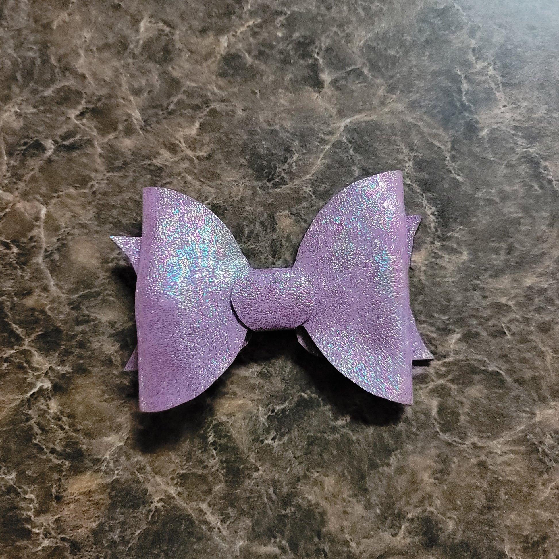 Purple color shifting soft faux leather. Medium bow secured on an alligator clip.